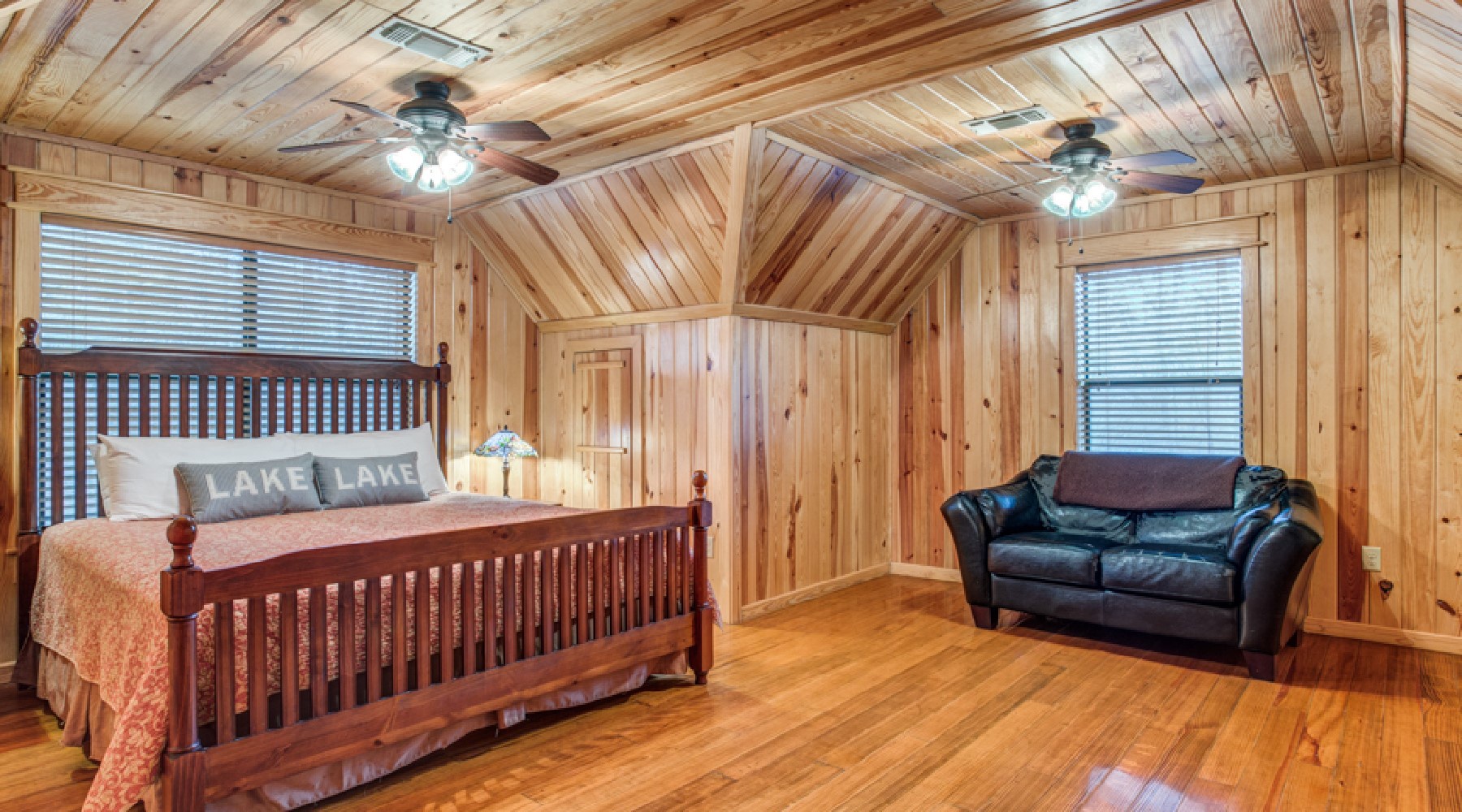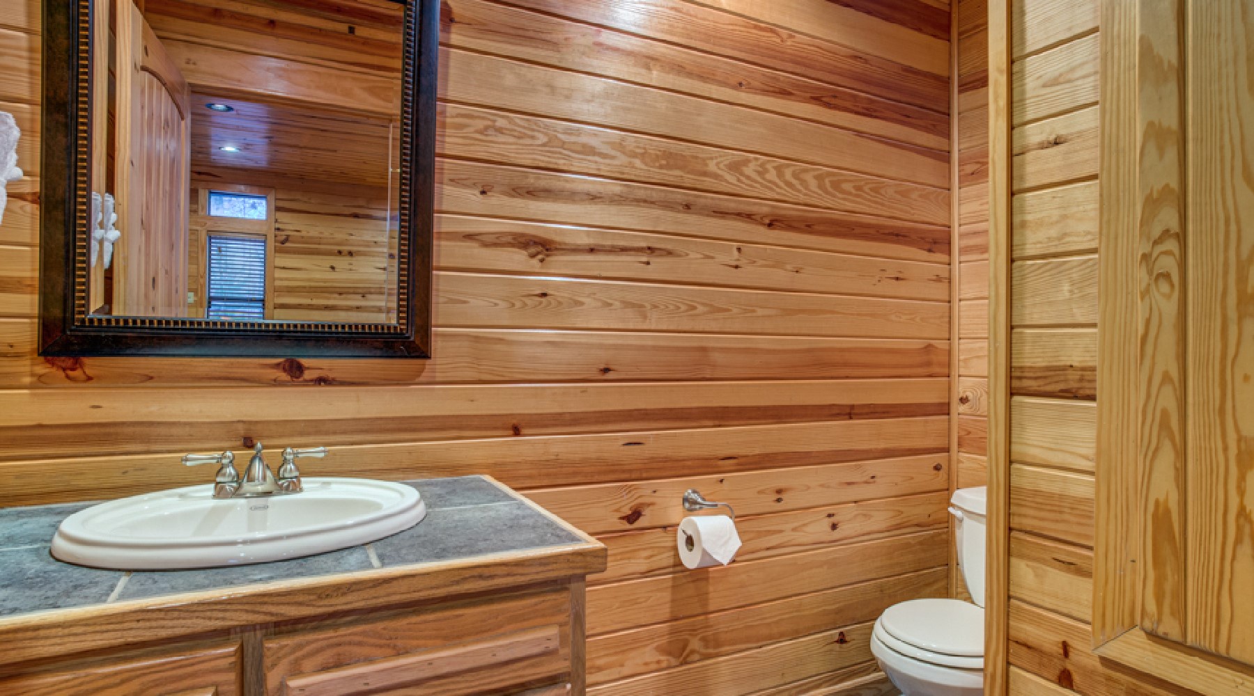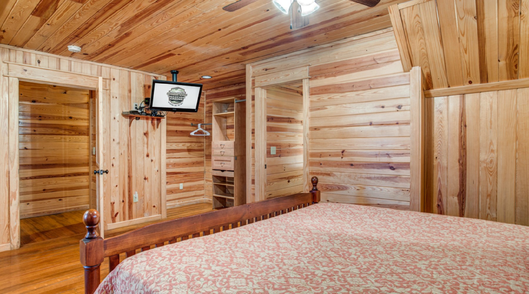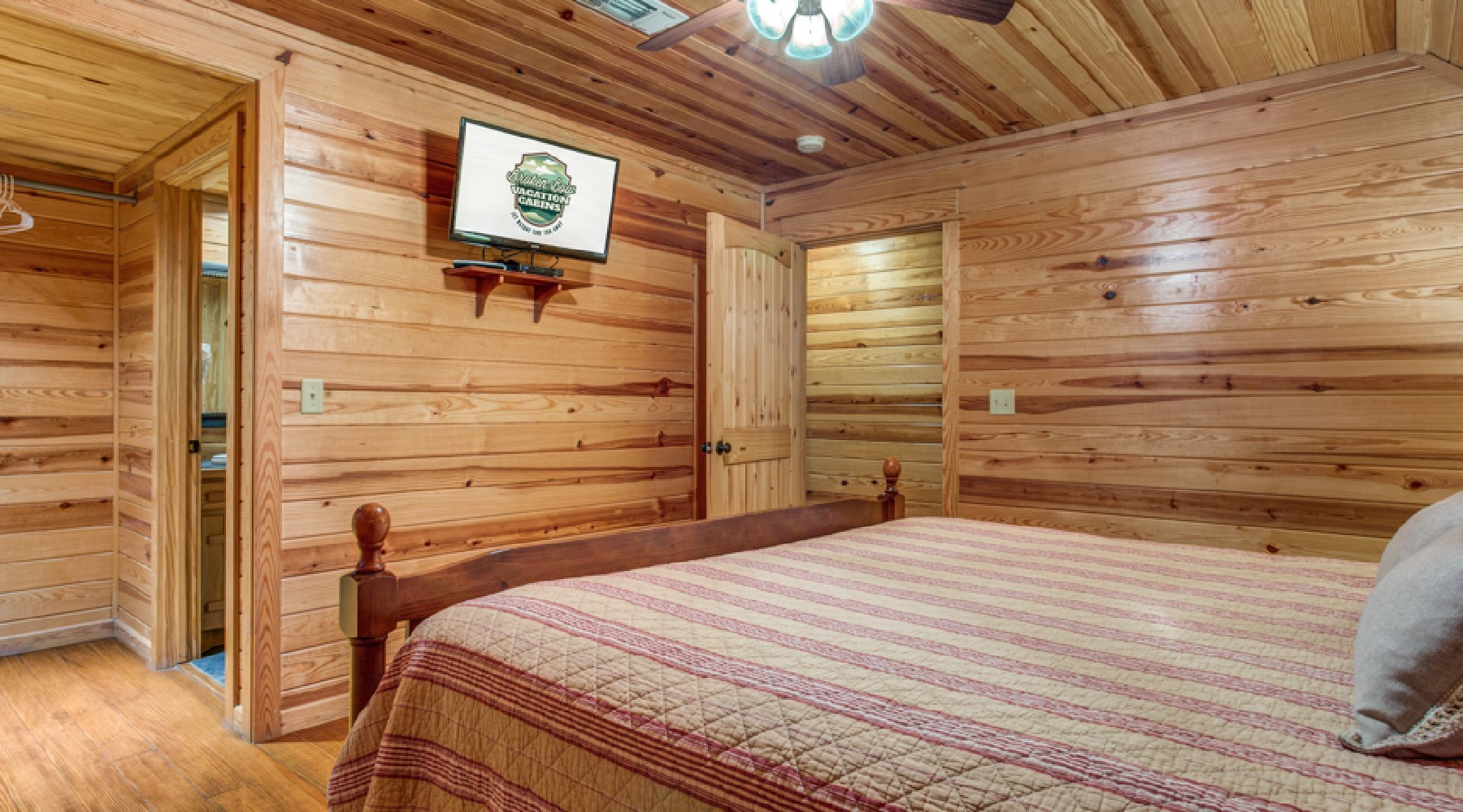 Always Shady cabin is designed for two couples to enjoy with lots of space and privacy. The two bedrooms are upstairs and each have king size beds, HDTVs and private, attached baths, there is also a half-bath downstairs.