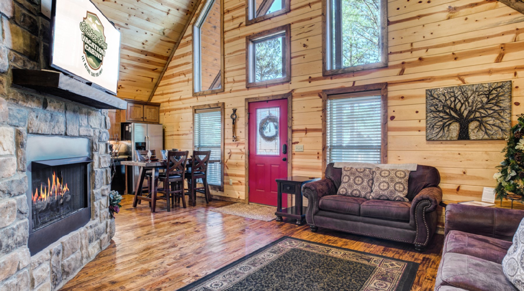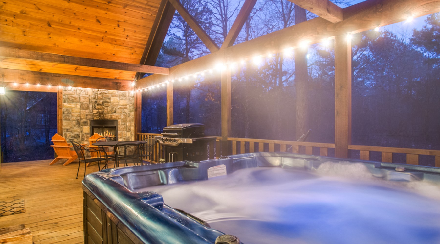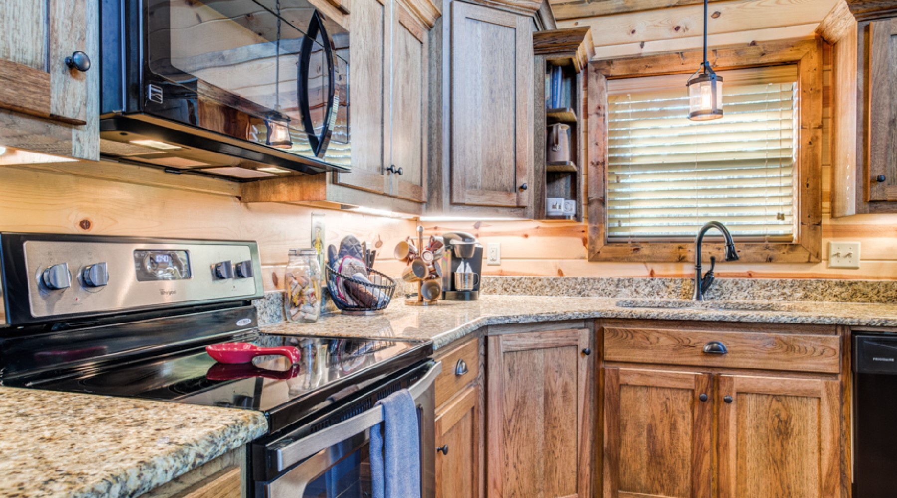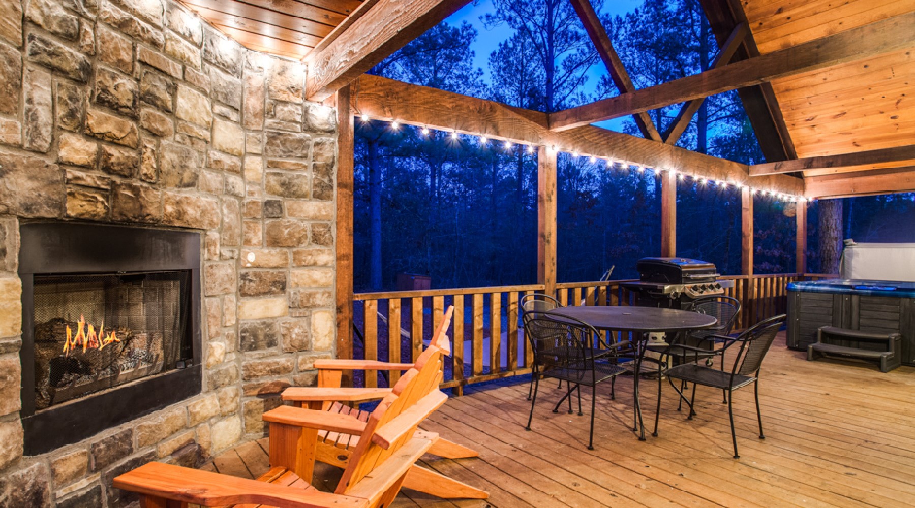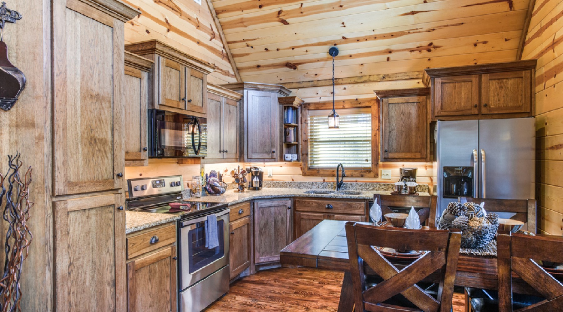 The living area features a large screen television over a stone fireplace. There is a sofa and loveseat to bask in front of the roaring fire. The kitchen features stainless appliances and granite countertops. You can relax outside on the custom cedar Adirondack chairs in front of the gas burning fireplace (seasonal October 15th – April 15th), or a quiet evening in the hot tub while enjoying the fireplace as well.
