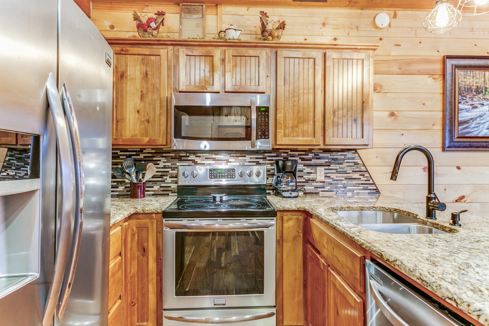 - Fully stocked kitchen with electric range, stove, dishwasher