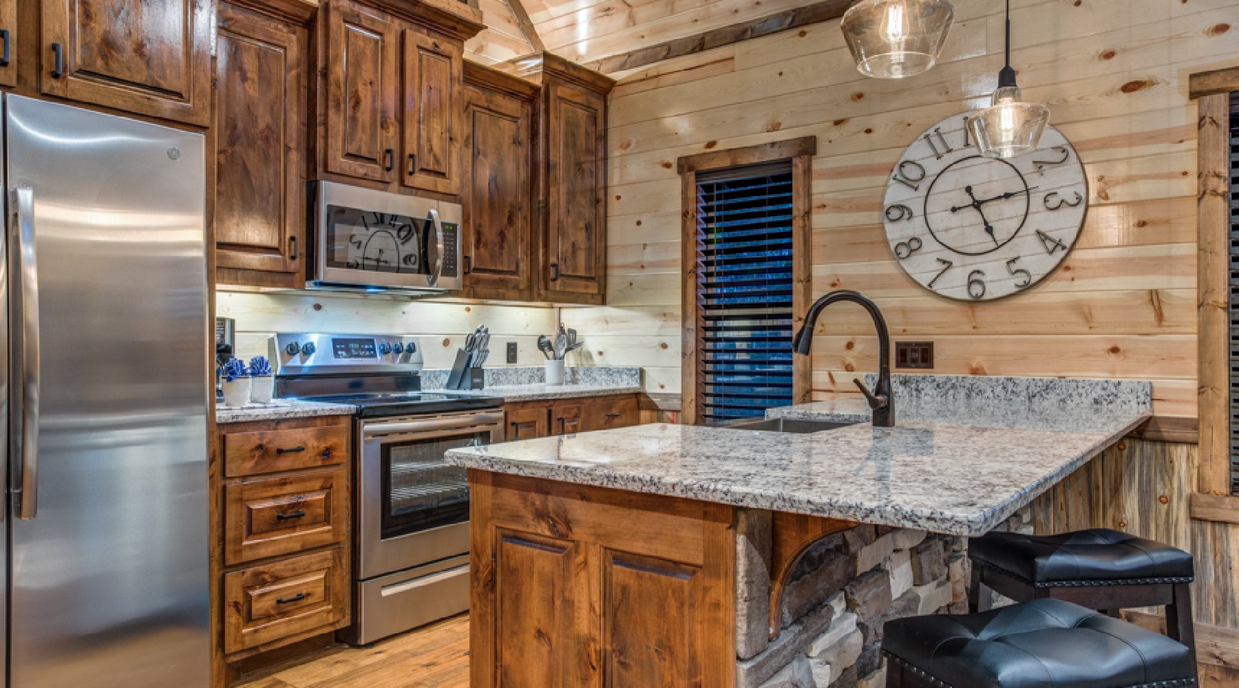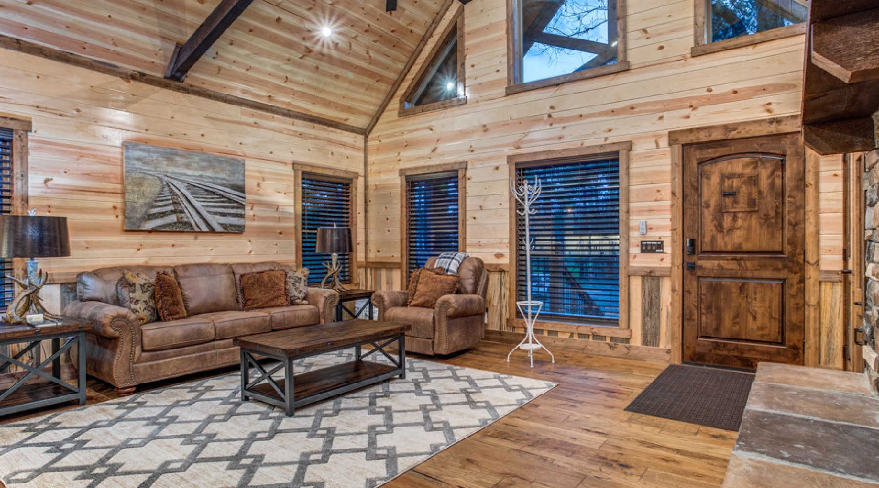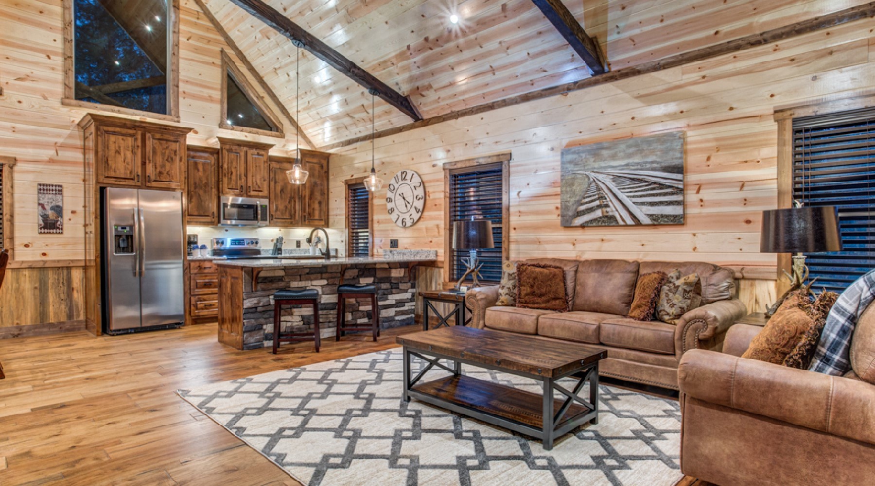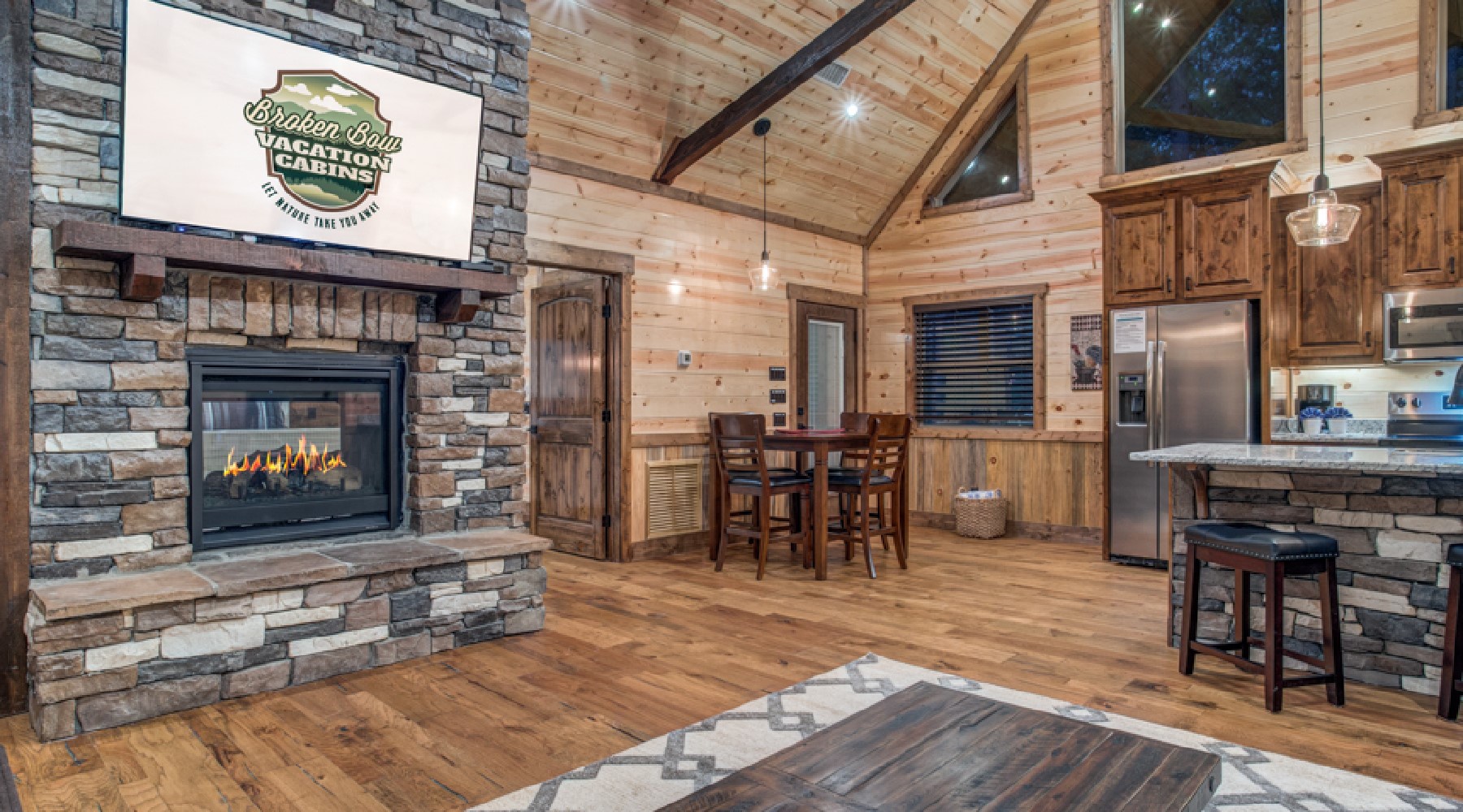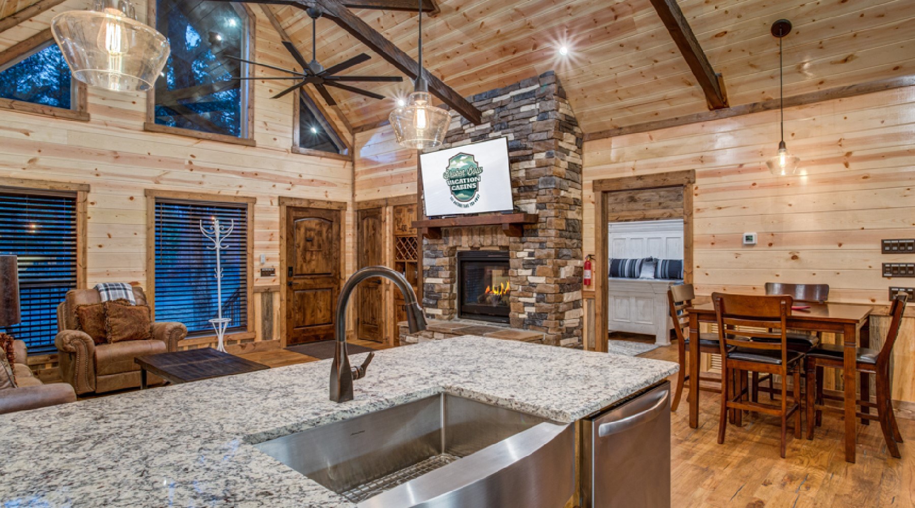 Enter into the welcoming atmosphere of the large living room and kitchen common area. The living room has leather recliner seating and sofa that converts to queen sleeper in front of a double view gas fireplace with timer switch (seasonal October 15th – April 15th). An HDTV with DirecTV package (PPV not available) is mounted on the stacked rock hearth. There is a DVD player for watching programs you bring with you.