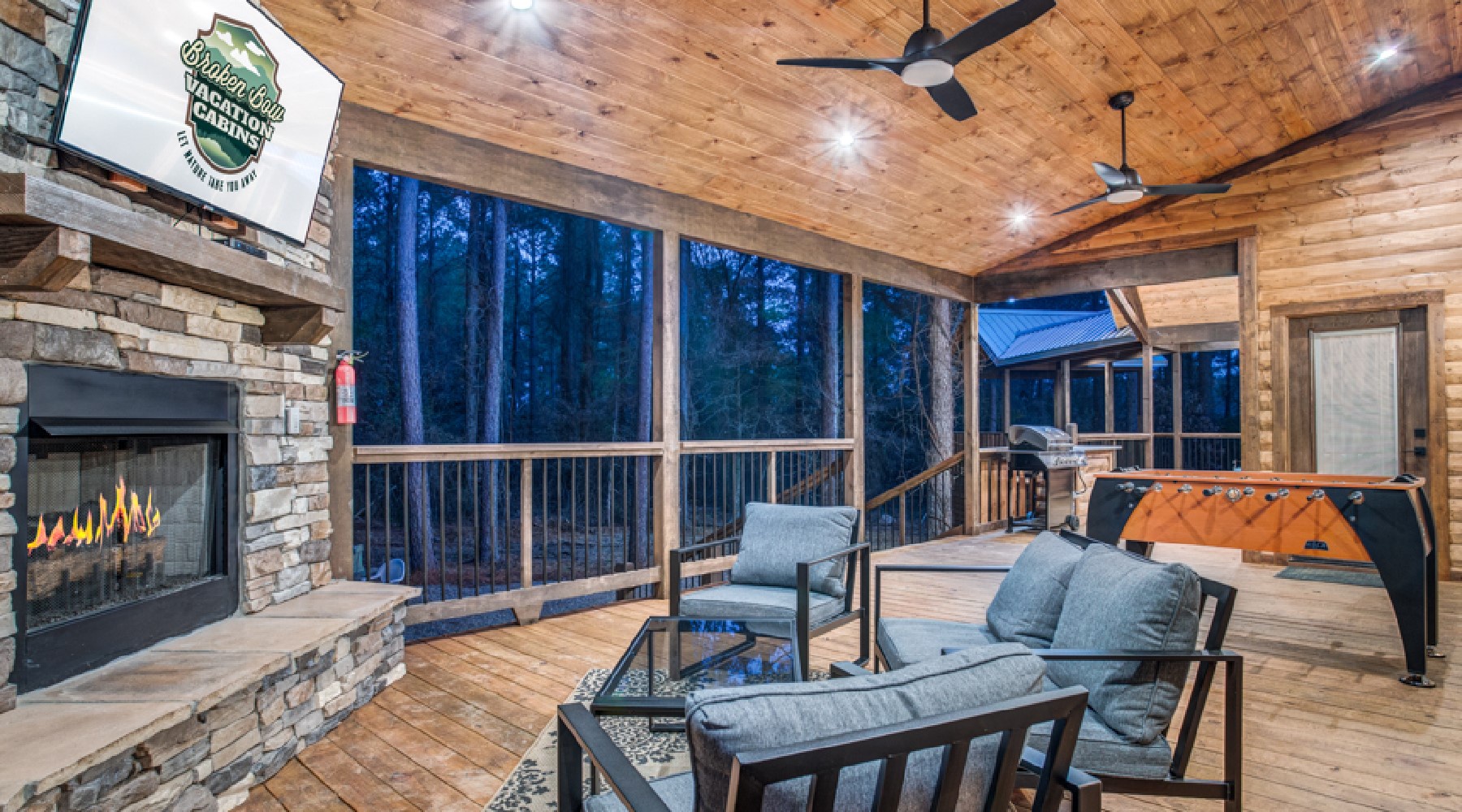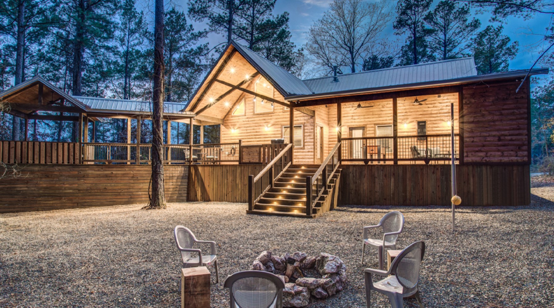 The outside area offers seating in front of the gas burning fireplace (seasonal October 15th – April 15th) with an HDTV mounted above. The hot tub (drained and sanitized after each reservation) is available via a covered deck. The grill (propane provided) sits by granite top counter for cooking convenience. The deck has a seating area and a table and chairs for 2. In the outside area sit around the open fire pit making memories while roasting marshmallows under the starry sky. There is a circle gravel drive for bringing your boat with you.
