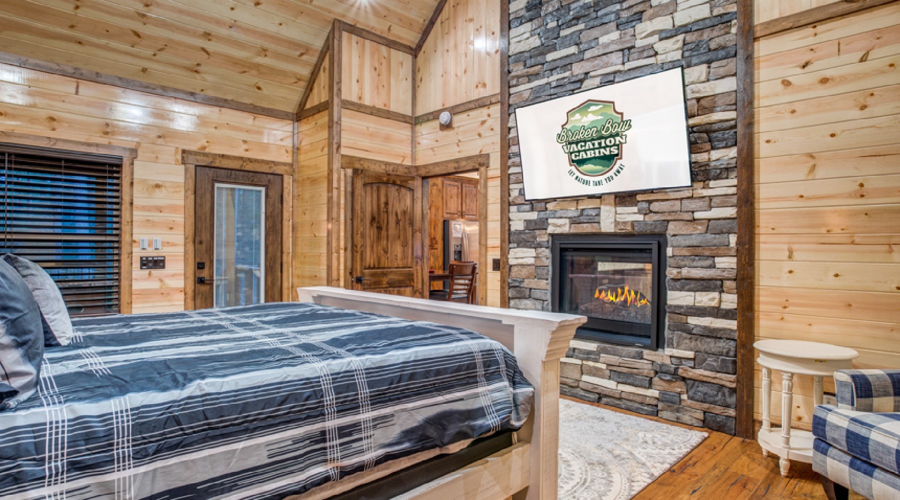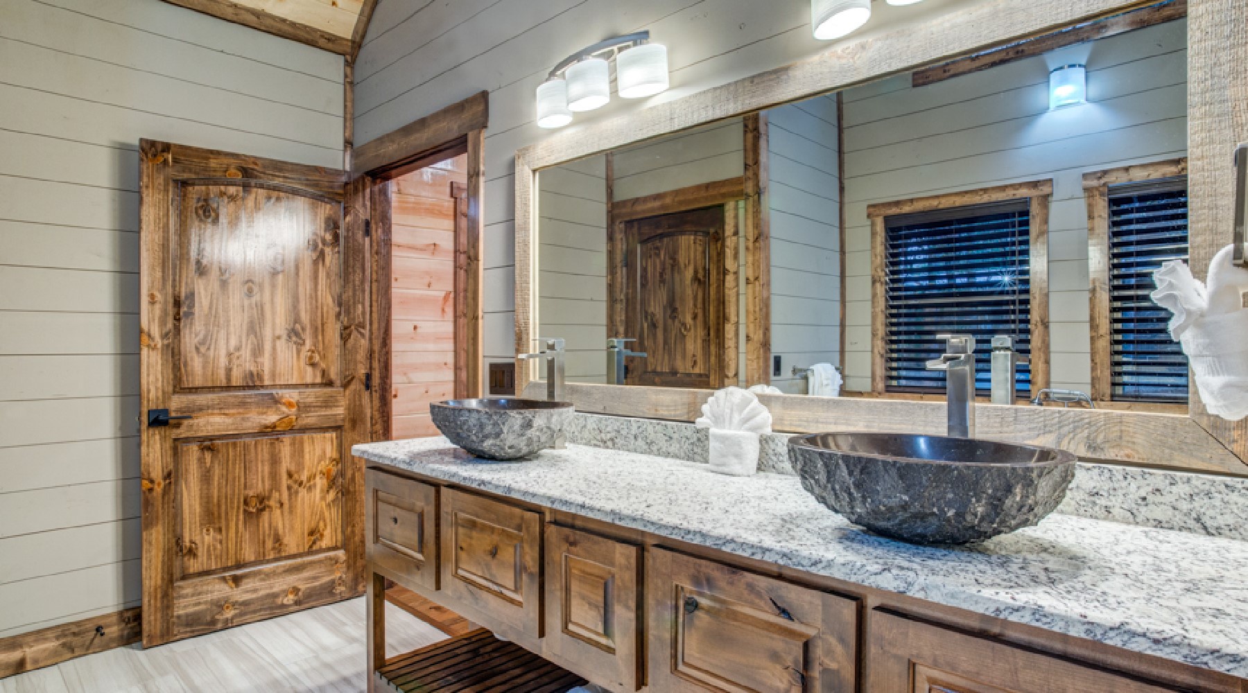 The bedroom has a large rustic wood bed with a king size mattress wrapped in luxury linens. Enjoy the double view fireplace from the bedroom with a second timer switch. There is an HDTV with Direct TV package (PPV not available) mounted on the bedroom side of the stack rock hearth. The bathroom is located off of the bedroom. The bathroom has double vanity granite countertops. The bathroom has a stand-alone soaking tub. The walk-in tiled shower has a rain head with hand shower on one side and a separate rain head on the opposite wall.