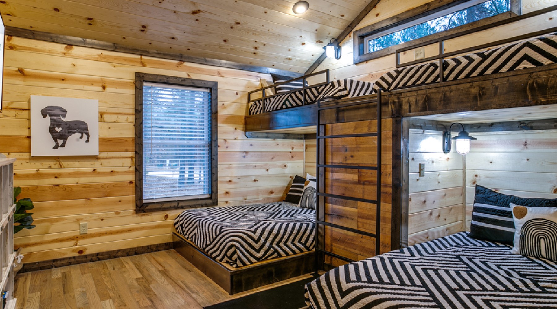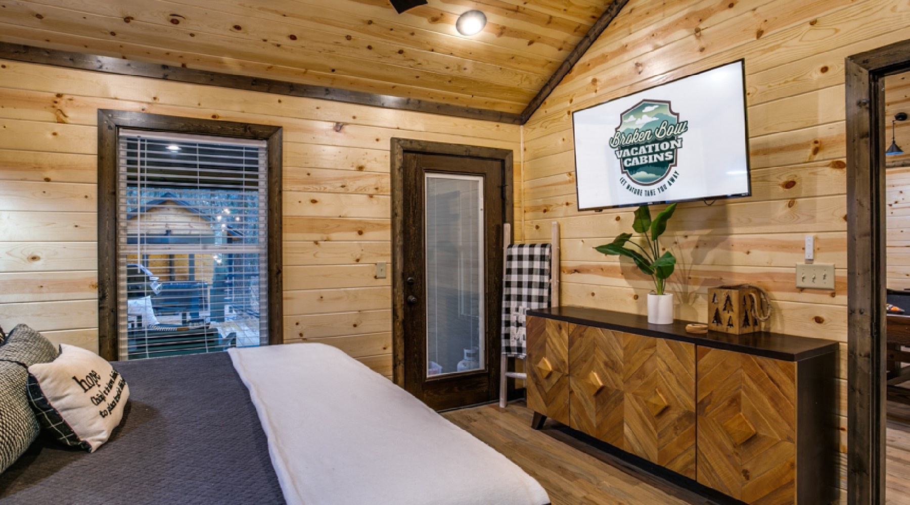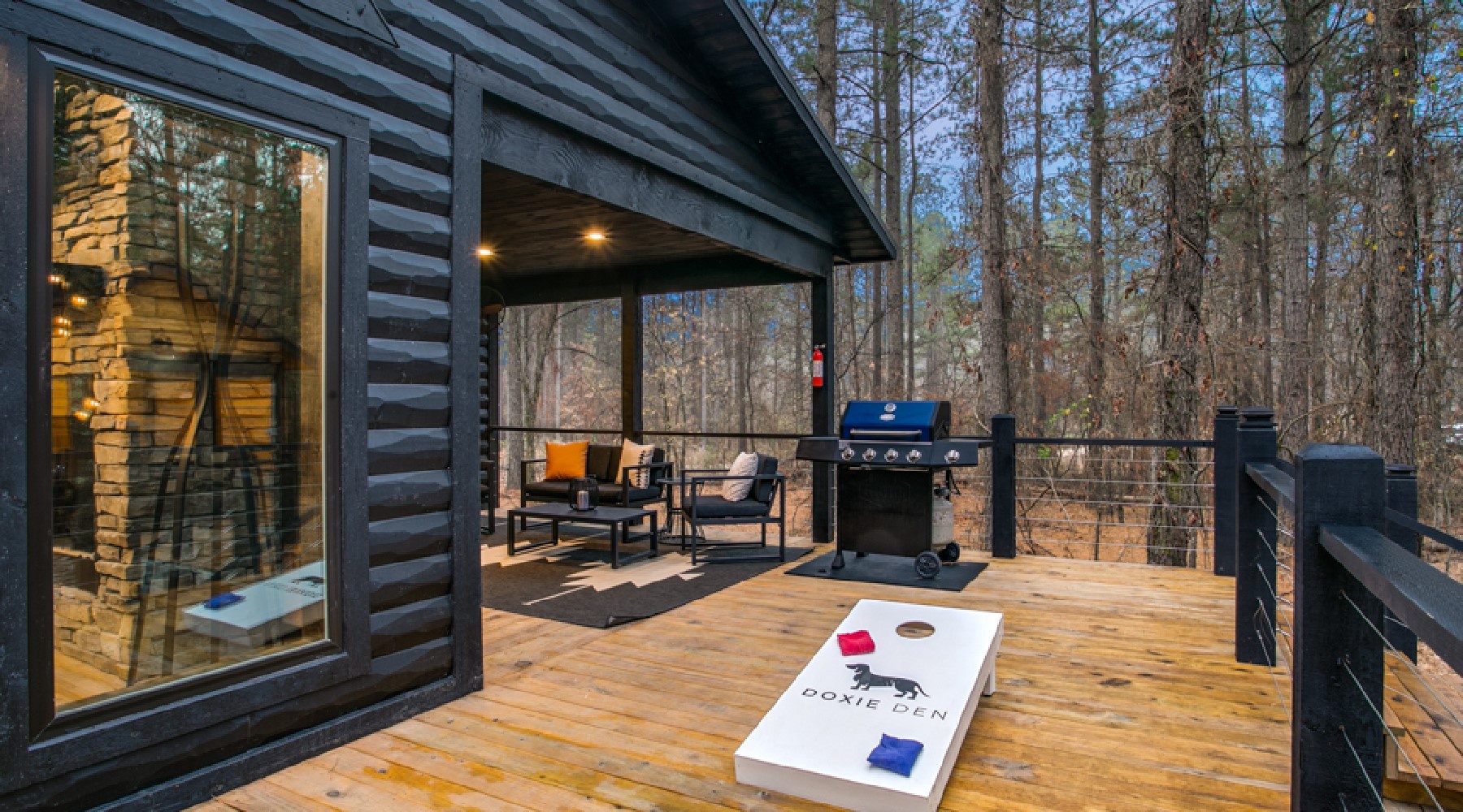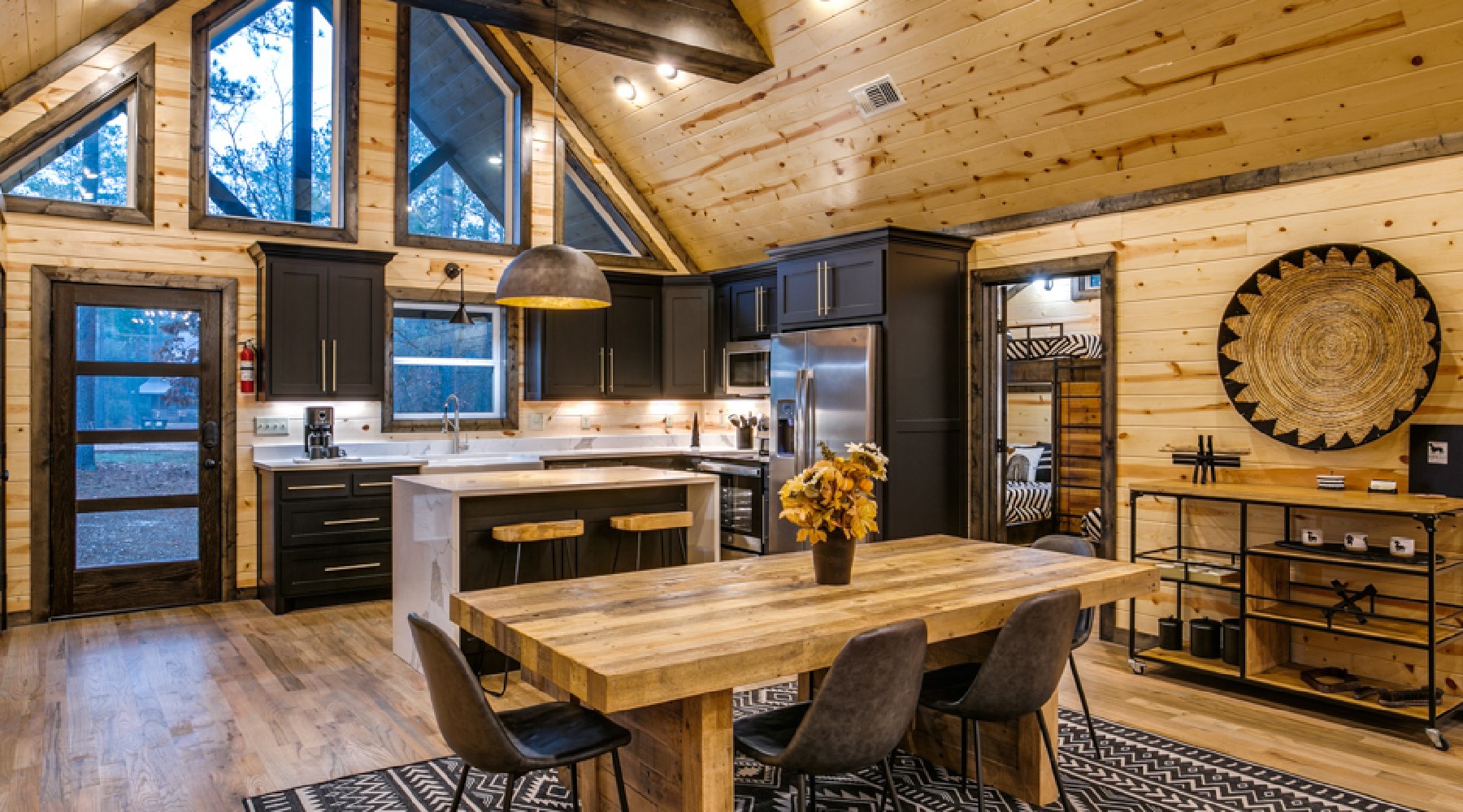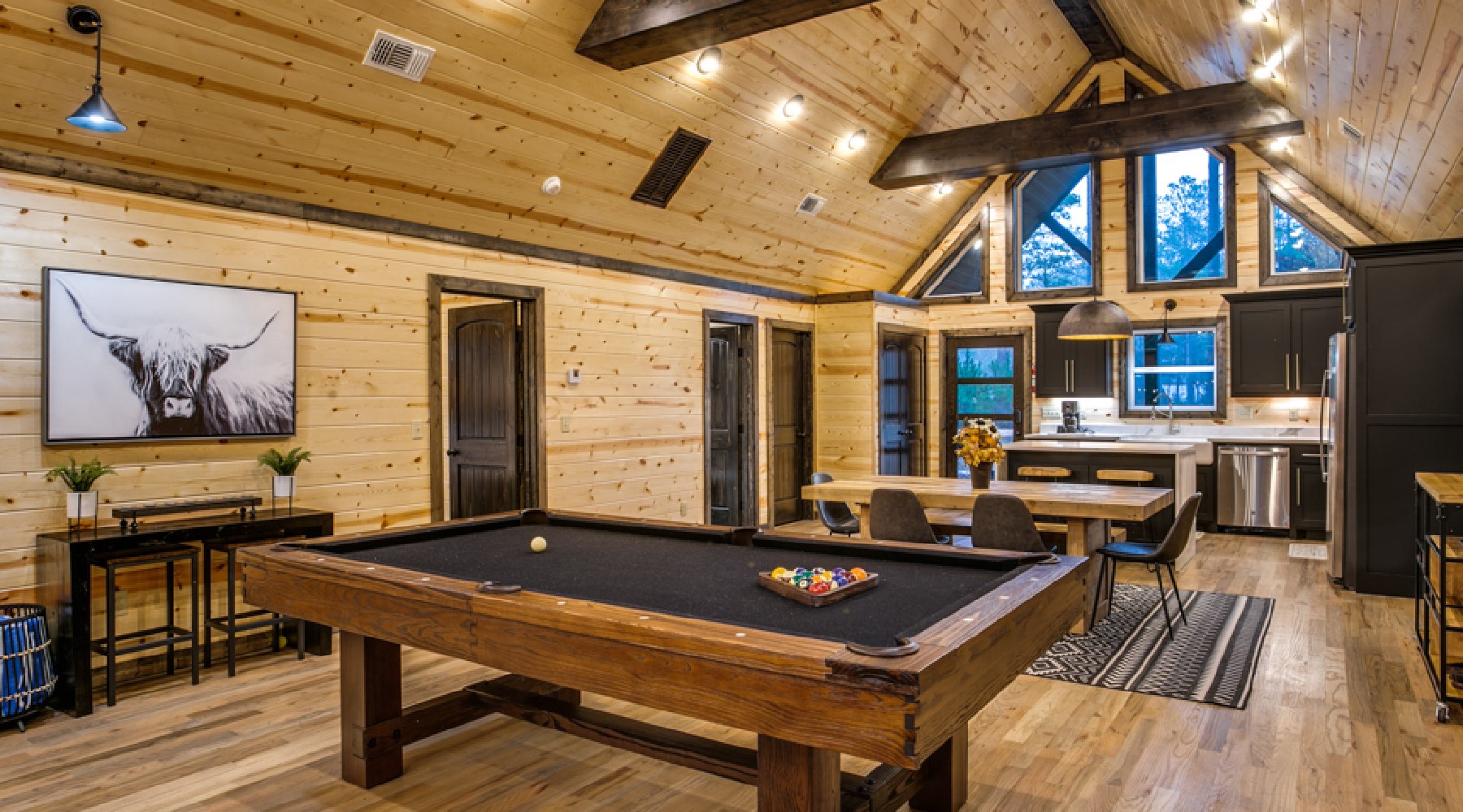 Doxie Den is a custom luxury cabin designed for those who want top-of-the-line amenities while enjoying the great outdoors of Southeastern Oklahoma. With two master suite bedrooms and a bunk room that sleeps 6, there is a pillow waiting for 10 guests. An open living space is furnished with two supple leather sofas in front of a gas burning fireplace (seasonal October 15th -April 15th), and a large TV with Direct TV channels (PPV not available). Enjoy a game of pool in this same area. The nearby kitchen table seats 8 while the island space seats additional diners. A well-stocked kitchen makes meals easy to prep and enjoy. The cabinets are stocked with cookware, bakeware, dinner ware, and utensils for cooking and eating. The bedrooms flank each side of the living area. Each bedroom has a king size bed, a TV with Direct TV channels and access to the back deck area. The ensuite bathrooms have tile showers and double vanities. The bunkroom does not have an attached bathroom. The bunkroom has shelves to store personal items and a TV with Direct TV channels (PPV not available). There is a full bath off of the kitchen with a tub shower combo.