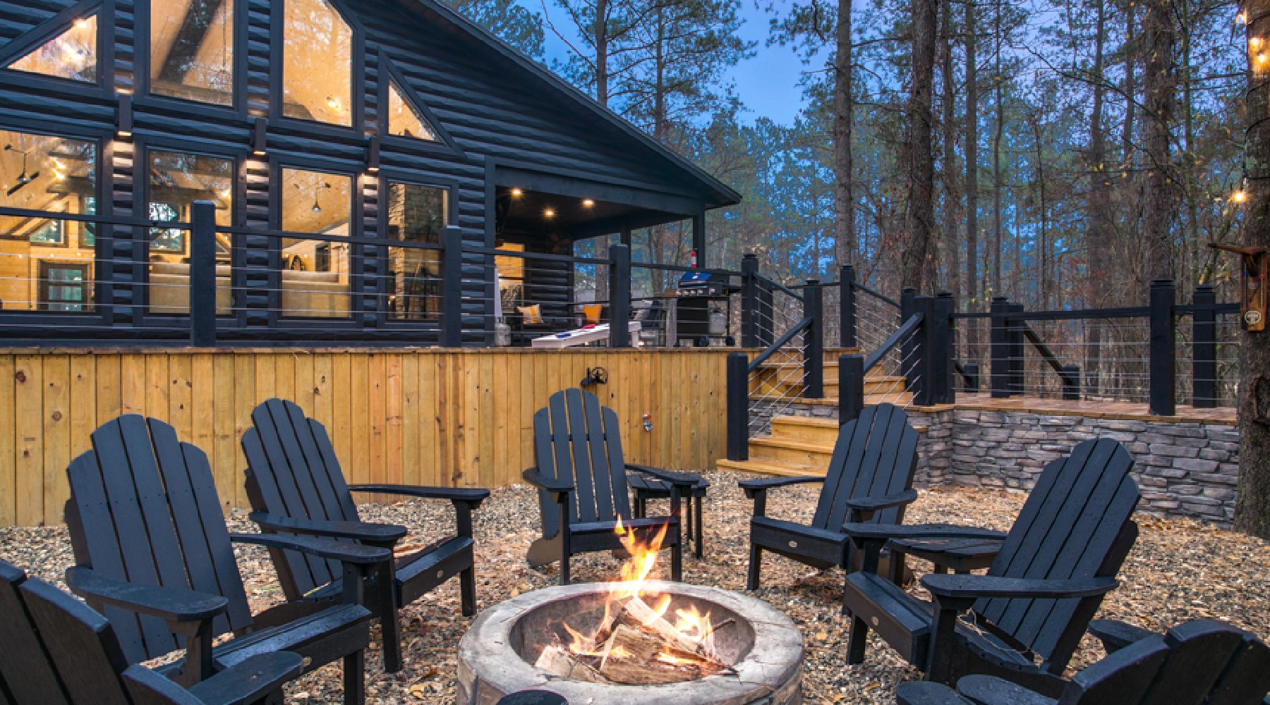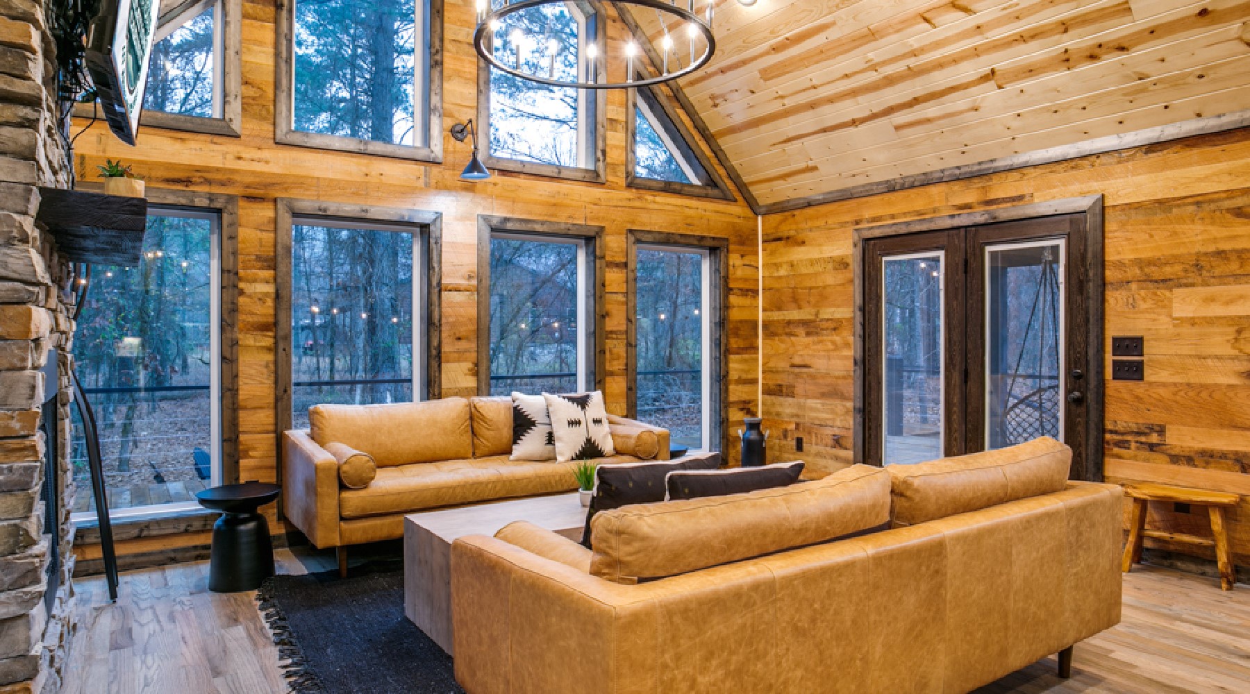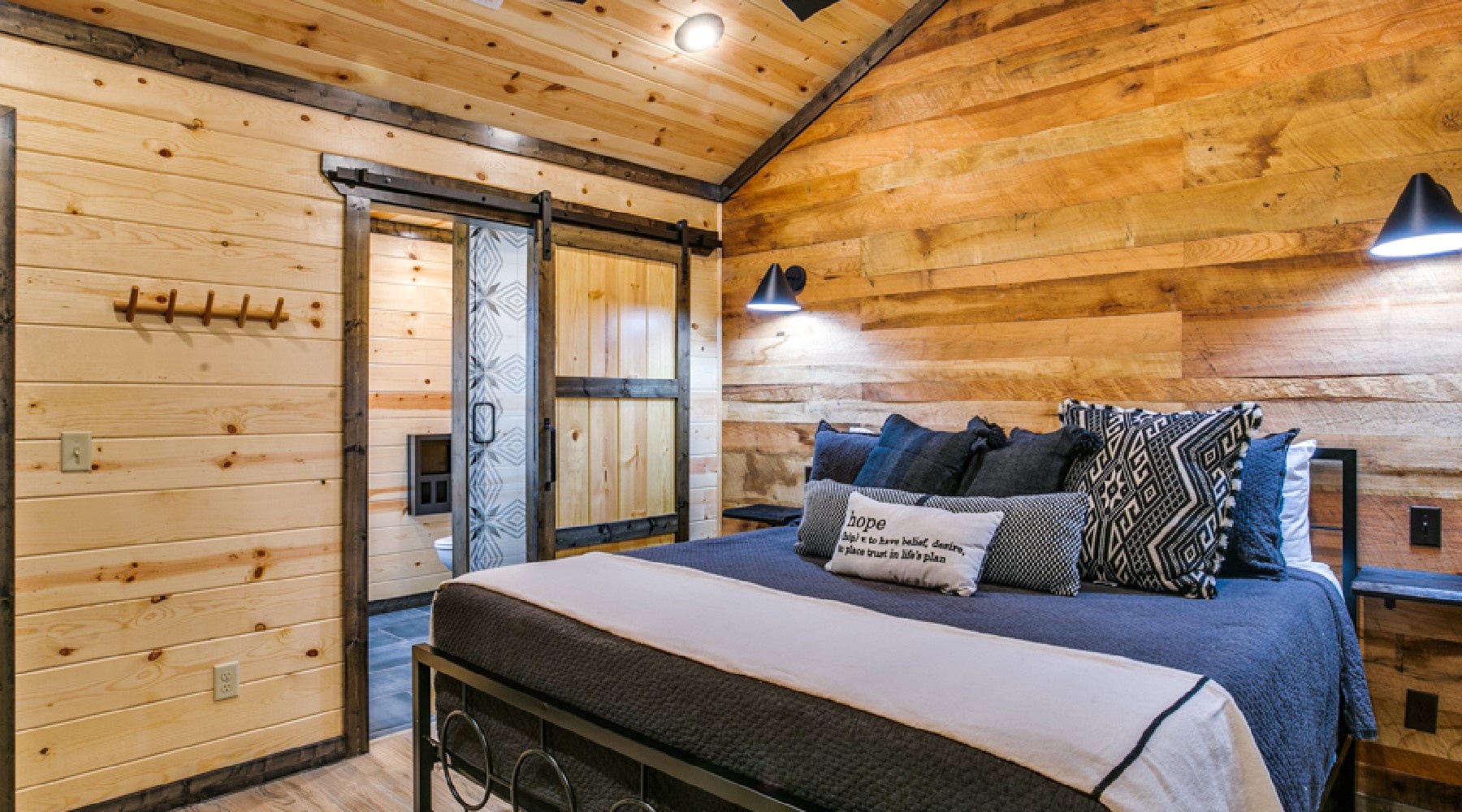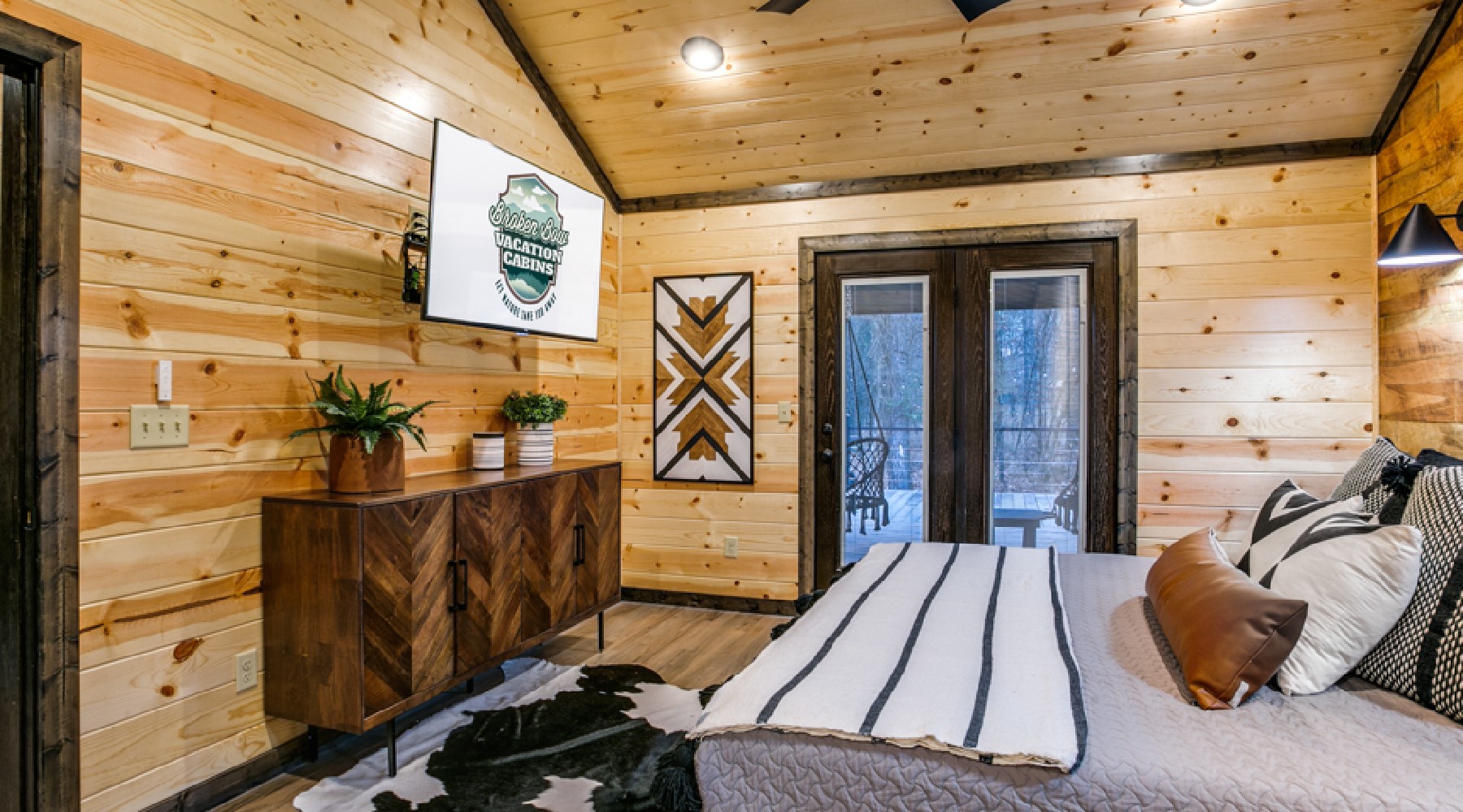 Doxie Den is a custom luxury cabin designed for those who want top-of-the-line amenities while enjoying the great outdoors of Southeastern Oklahoma. With two master suite bedrooms and a bunk room that sleeps 6, there is a pillow waiting for 10 guests. An open living space is furnished with two supple leather sofas in front of a gas burning fireplace (seasonal October 15th -April 15th), and a large TV with Direct TV channels (PPV not available). Enjoy a game of pool in this same area. The nearby kitchen table seats 8 while the island space seats additional diners. A well-stocked kitchen makes meals easy to prep and enjoy. The cabinets are stocked with cookware, bakeware, dinner ware, and utensils for cooking and eating. The bedrooms flank each side of the living area. Each bedroom has a king size bed, a TV with Direct TV channels and access to the back deck area. The ensuite bathrooms have tile showers and double vanities. The bunkroom does not have an attached bathroom. The bunkroom has shelves to store personal items and a TV with Direct TV channels (PPV not available). There is a full bath off of the kitchen with a tub shower combo.