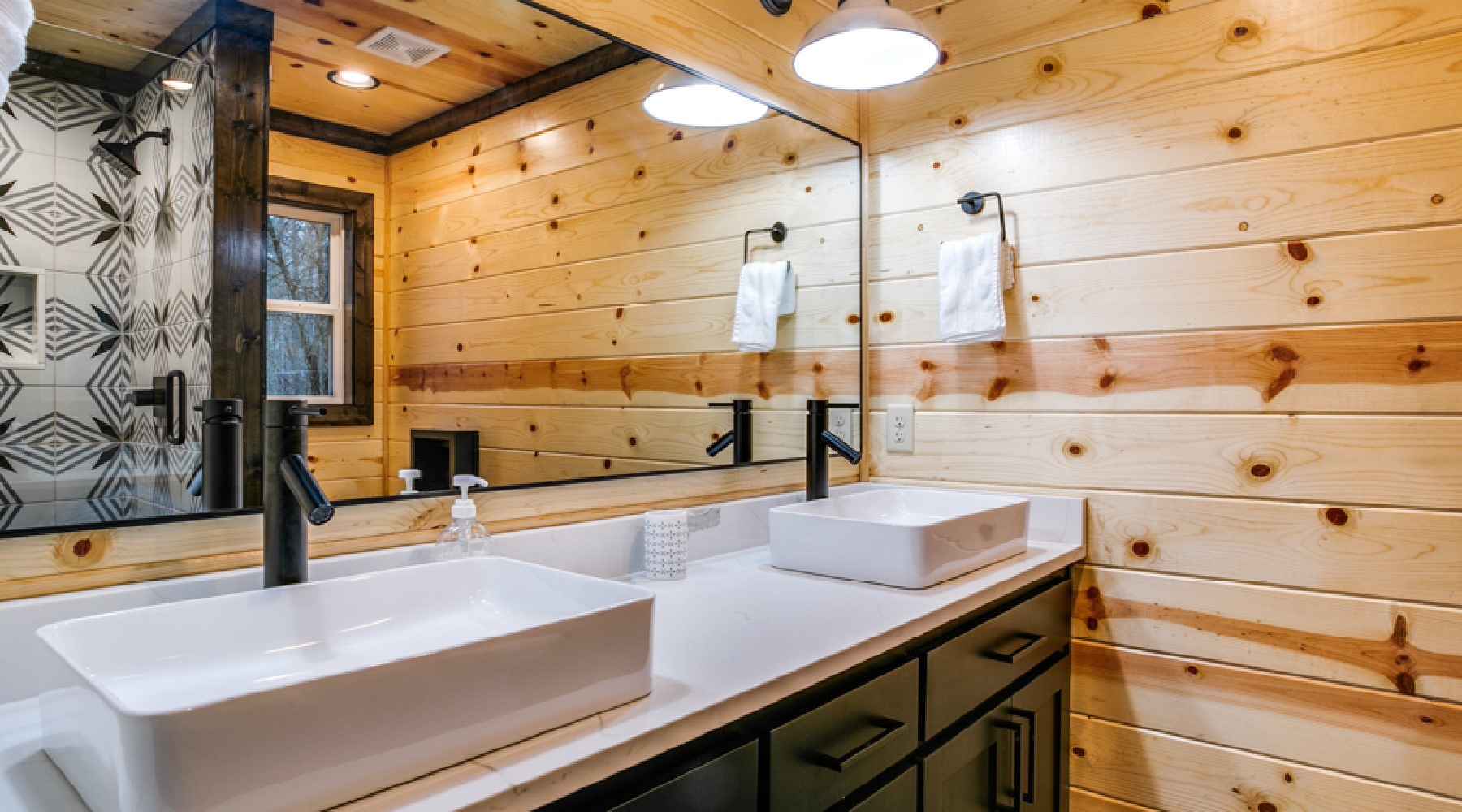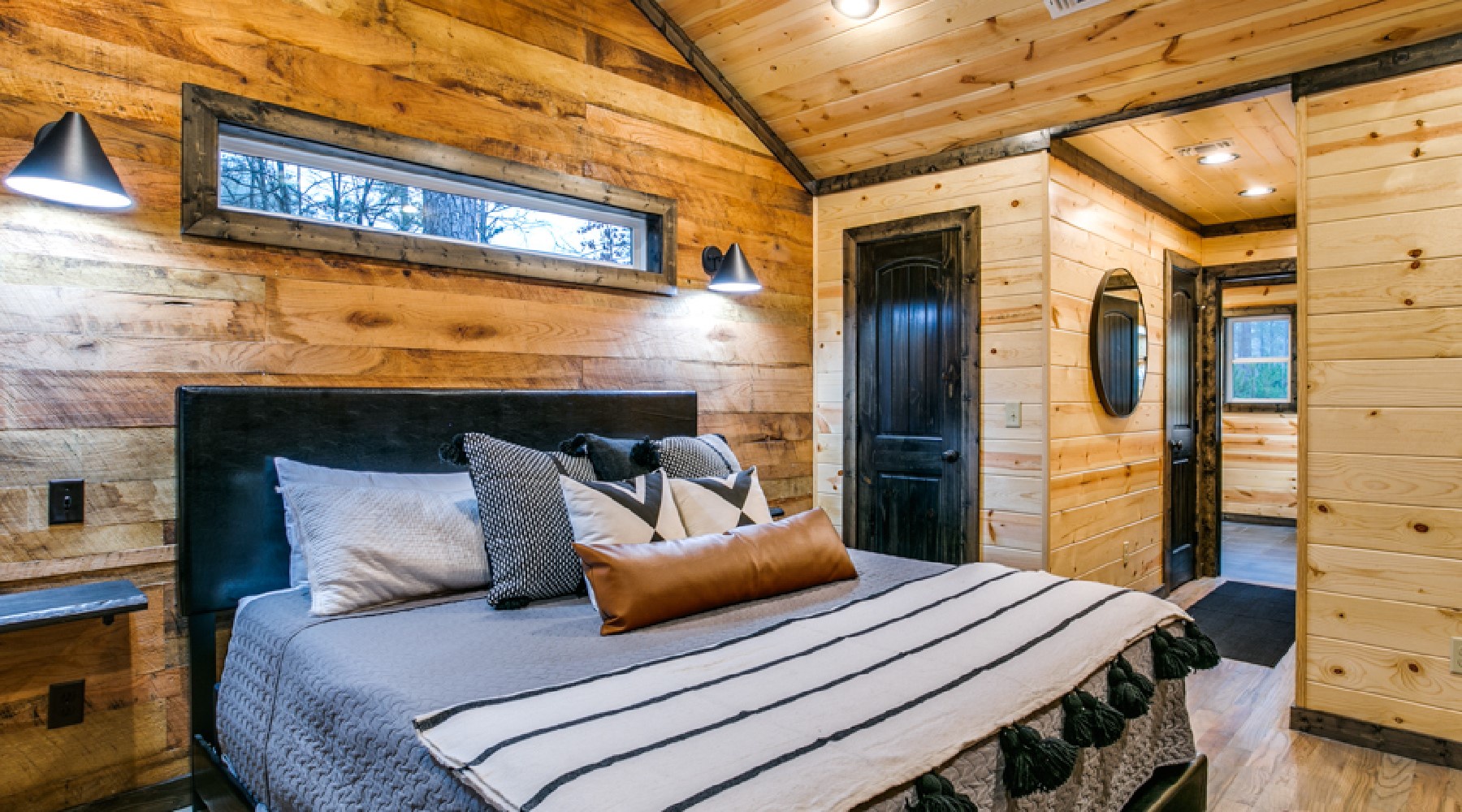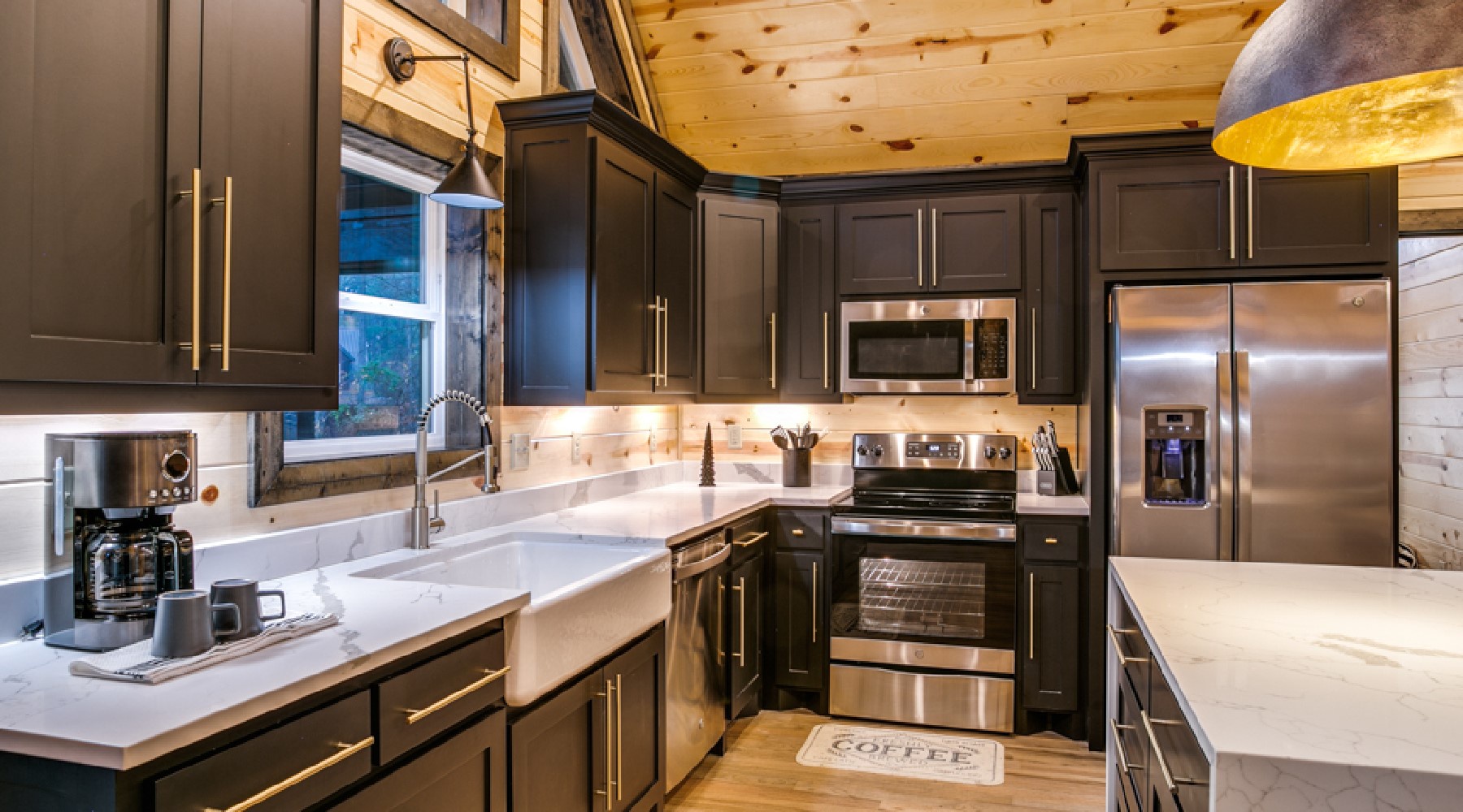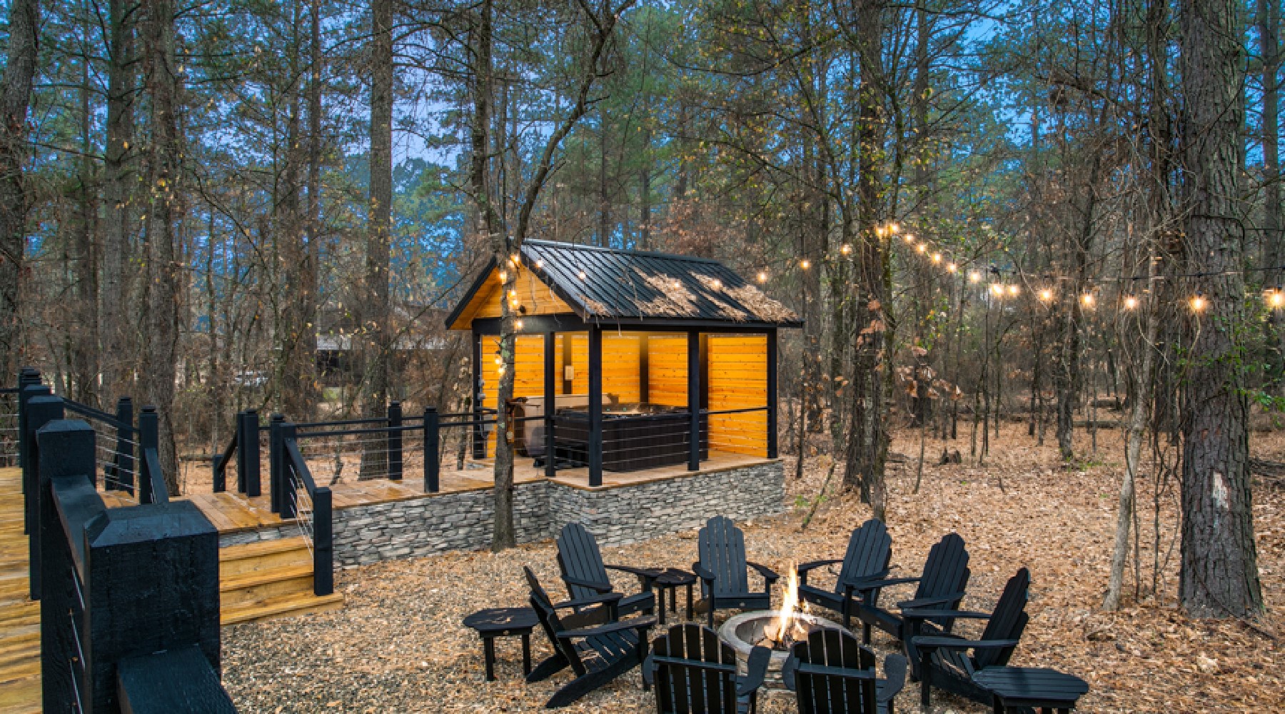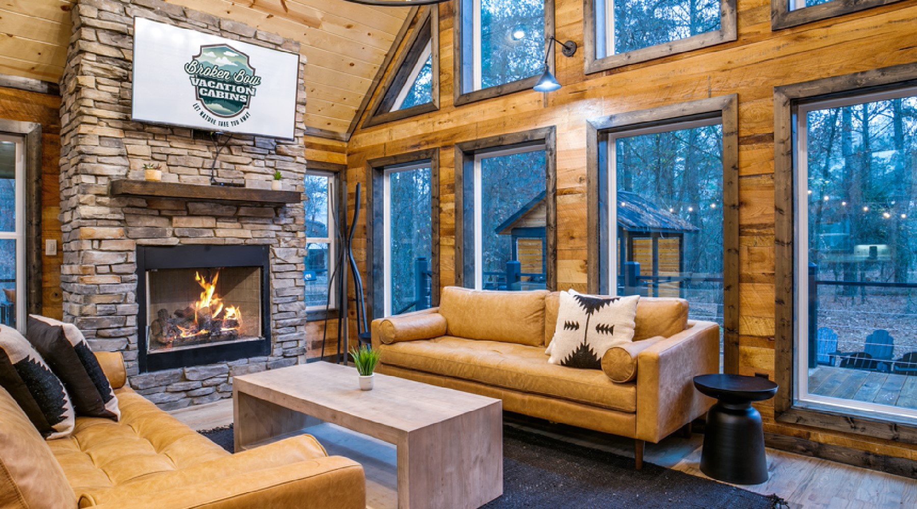 Doxie Den is a custom luxury cabin designed for those who want top-of-the-line amenities while enjoying the great outdoors of Southeastern Oklahoma. With two master suite bedrooms and a bunk room that sleeps 6, there is a pillow waiting for 10 guests. An open living space is furnished with two supple leather sofas in front of a gas burning fireplace (seasonal October 15th -April 15th), and a large TV with Direct TV channels (PPV not available). Enjoy a game of pool in this same area. The nearby kitchen table seats 8 while the island space seats additional diners. A well-stocked kitchen makes meals easy to prep and enjoy. The cabinets are stocked with cookware, bakeware, dinner ware, and utensils for cooking and eating. The bedrooms flank each side of the living area. Each bedroom has a king size bed, a TV with Direct TV channels and access to the back deck area. The ensuite bathrooms have tile showers and double vanities. The bunkroom does not have an attached bathroom. The bunkroom has shelves to store personal items and a TV with Direct TV channels (PPV not available). There is a full bath off of the kitchen with a tub shower combo.