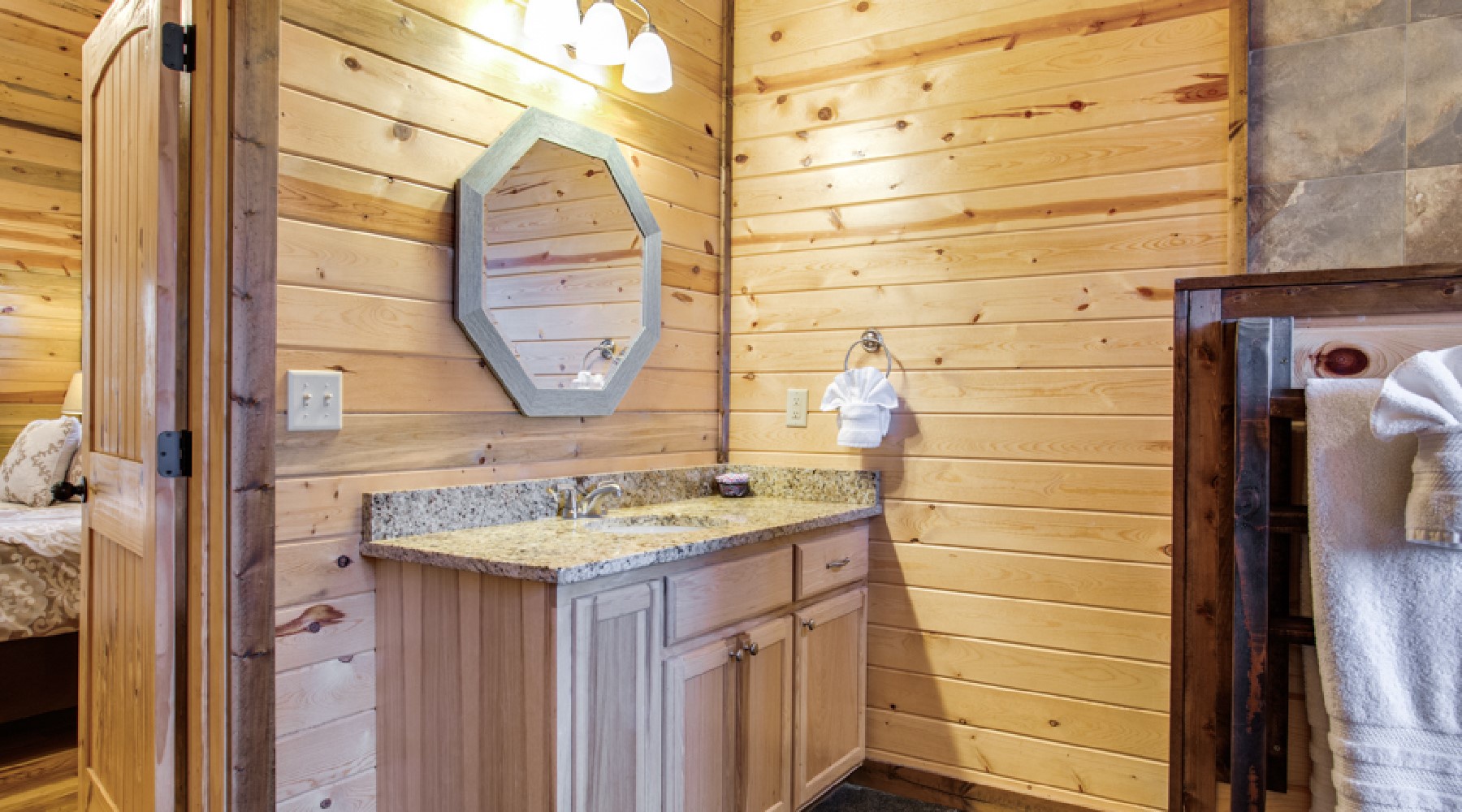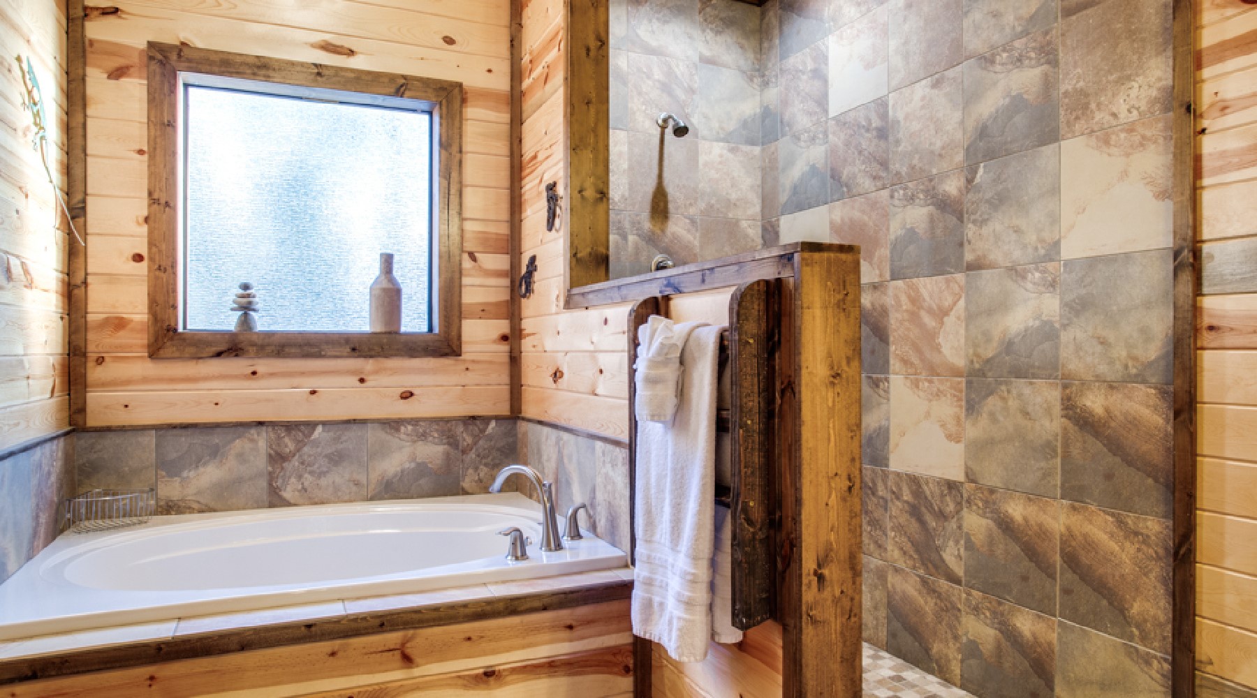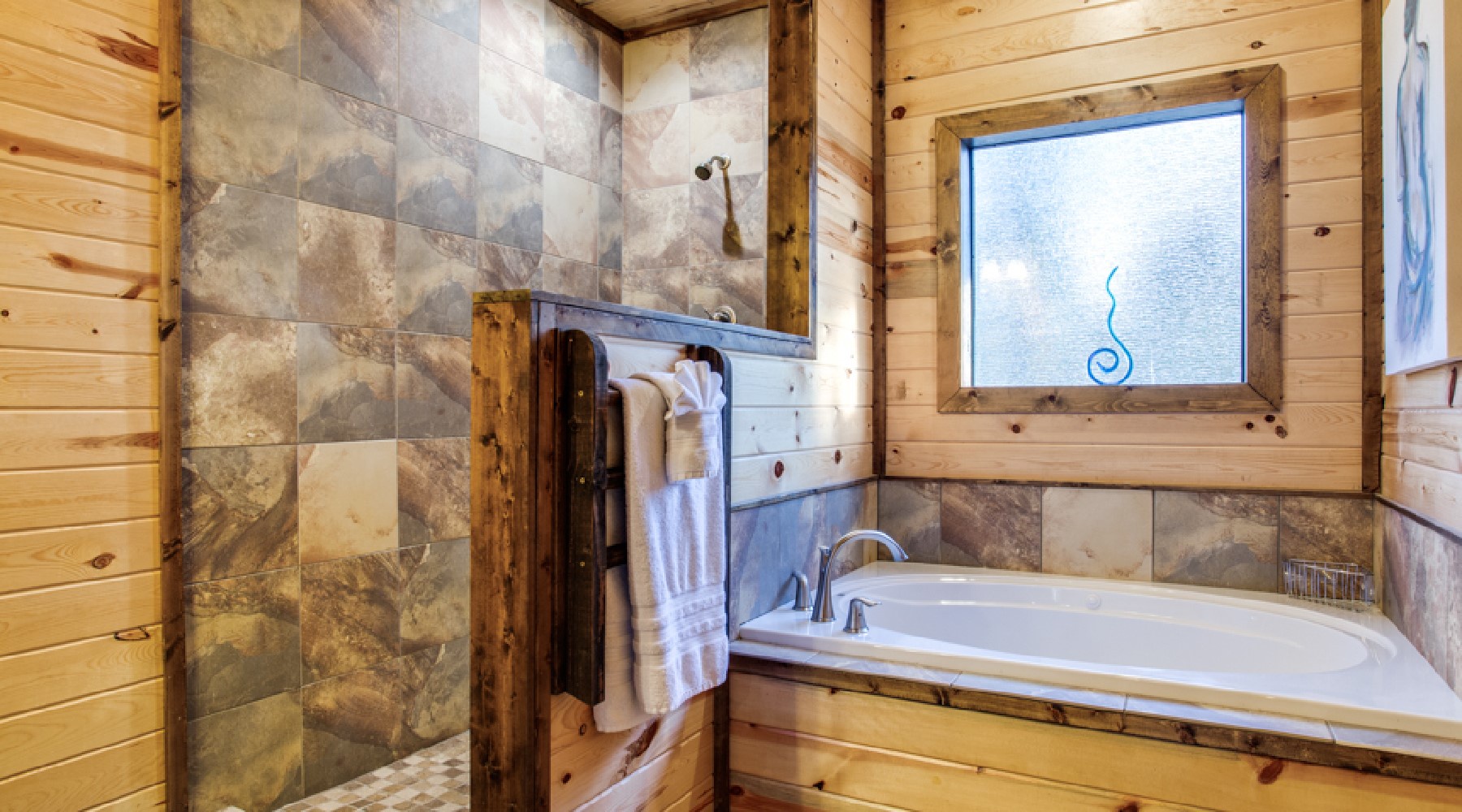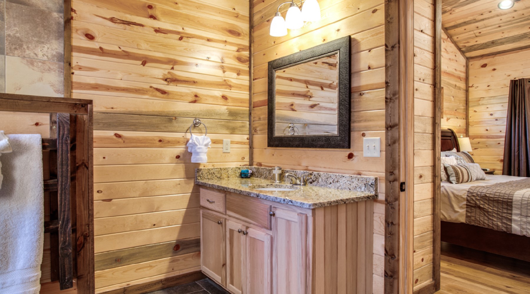 Heaven’s Trail features two master bedroom suites, king size beds, 40″ HDTV with Direct TV viewing package, and French doors to the outdoor deck. The bath area for each bathroom has a tiled walk-in shower, jacuzzi tub with granite counter tops.