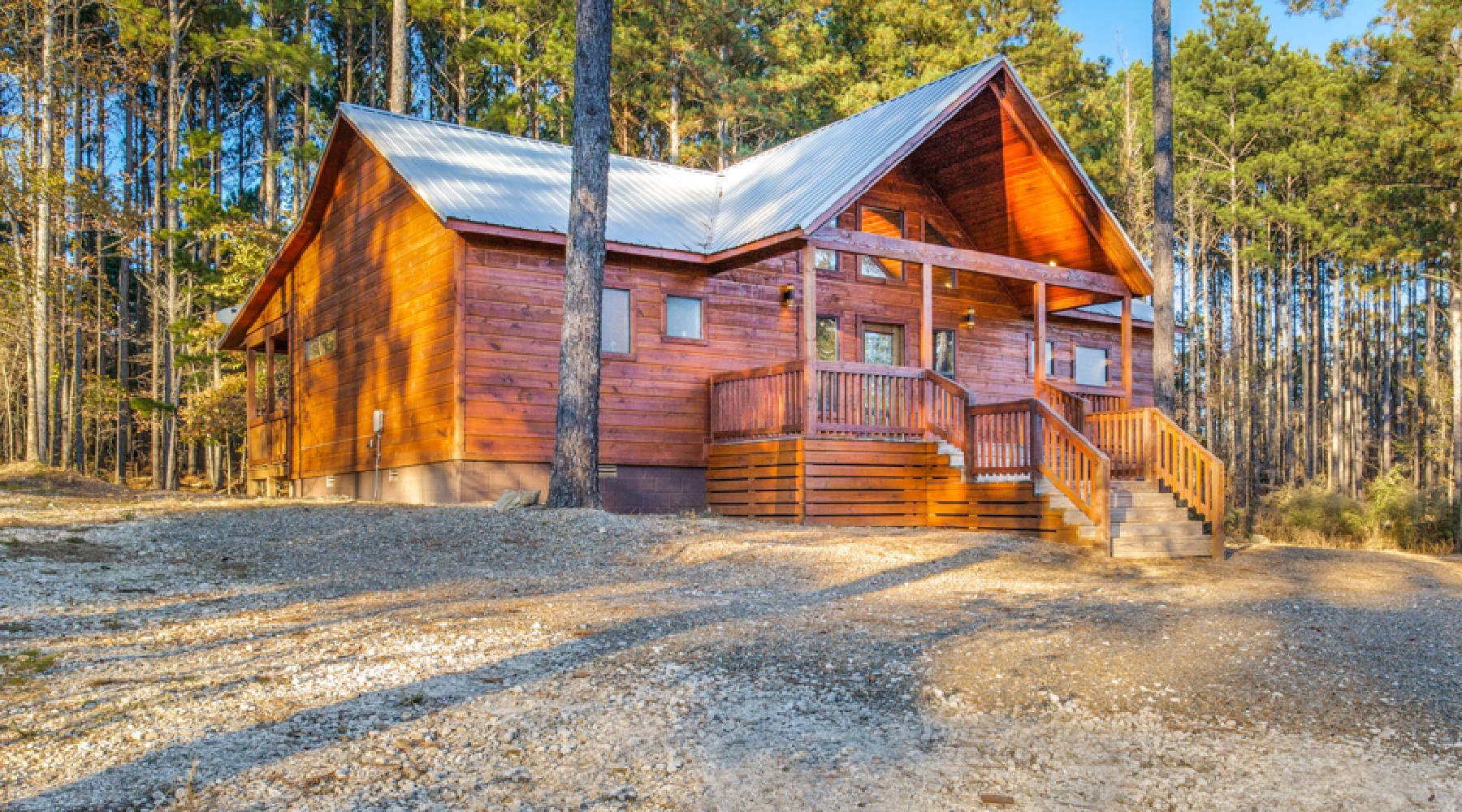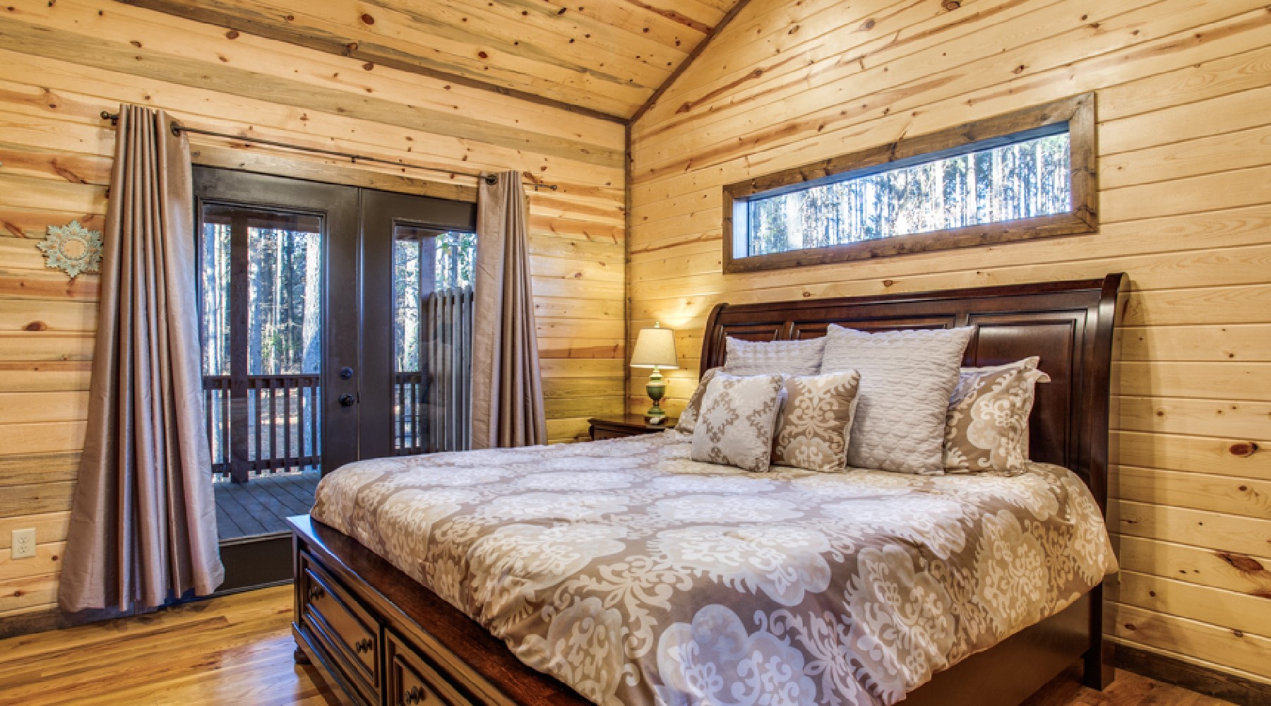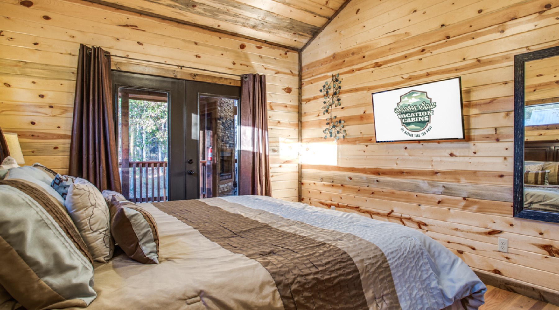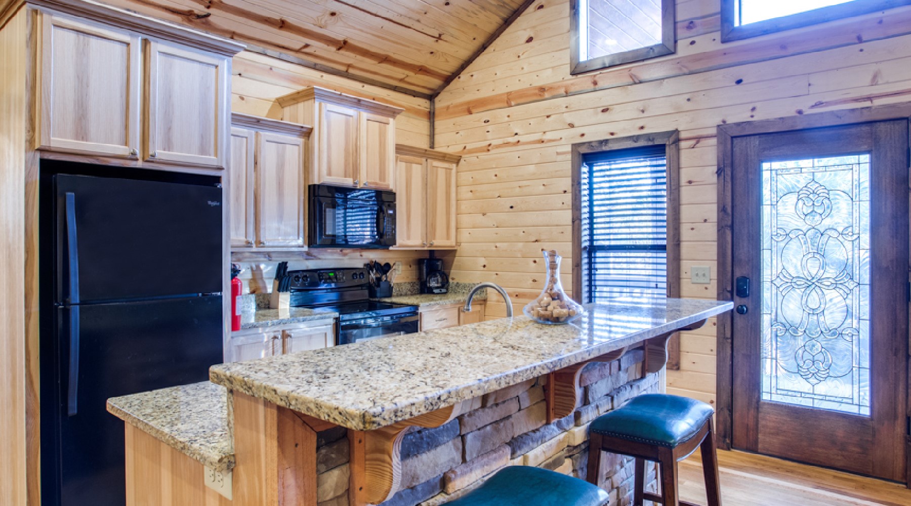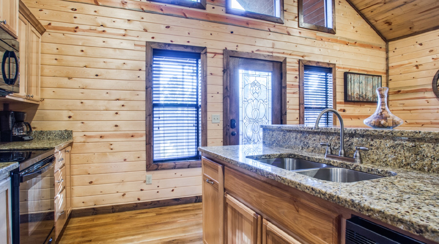 Heaven’s Trail features two master bedroom suites, king size beds, 40″ HDTV with Direct TV viewing package, and French doors to the outdoor deck. The bath area for each bathroom has a tiled walk-in shower, jacuzzi tub with granite counter tops.