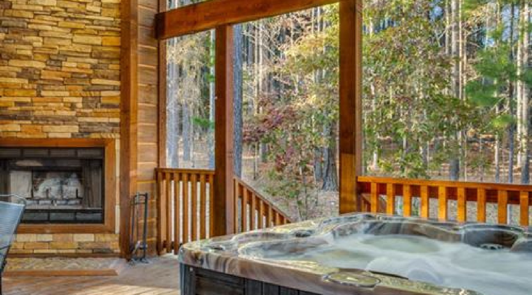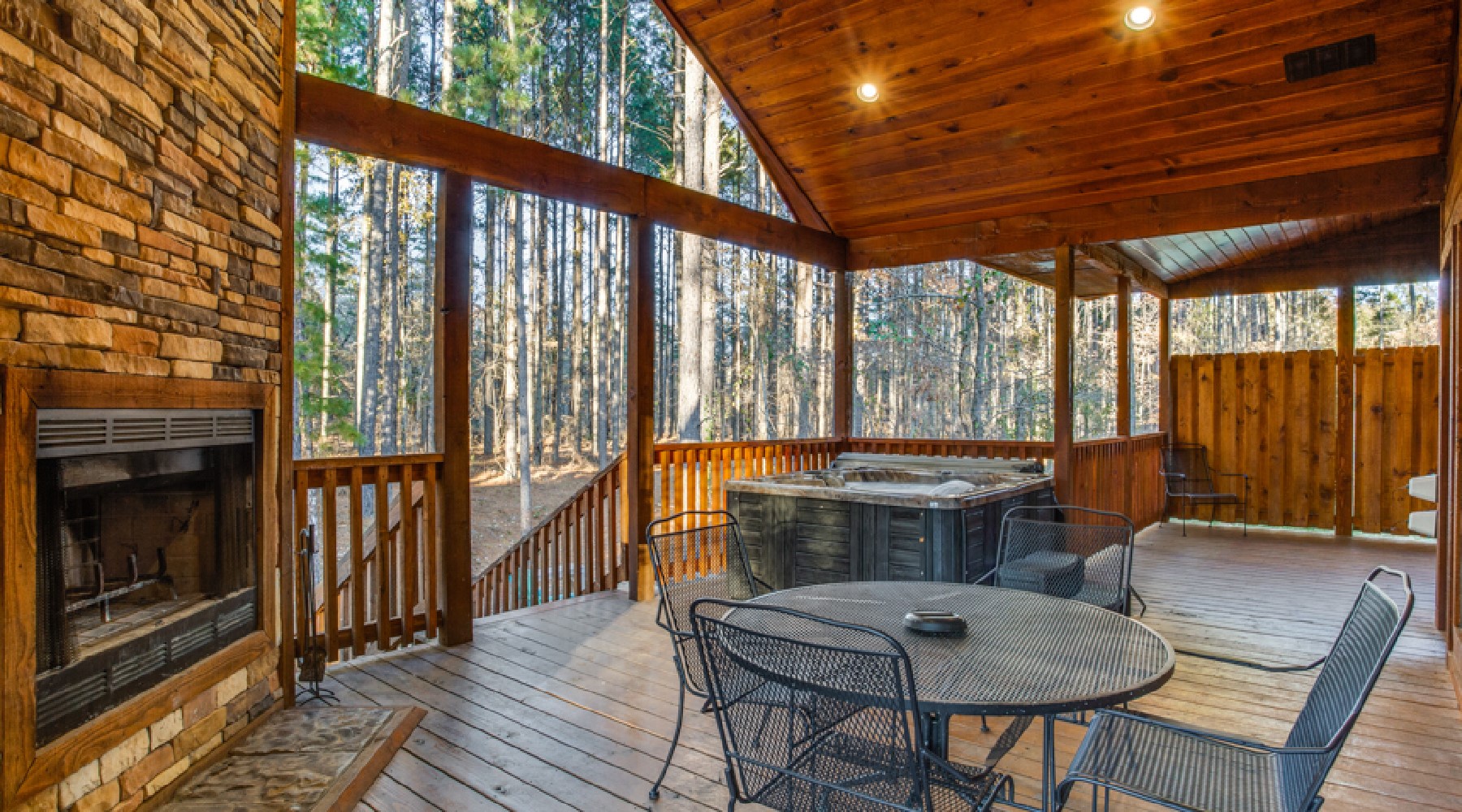 The covered deck features comfortable seating areas, wood burning fireplace, hot-tub, and gas grill (propane provided).