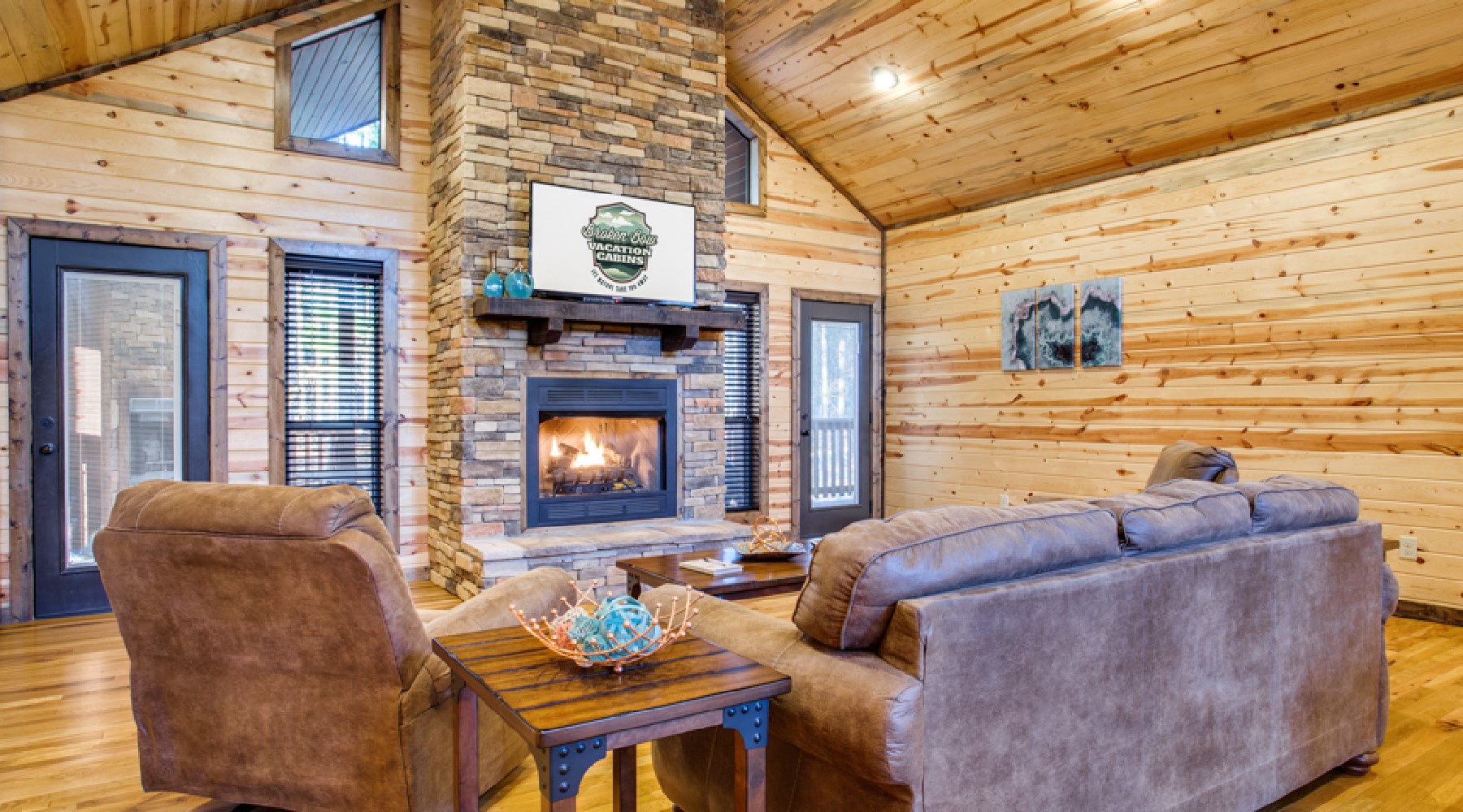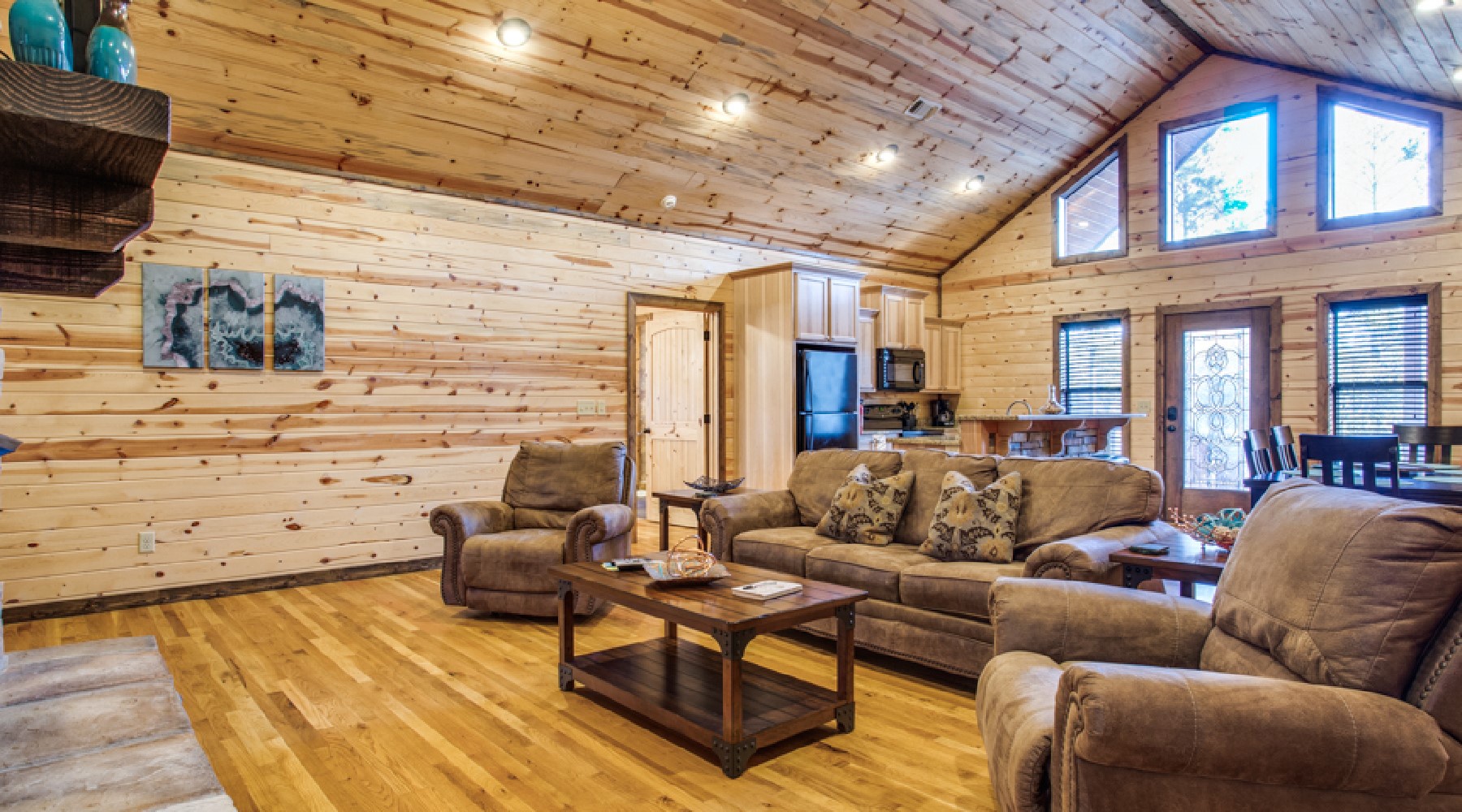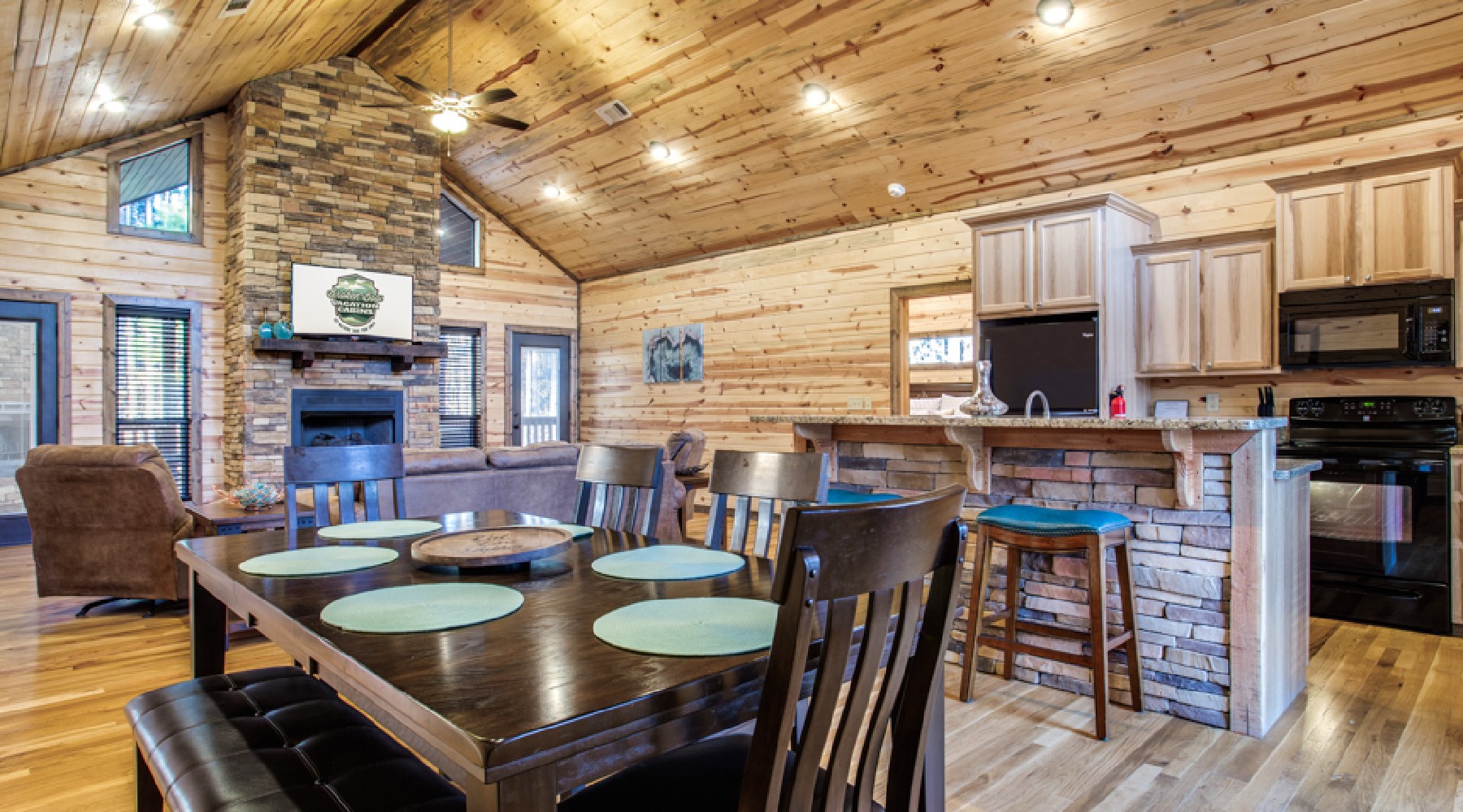 The spacious living and kitchen area features vaulted ceilings. The living area offers a gas log fireplace, 50″ HDTV, comfortable seating/lounging furniture with queen pull-out sofa.