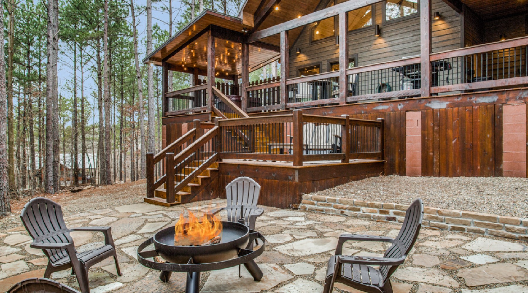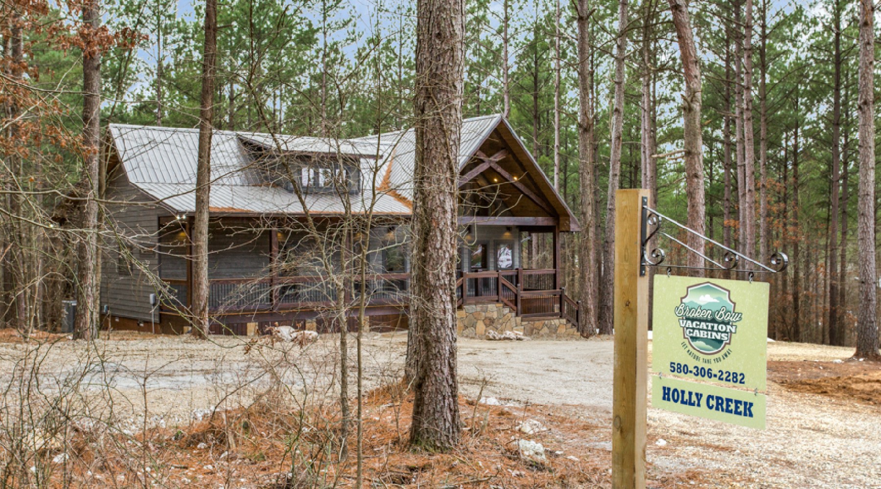 A bistro style table and gas grill (propane provided) as well as seating by the gas log fire place with easy on timer switch (seasonal October 15th – April 15th) are located on the outdoor decks. There is an HDTV with DirecTV package (PPV not provided) and a 4-5 person hot tub. The driveway can accompany cars and trailers. Holly Creek is just minutes from Hochatown attractions and restaurants.