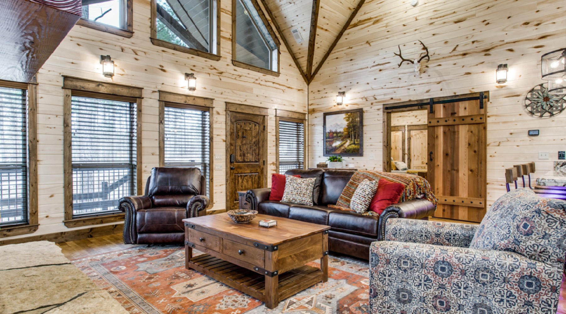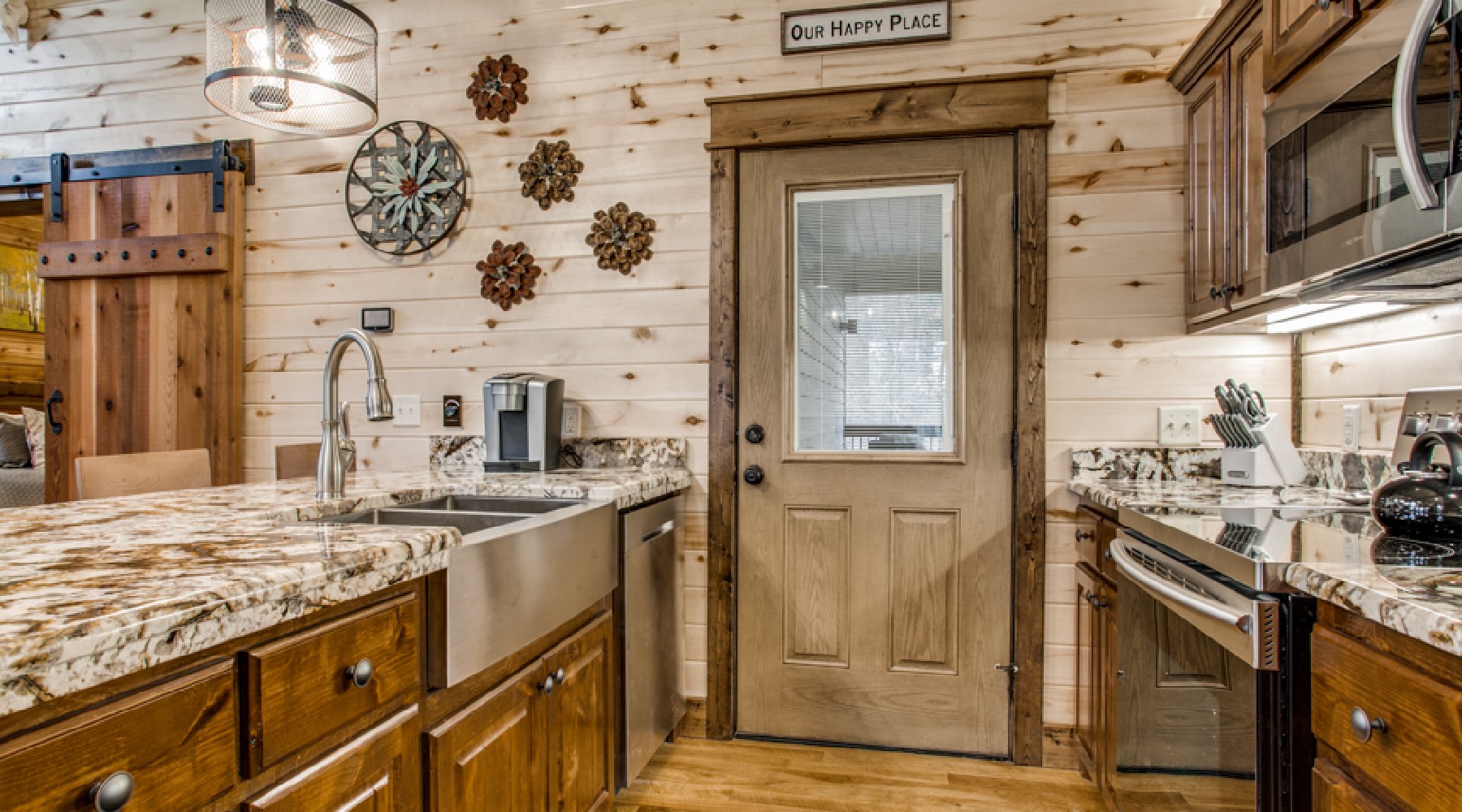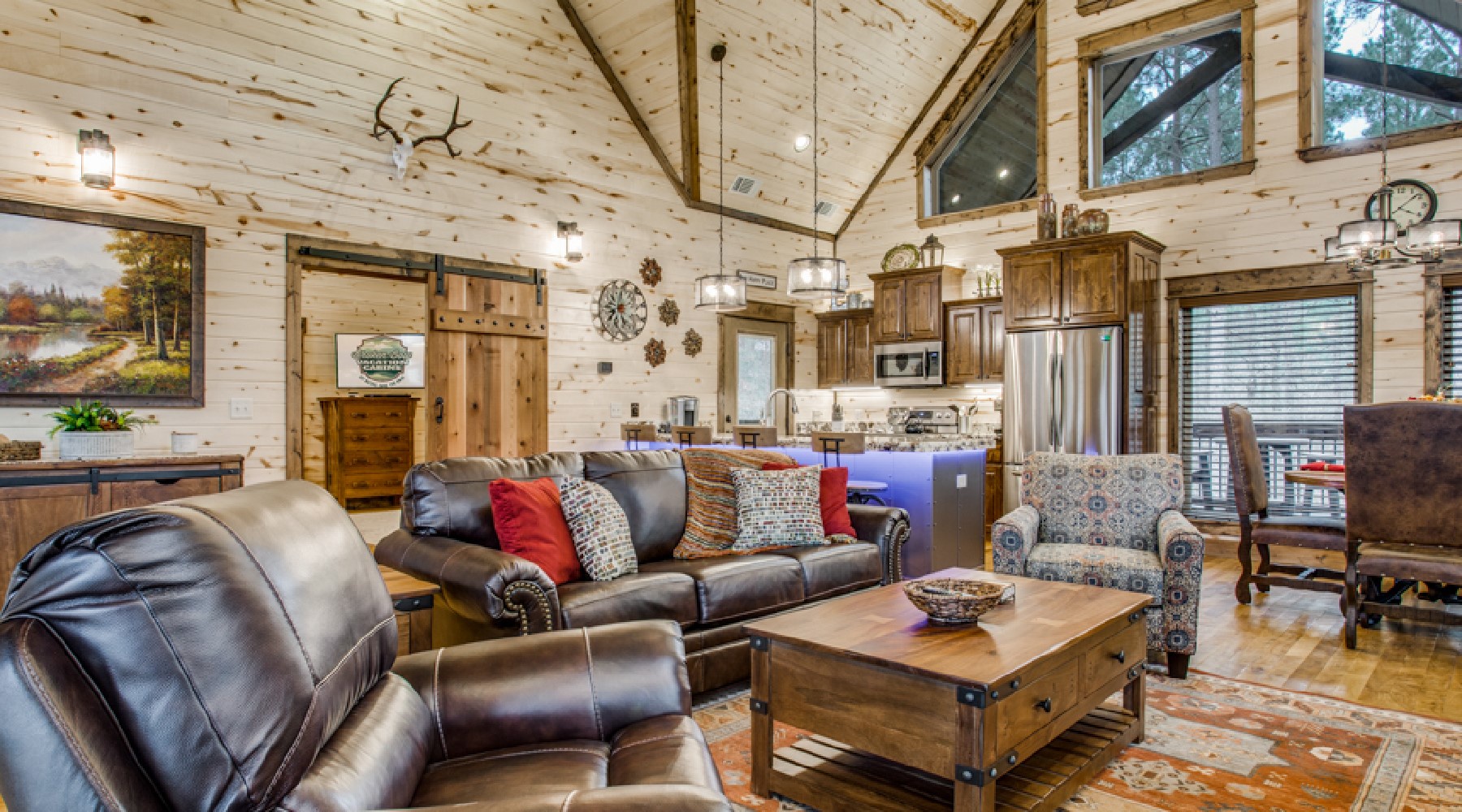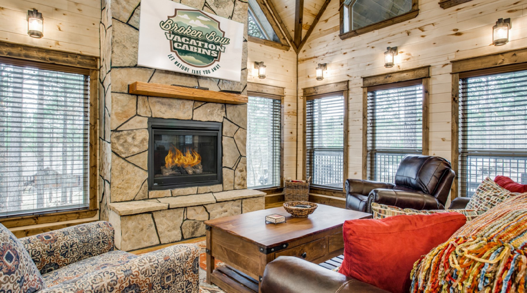 Walk into this spacious open floor plan to find all the comforts you expect on a relaxing get away. The floor to ceiling custom flagstone rock hearth is the focal point of this room. The gas log fireplace (seasonal October 15th – April 15th) has an easy on/off timer to ensure you stay warm as you watch your favorite shows on the HDTV mounted above. There is plenty of seating that includes a sofa that converts to queen sleeper.