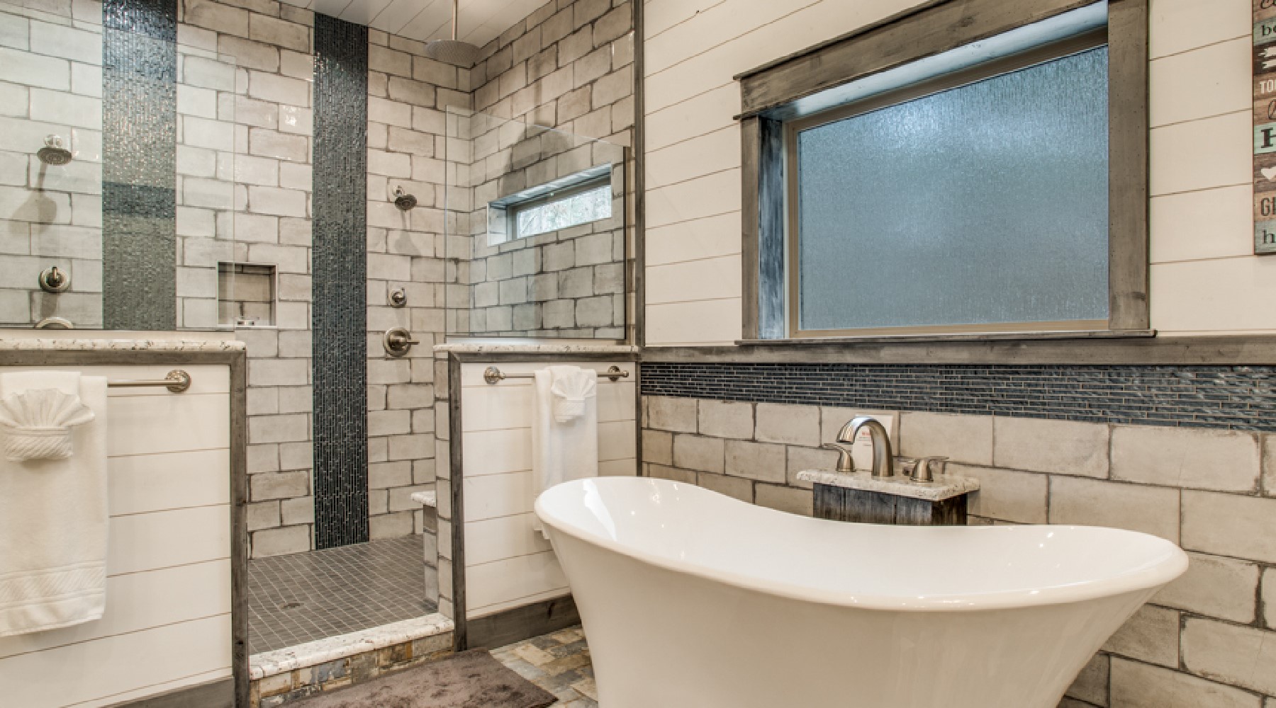 - Spacious bath with soaking tub and separate walk-in tile shower for two with dual heads plus rain heads