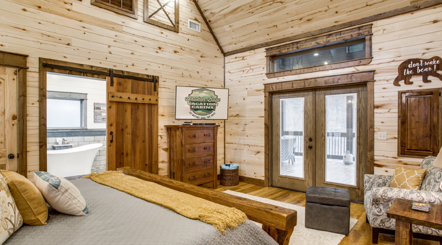 In the bedroom you will find a king size pillow top mattress wrapped in luxury linens with plenty of pillows. An HDTV is mounted on the wall for late night viewing. Enjoy the outdoor deck with hot tub by stepping through the private French doors of the bedroom. The large bathroom is off of the bedroom and has the ultimate accommodations for relaxation with a soaking tub, tiled walk-in shower for two with dual shower heads plus rain heads and granite bench seats and granite double vanity. The laundry closet is located in the bath area.