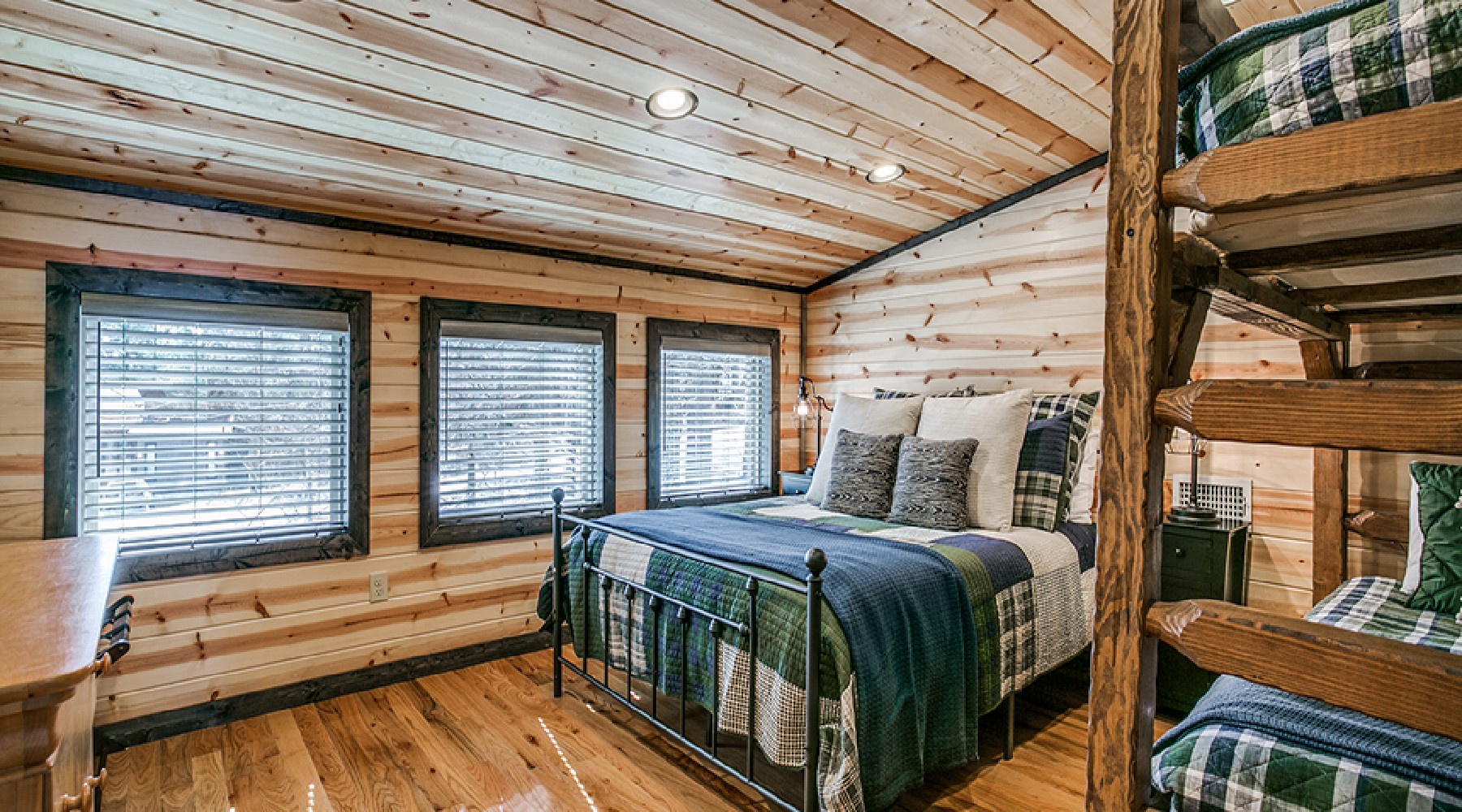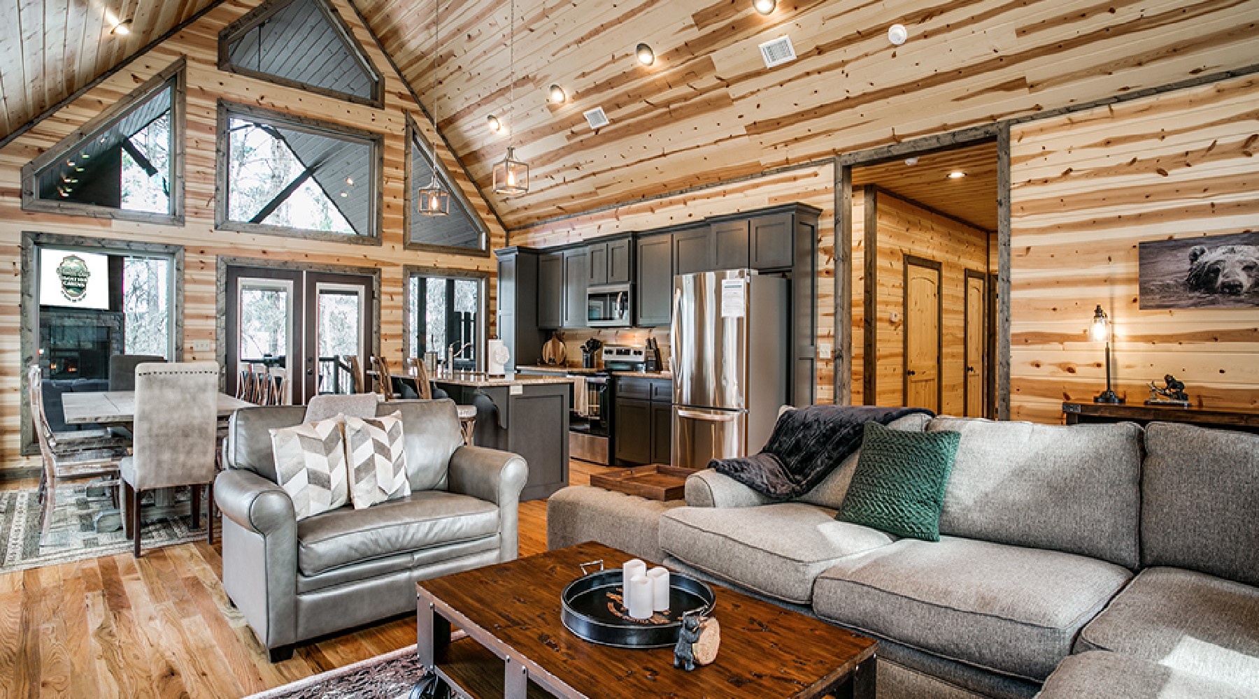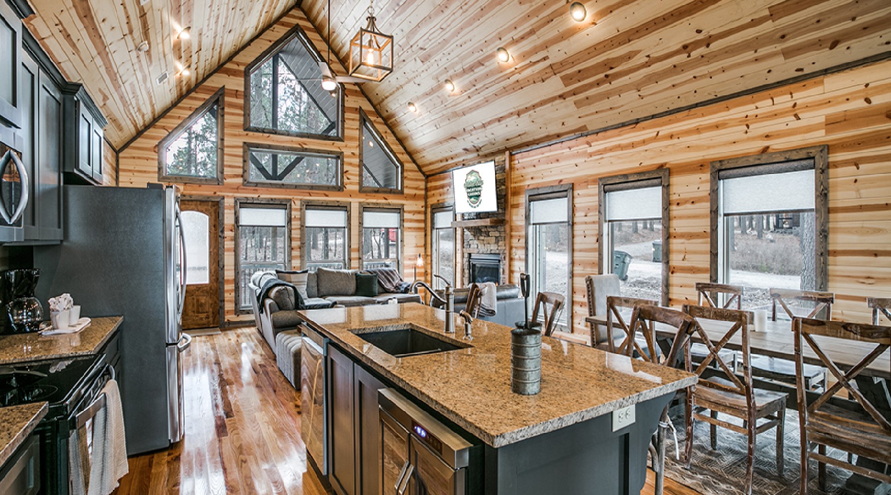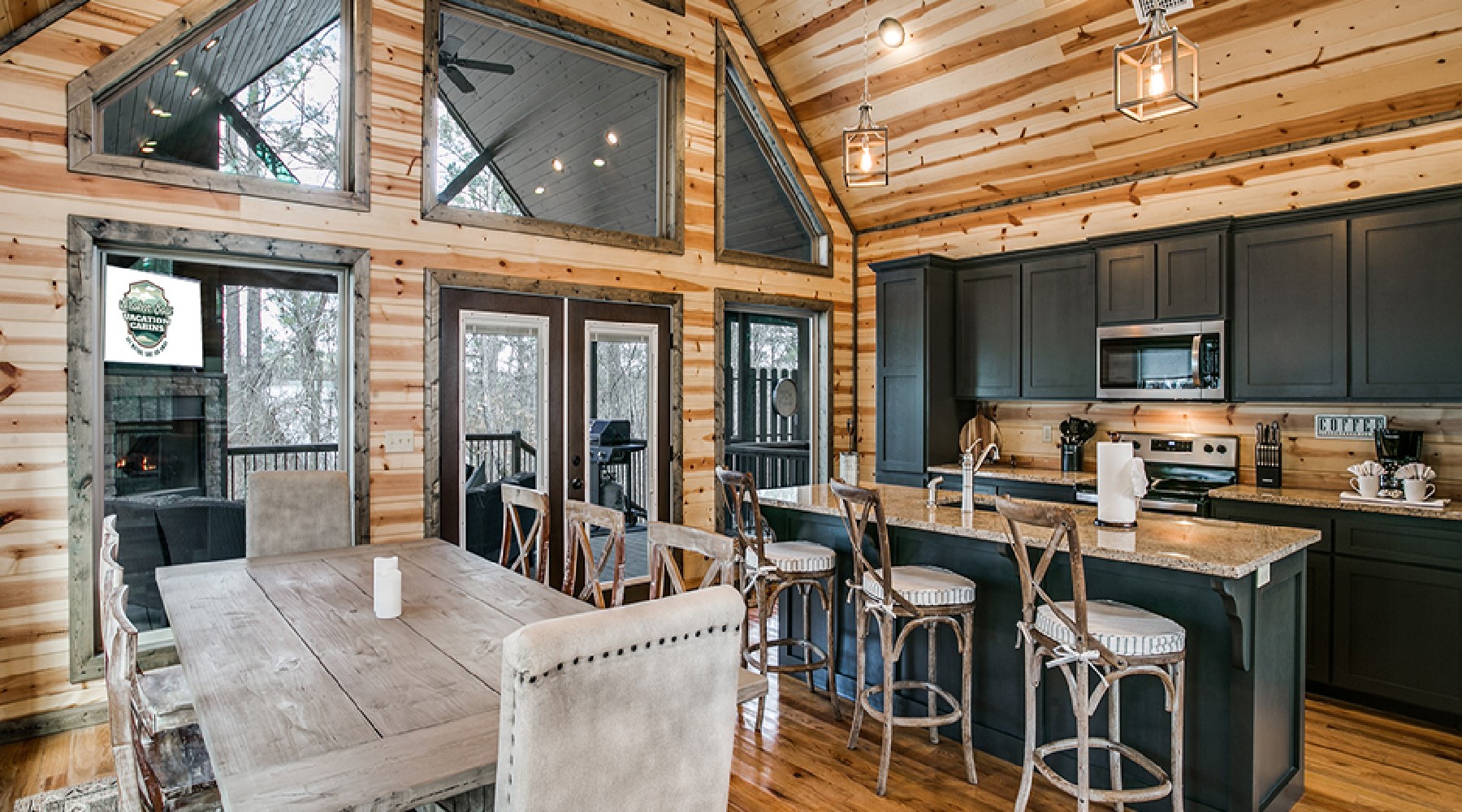 Into The Woods is a spacious 3-bedroom cabin located on a corner lot in Timber Creek Trails, phase 6. The living area has sofa and chair seating in front of a gas burning fireplace (seasonal October- April 15th). The TV is mounted above the fireplace and features a Smart TV for your app usage. The cabin has Direct TV channeling for all TV’s (PPV not available) The kitchen is equipped with dishwasher, wine fridge, microwave and glass cook top stove with electric oven. The cabinets are stocked with dinnerware, eating utensils, cookware, and bake ware. The dining table seats 8. Additional seating is provided at the island with stools.