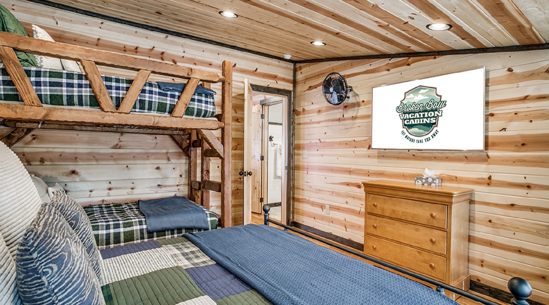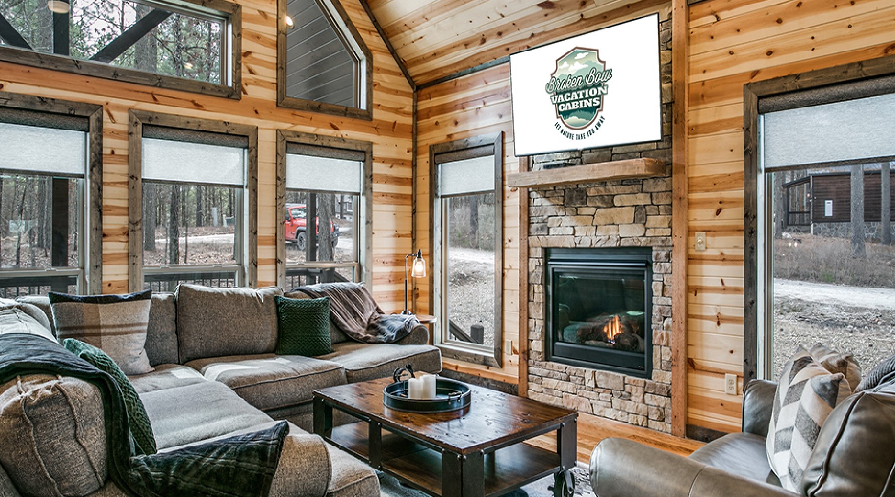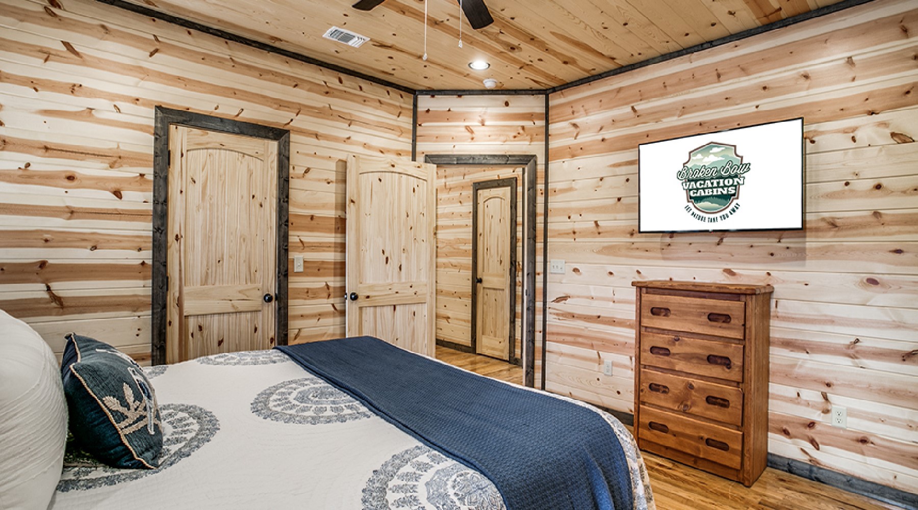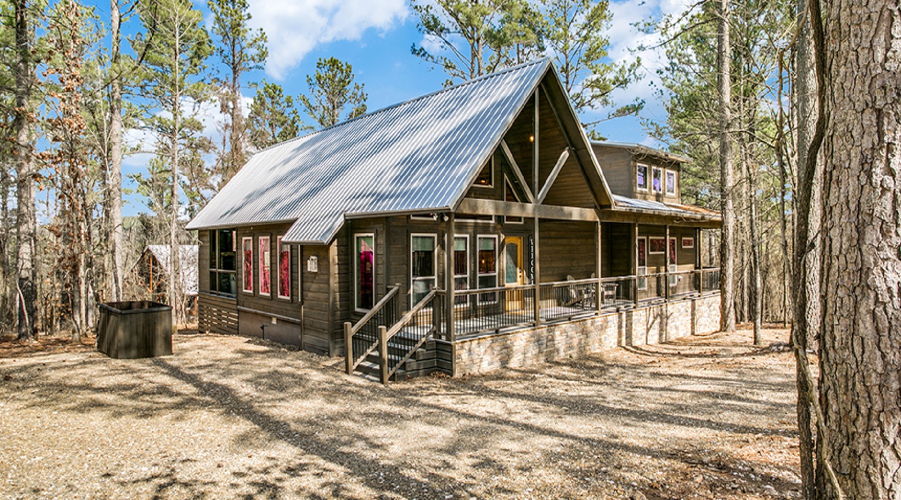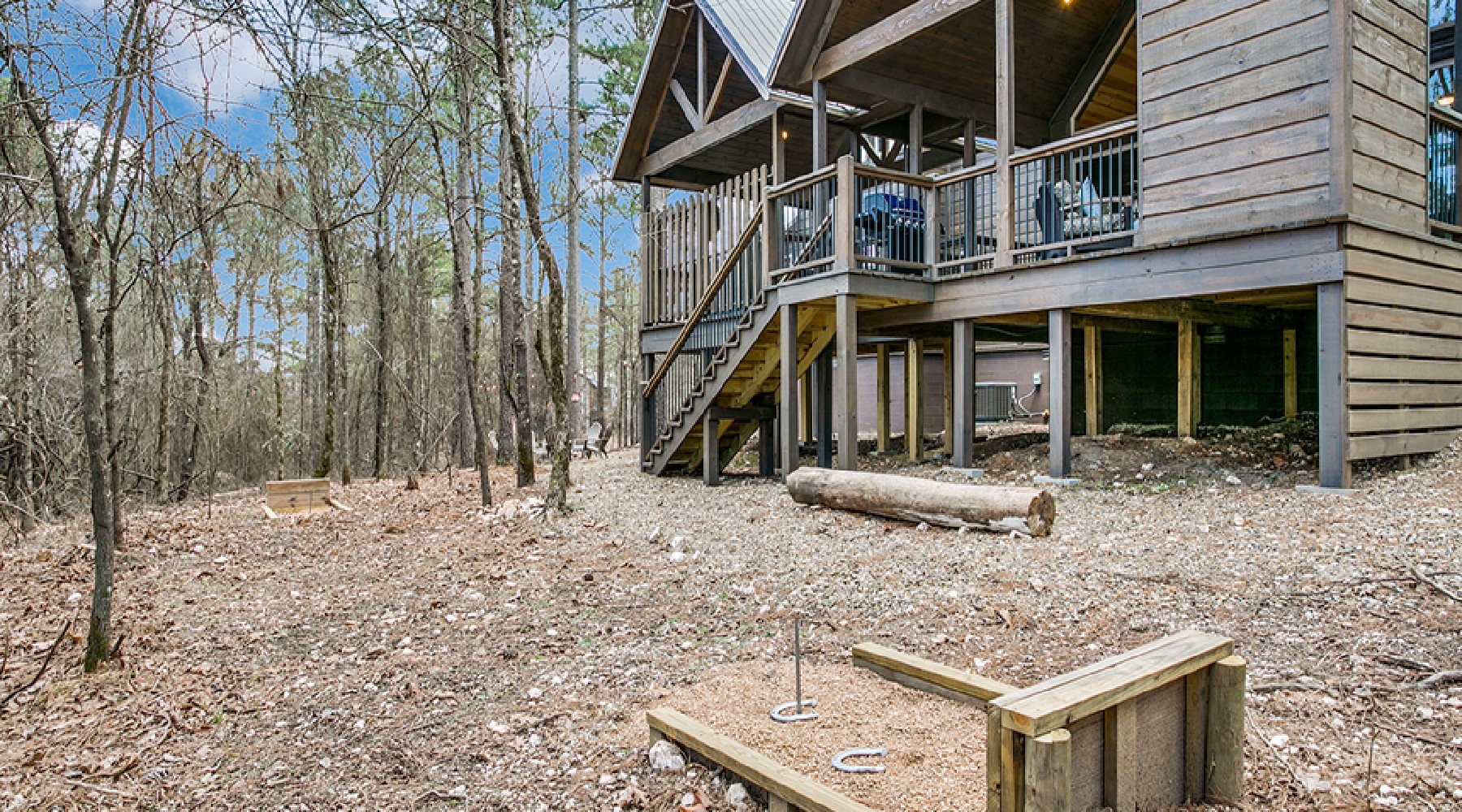 Into The Woods is a spacious 3-bedroom cabin located on a corner lot in Timber Creek Trails, phase 6. The living area has sofa and chair seating in front of a gas burning fireplace (seasonal October- April 15th). The TV is mounted above the fireplace and features a Smart TV for your app usage. The cabin has Direct TV channeling for all TV’s (PPV not available) The kitchen is equipped with dishwasher, wine fridge, microwave and glass cook top stove with electric oven. The cabinets are stocked with dinnerware, eating utensils, cookware, and bake ware. The dining table seats 8. Additional seating is provided at the island with stools.