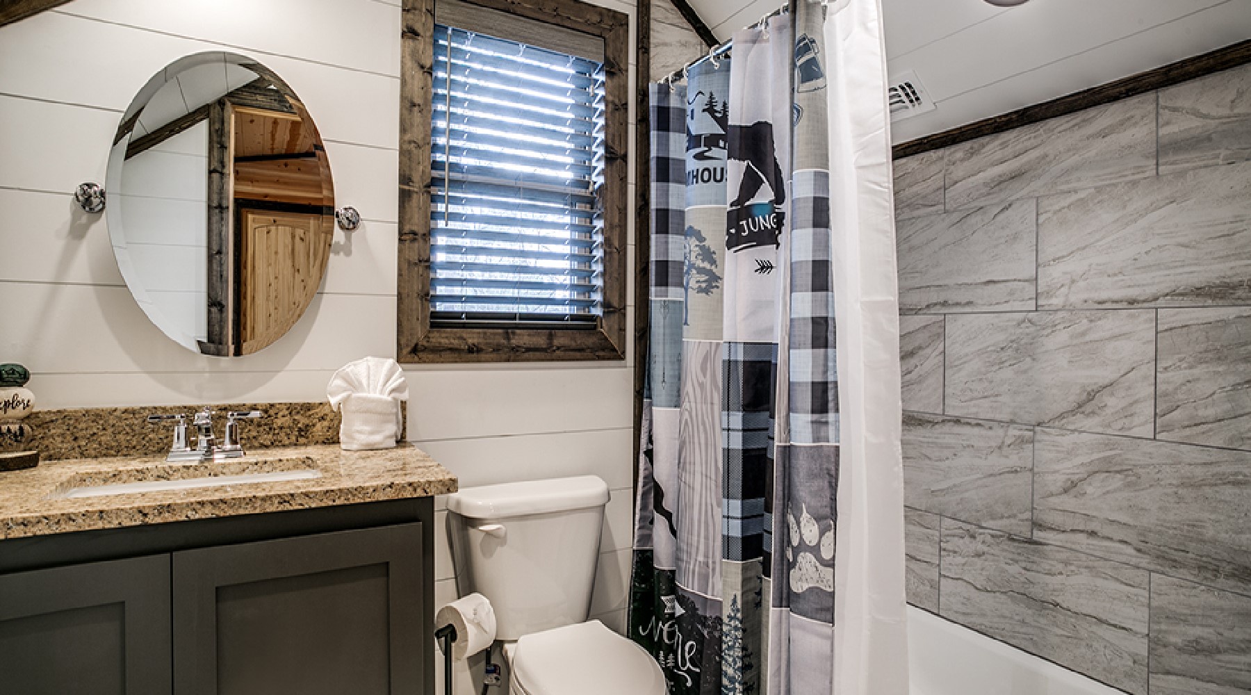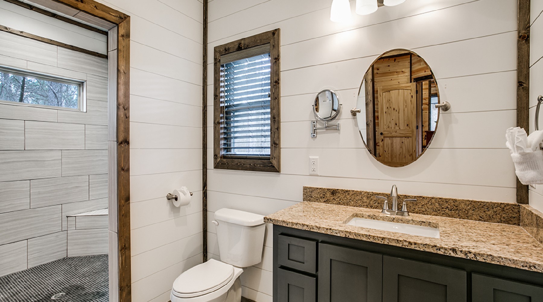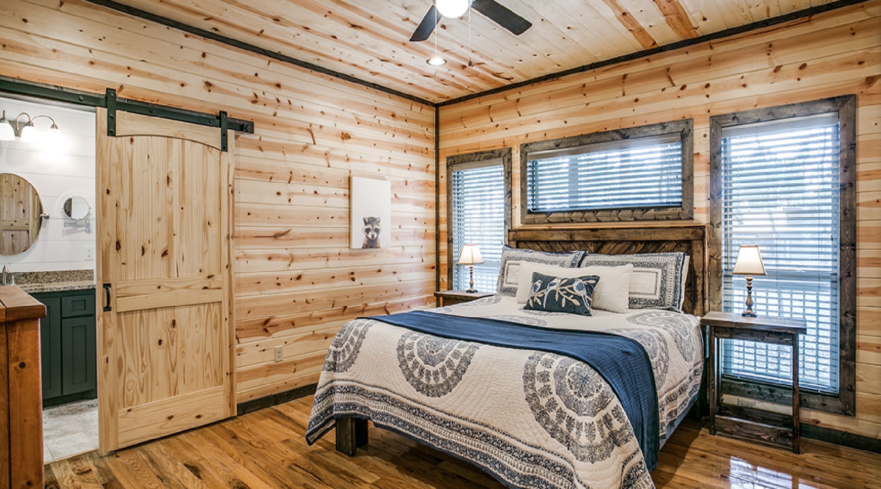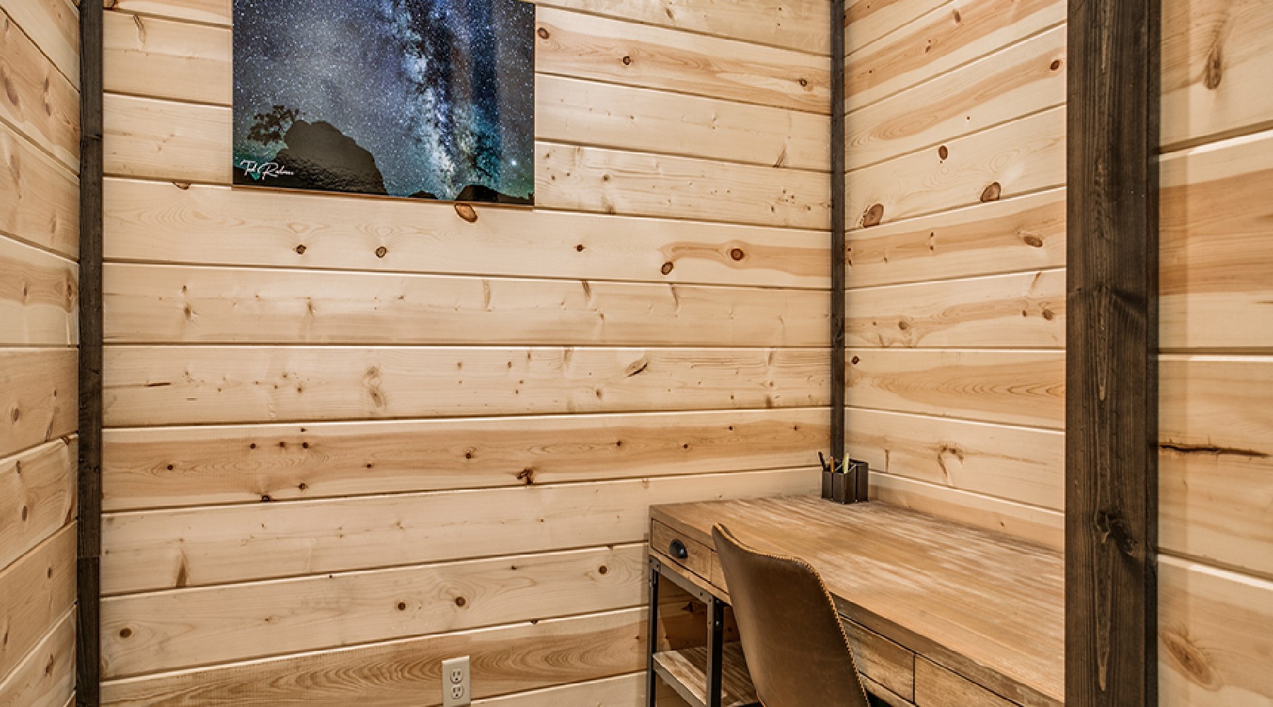Into The Woods is a spacious 3-bedroom cabin located on a corner lot in Timber Creek Trails, phase 6. The living area has sofa and chair seating in front of a gas burning fireplace (seasonal October- April 15th). The TV is mounted above the fireplace and features a Smart TV for your app usage. The cabin has Direct TV channeling for all TV’s (PPV not available) The kitchen is equipped with dishwasher, wine fridge, microwave and glass cook top stove with electric oven. The cabinets are stocked with dinnerware, eating utensils, cookware, and bake ware. The dining table seats 8. Additional seating is provided at the island with stools.