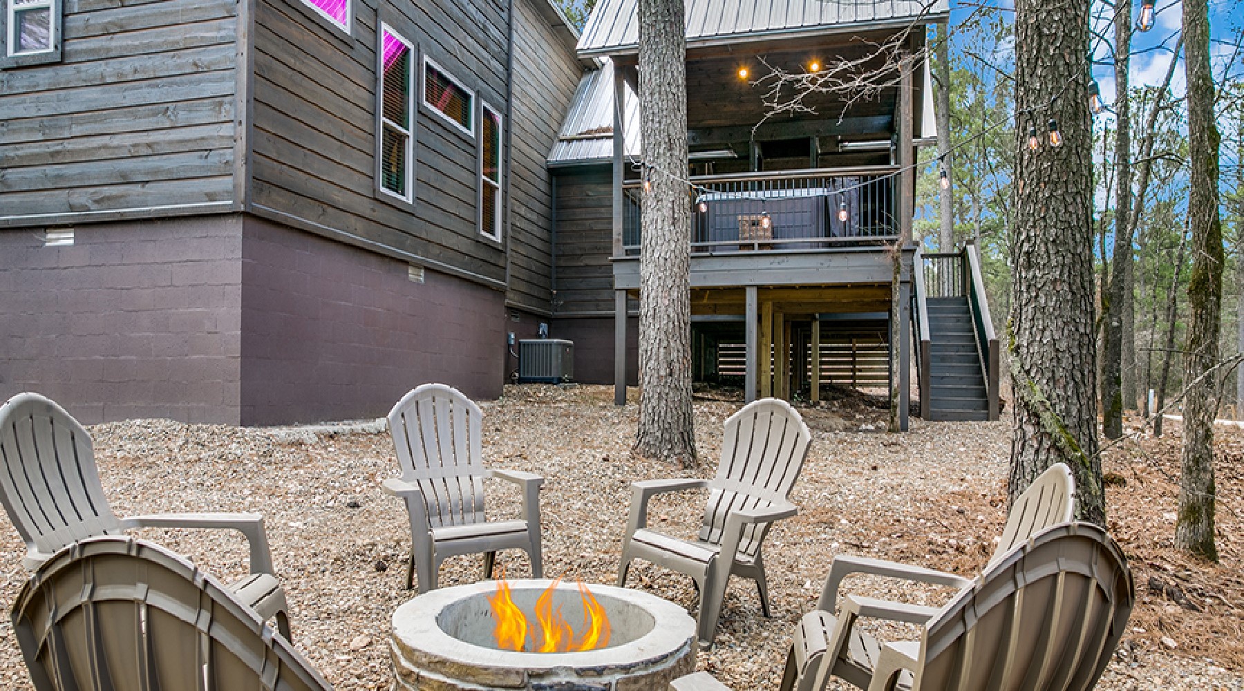 Out on the back deck there is seating in front of the gas log fireplace (seasonal October 15th – April 15th). There is a propane cook grill with propane provided. The hot tub sits in an alcove of the deck area. There is a Smart TV mounted above the fireplace. Down the step to the gravel grounds there is a circular fire pit for roasting marshmallows and enjoying a wood fire. The circular drive allows for easy pull-through of trailers.