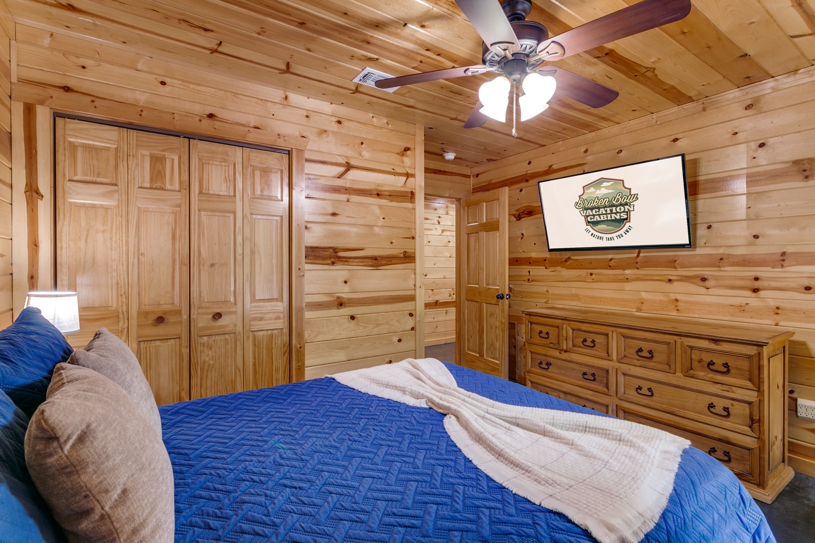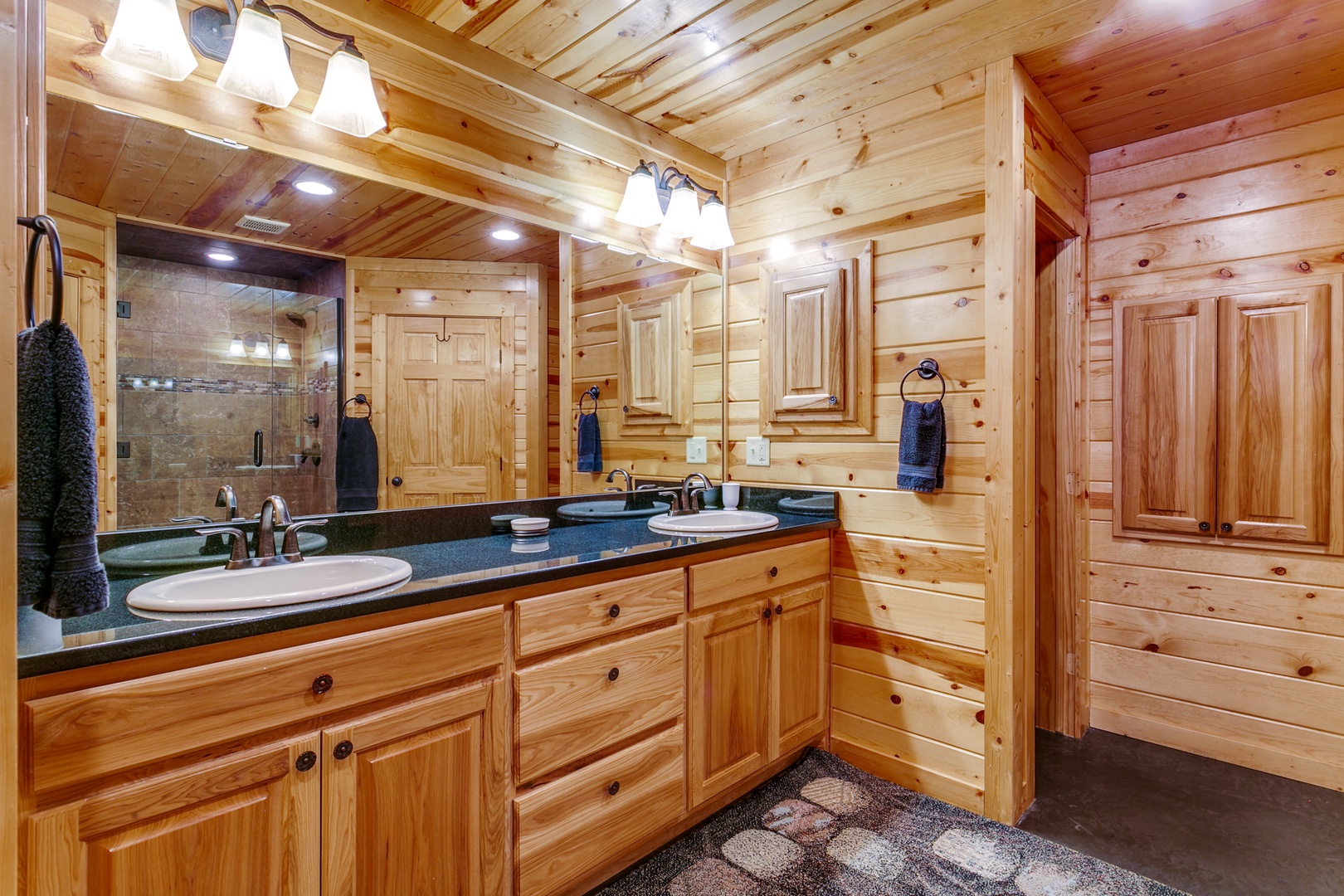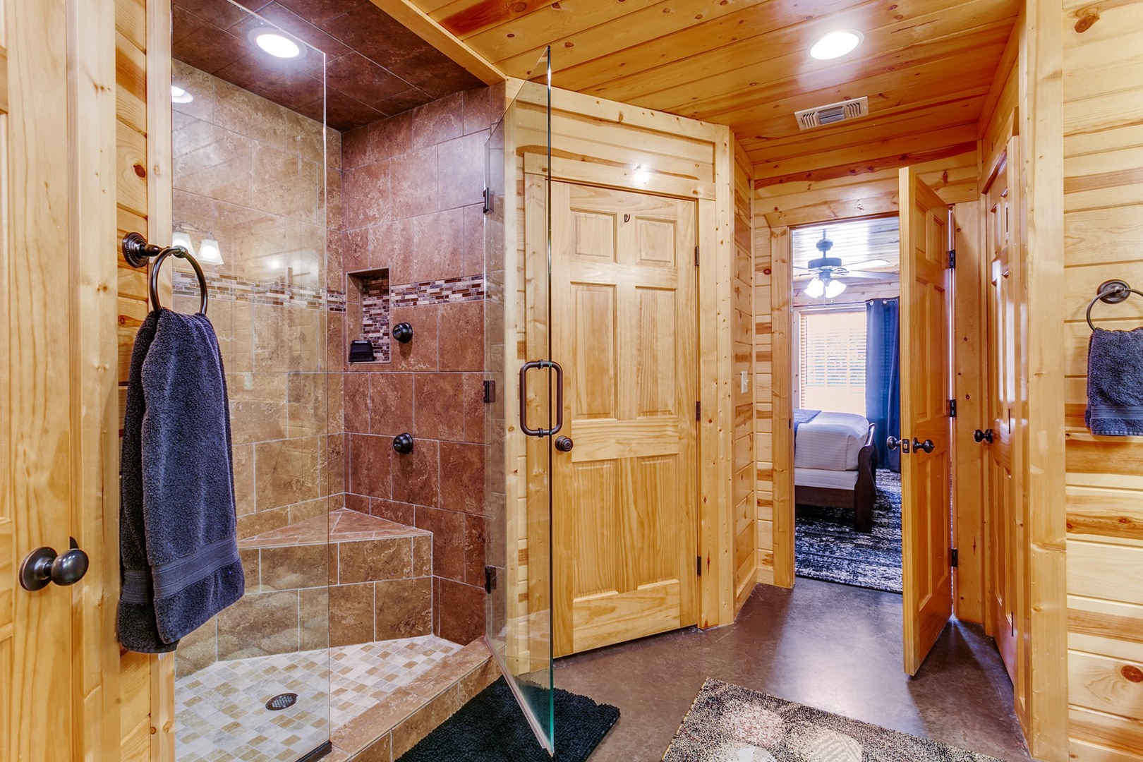 There are 2 downstairs bedrooms The bedroom to right of living area has a king bed, a dresser for storage of personal items and a TV. The attached bath has an oversized tile shower and double vanities. The bedroom to the left has a queen bed, a closet and dresser for storage, & TV. This attached bath has a shower/tub combo and single vanity.
