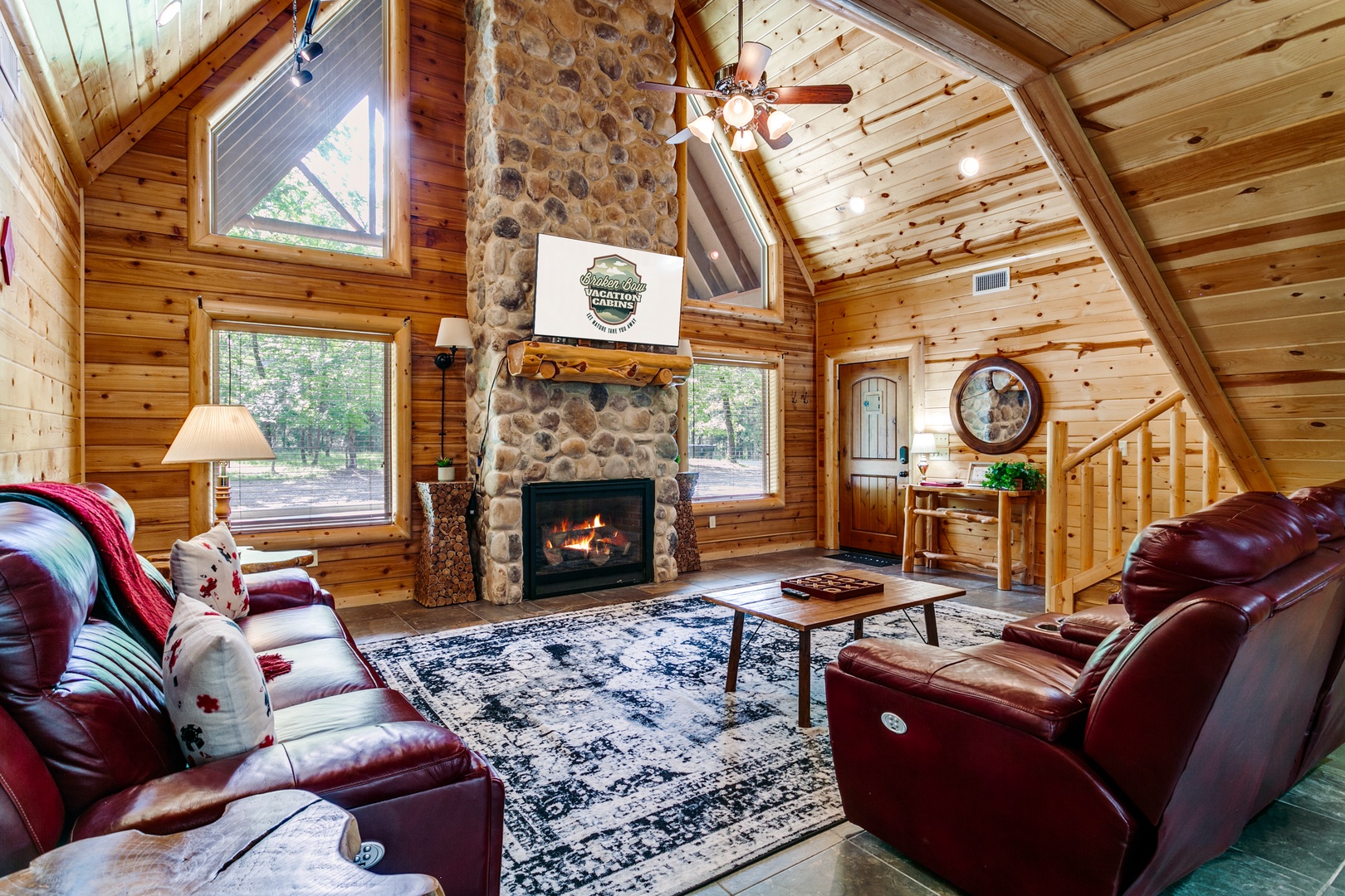 The warm welcoming interior offers recliner style sofas in from of the gas burning fireplace (seasonal (Oct-Apr) and large screen TV.