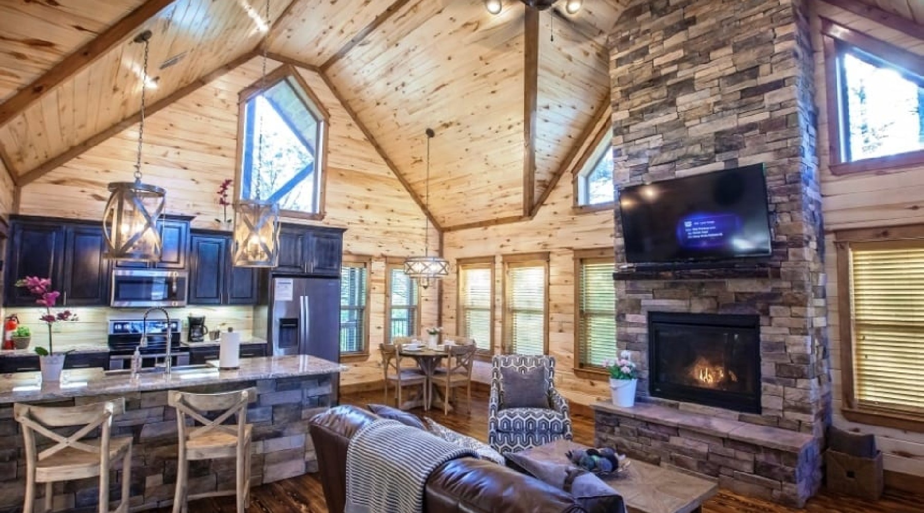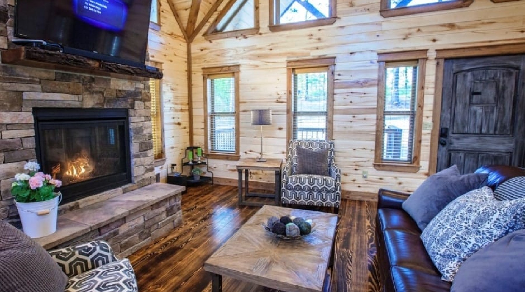 The living room has cozy seating in front of gas fireplace (seasonal October 15th – April 15th) and HGTV mounted above the hearth. DirecTV with premium movie channels (PPV not available)