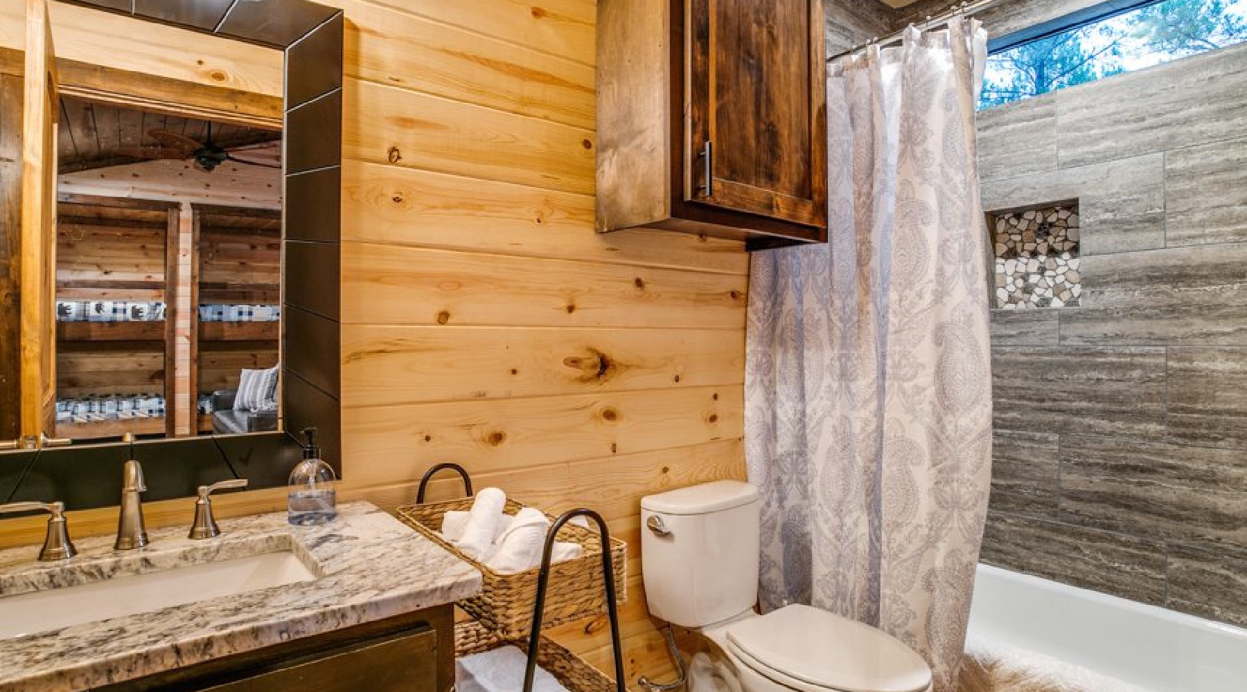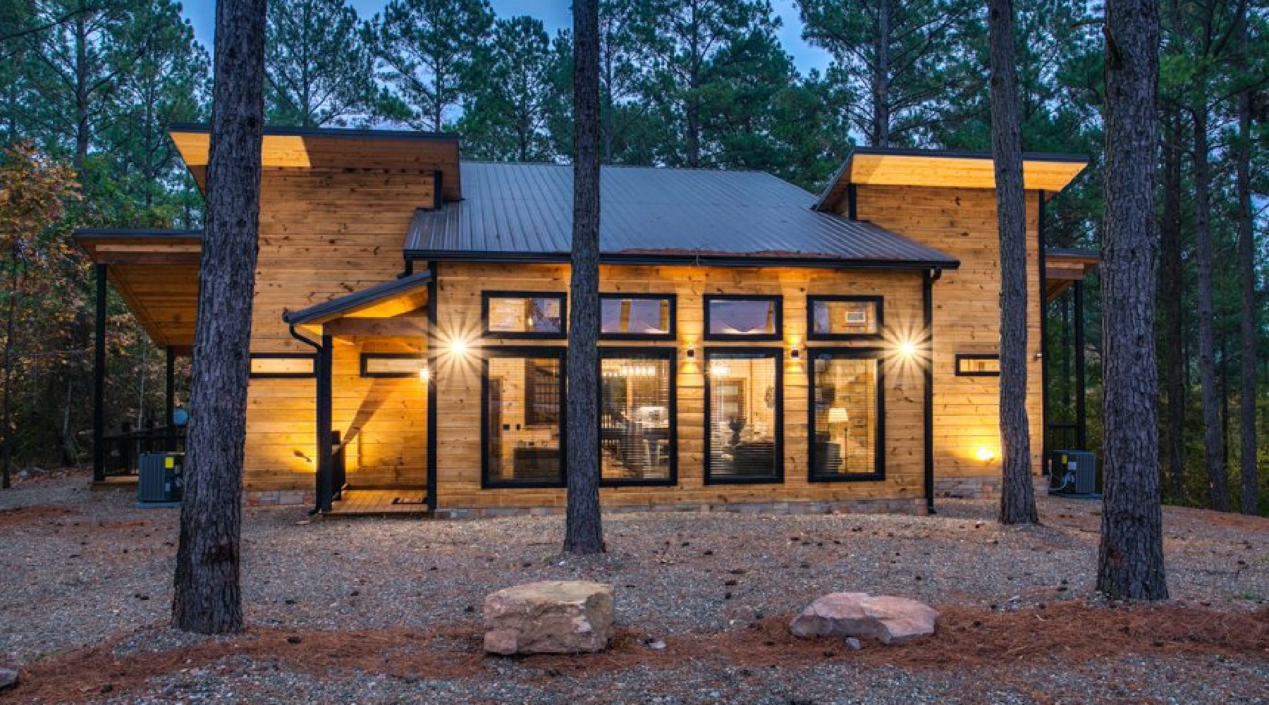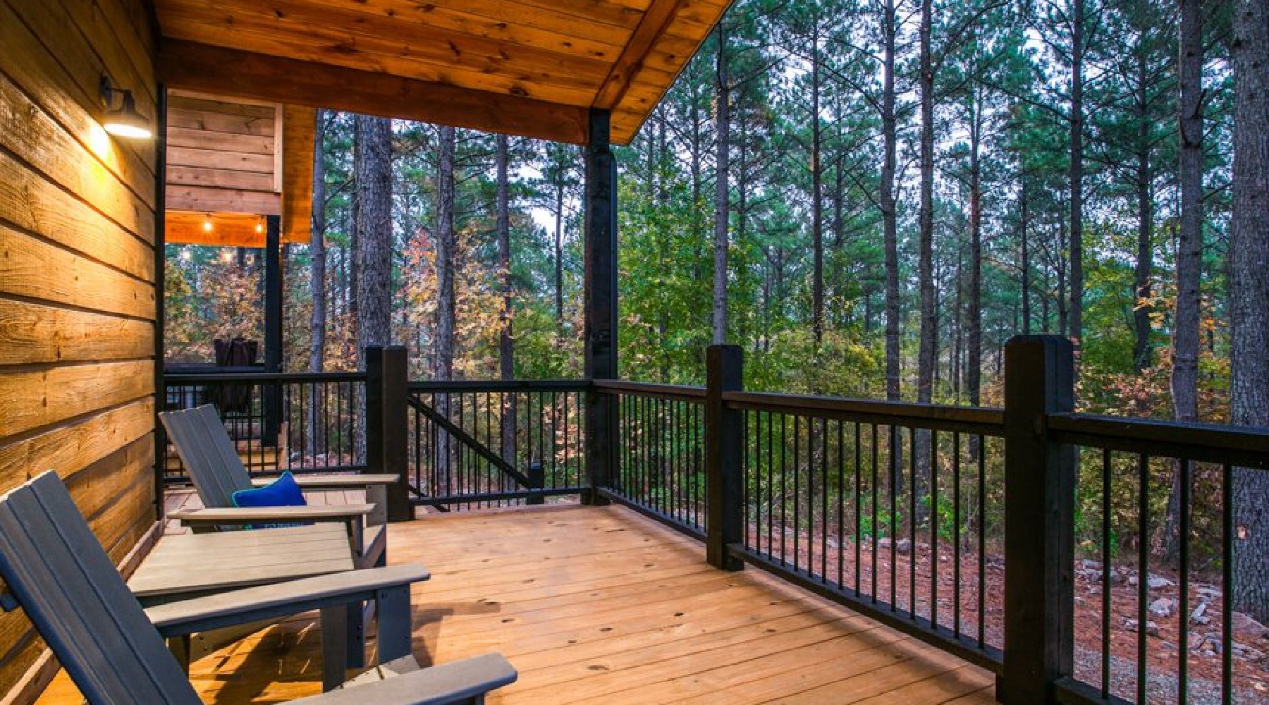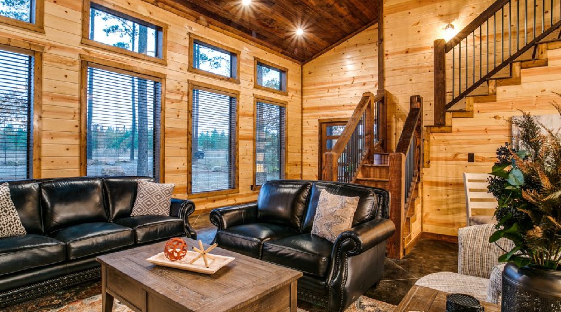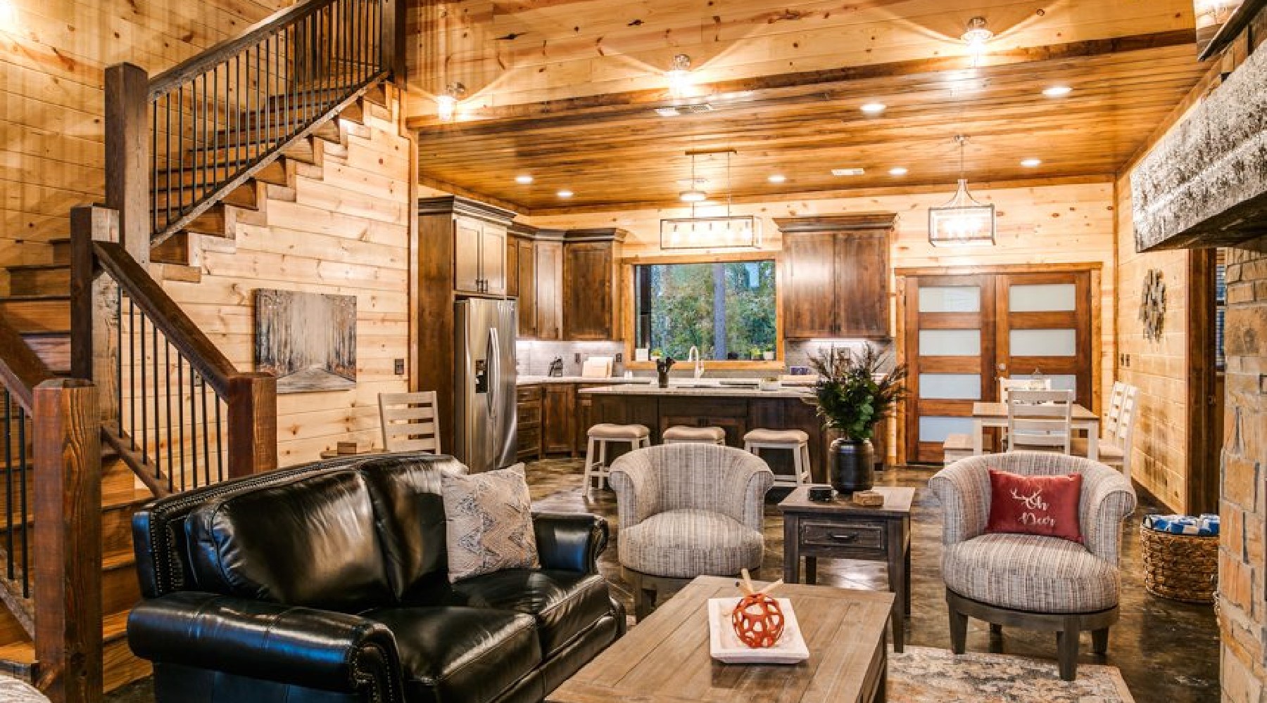 This spacious cabin has a warm, contemporary interior. Floor to ceiling windows flood the open concept space with natural light and views of beautiful Oklahoma pines. The cabin sleeps up to 8, with two master bedrooms each having a king bed and En suite bathroom. The third bedroom is the upstairs bunk room.