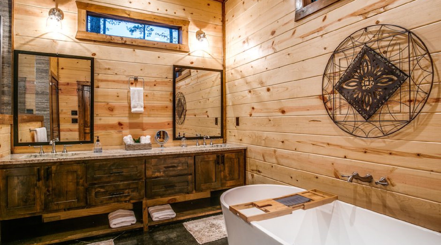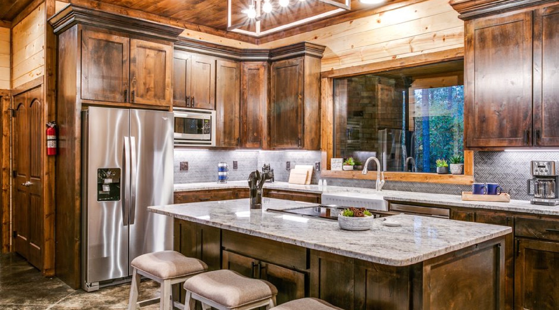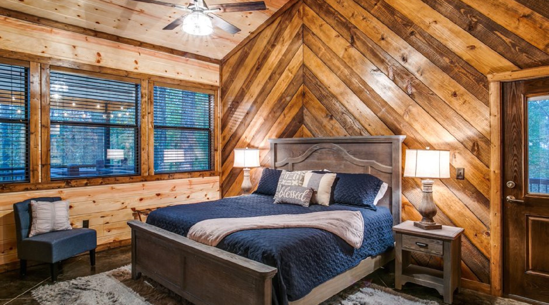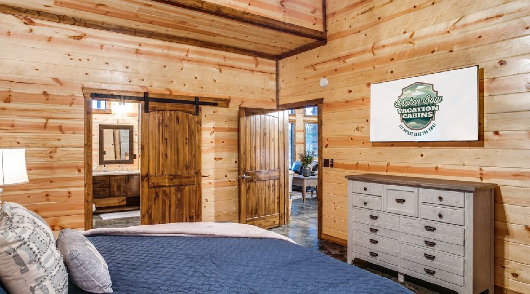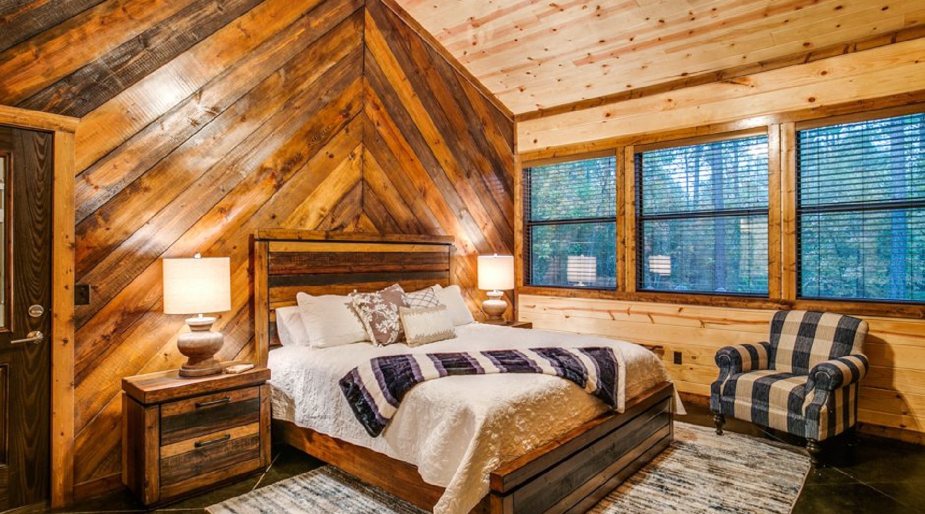 This spacious cabin has a warm, contemporary interior. Floor to ceiling windows flood the open concept space with natural light and views of beautiful Oklahoma pines. The cabin sleeps up to 8, with two master bedrooms each having a king bed and En suite bathroom. The third bedroom is the upstairs bunk room.