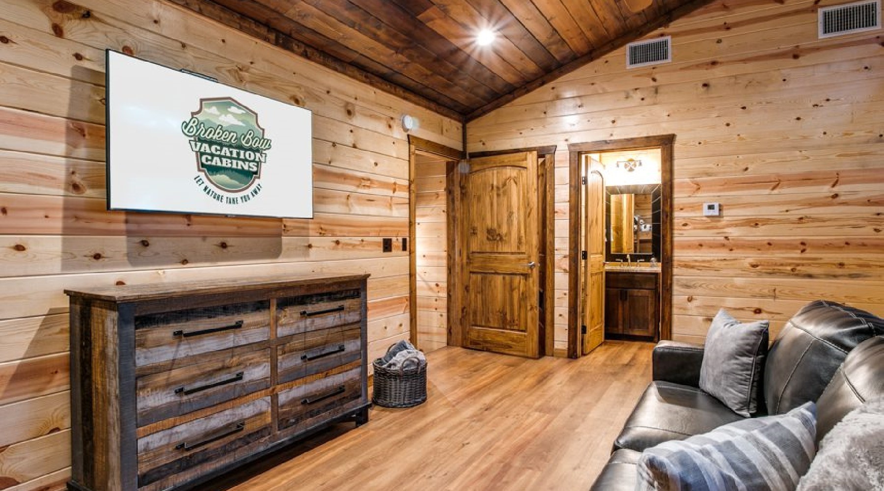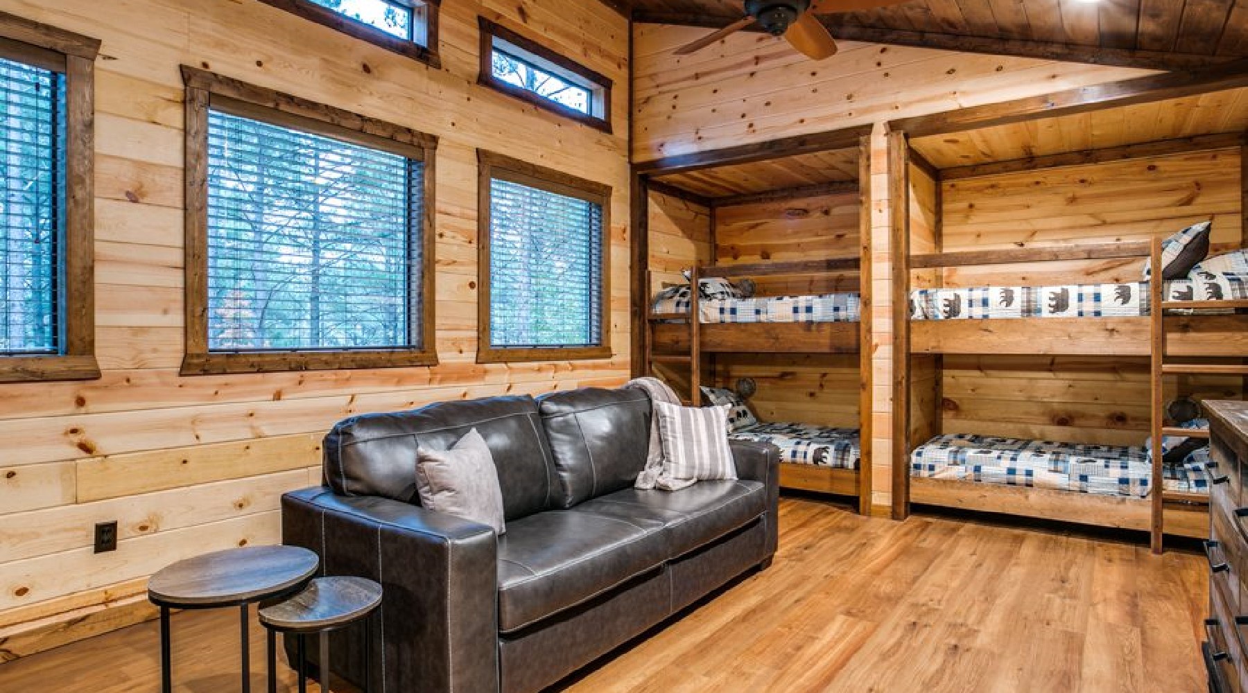 - The upstairs bunk room has a sofa, a dresser and a TV.
