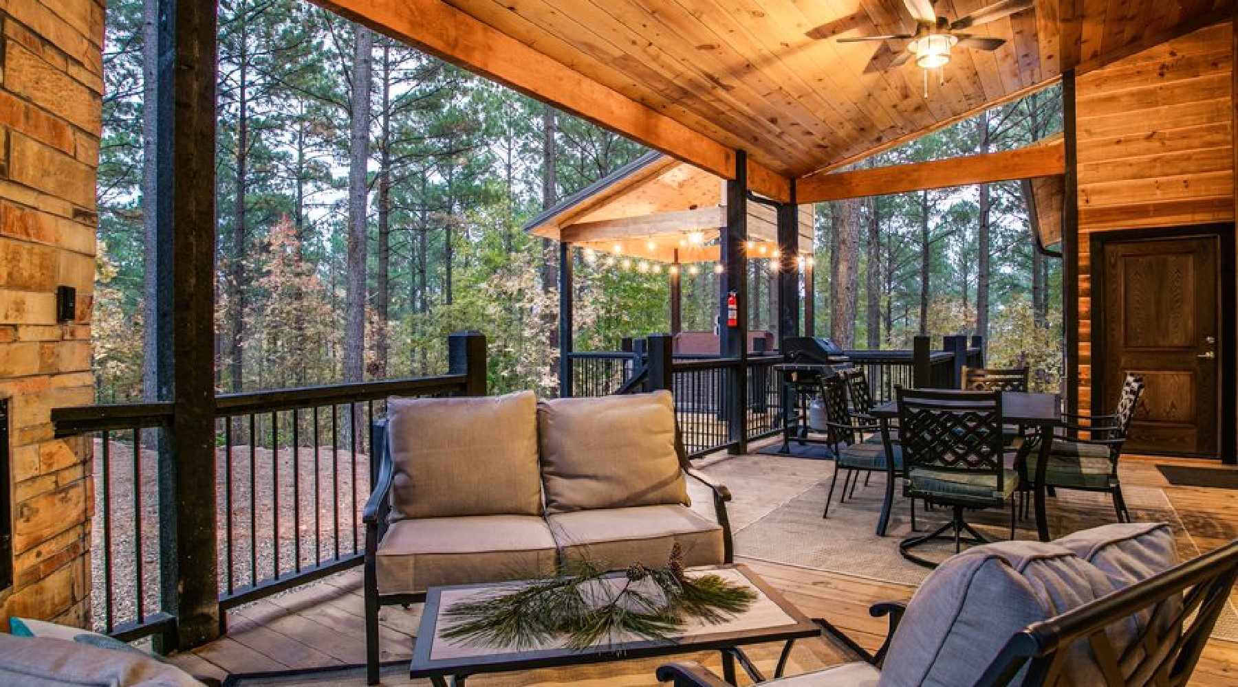 The back deck area offers a dining table for 6, a propane cooks grill (propane provided), and a sitting area in front of a gas burning fireplace (seasonal October 15th – April 15th). The TV is mounted to the wall and is on an adjustable arm for viewing from the hot tub area. The hot tub sits in an alcove of the deck area. On the gravel grounds there is a circular fire pit with Adirondack seating. Out on the gravel yard there is a playset for the children to enjoy. Moonlight Pines is minutes away from the local restaurants, Beavers Bend State Park, Broken Bow Lake and other area attractions.