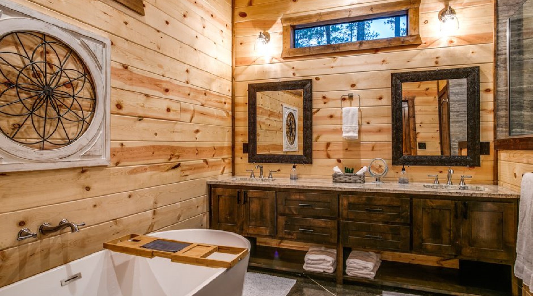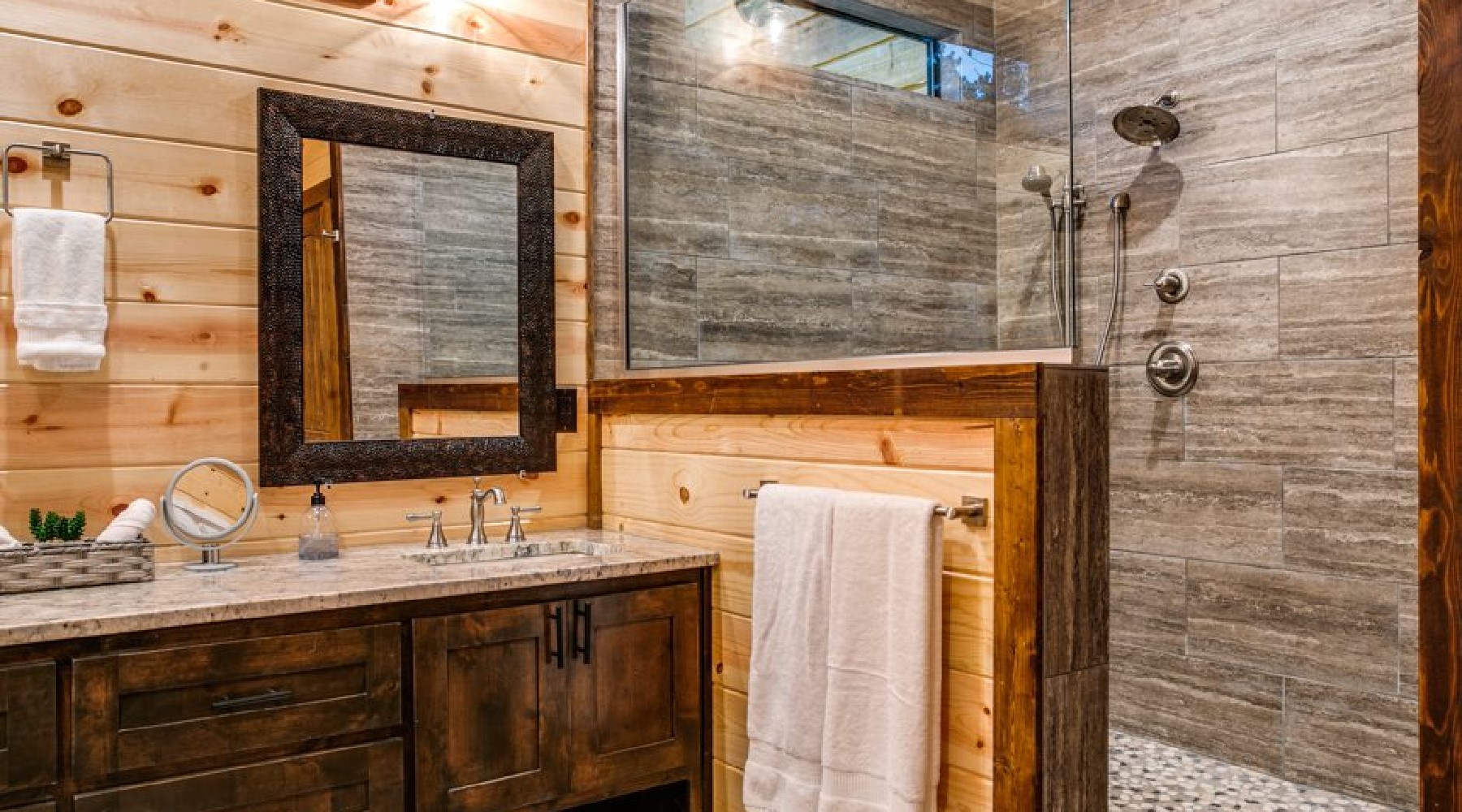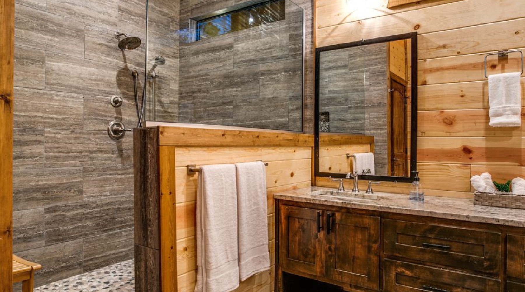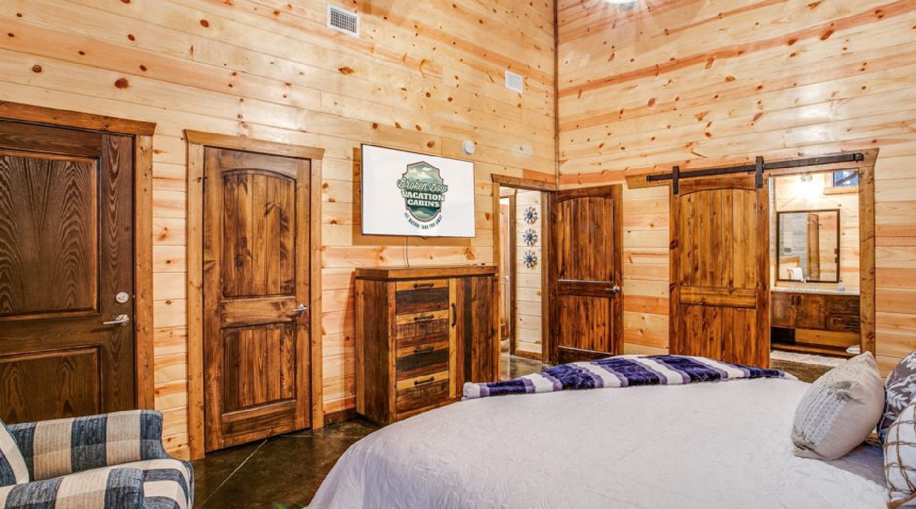 Both master bedrooms have a private sitting porch as well as another door to access the back deck common area. There is a dresser for storage of personal items and a large screen TV with streaming content. The ensuite bathrooms have double vanities, an oversized walk-in tile shower and a soaking tub. The toilets have doors for privacy.