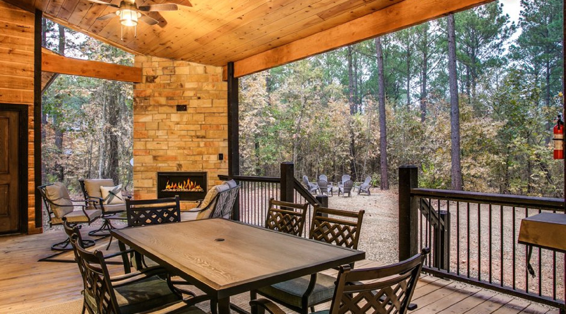 - The back deck area has a dining table with seating for 6