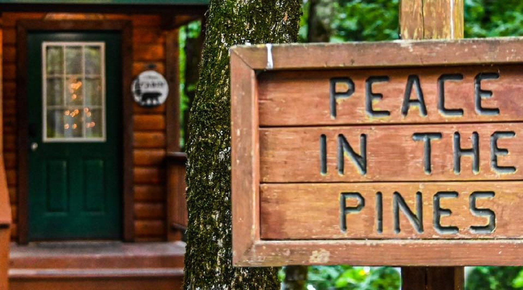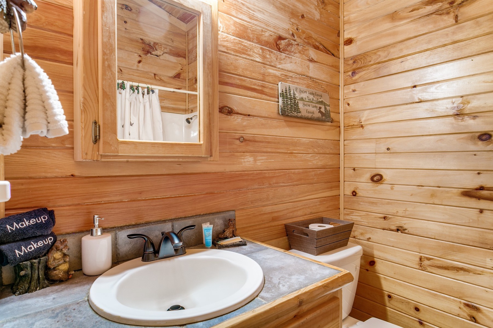 This 2 bedroom, two bath cabin is set in the woods with a private covered deck, outdoor hot tub, and wood burning fire pit. The master bedroom has a king sized bed, the second bedroom has a queen sized bed. Both bathrooms have a shower.