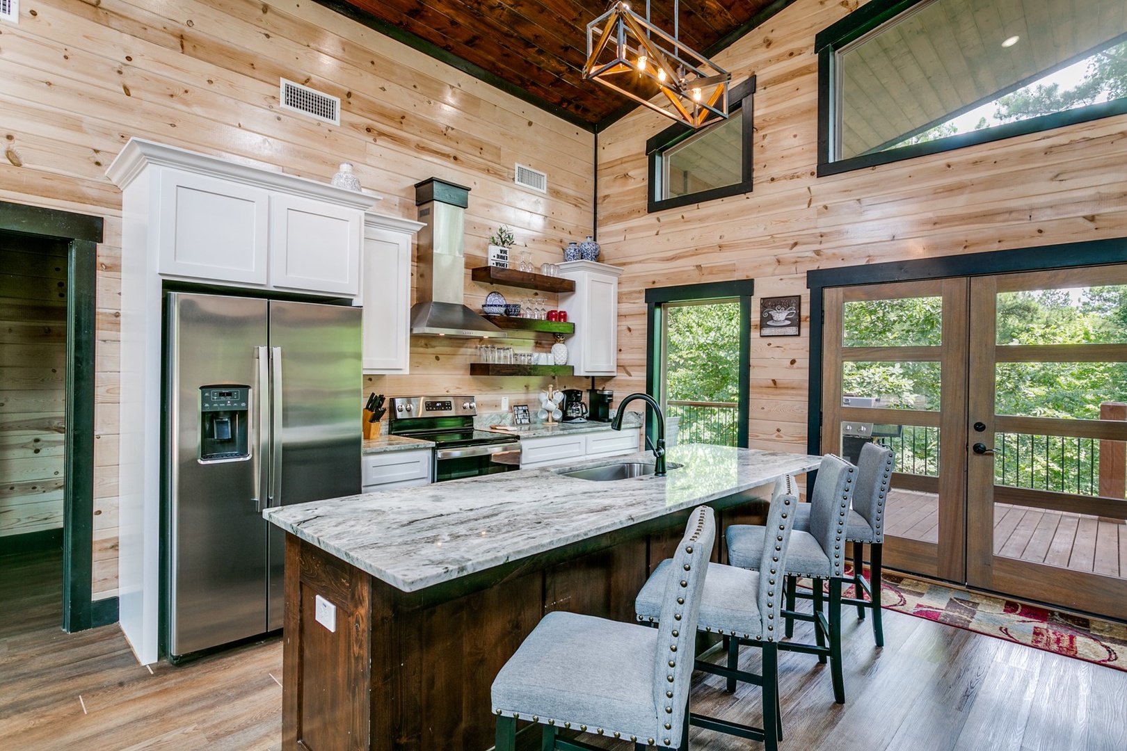 The Polaris cabin is a 2 bedroom that can accommodate up to 6 guests. The main area is an open concept that includes the living, kitchen and dining areas. The living area has seating of a sofa ( pulls out to make a queen sleeper), and love seat in front of the gas log fireplace (seasonal October- April). There is a timer switch on the side wall to ignite the logs. The TV is also mounted on the hearth and is equipped with streaming ability.