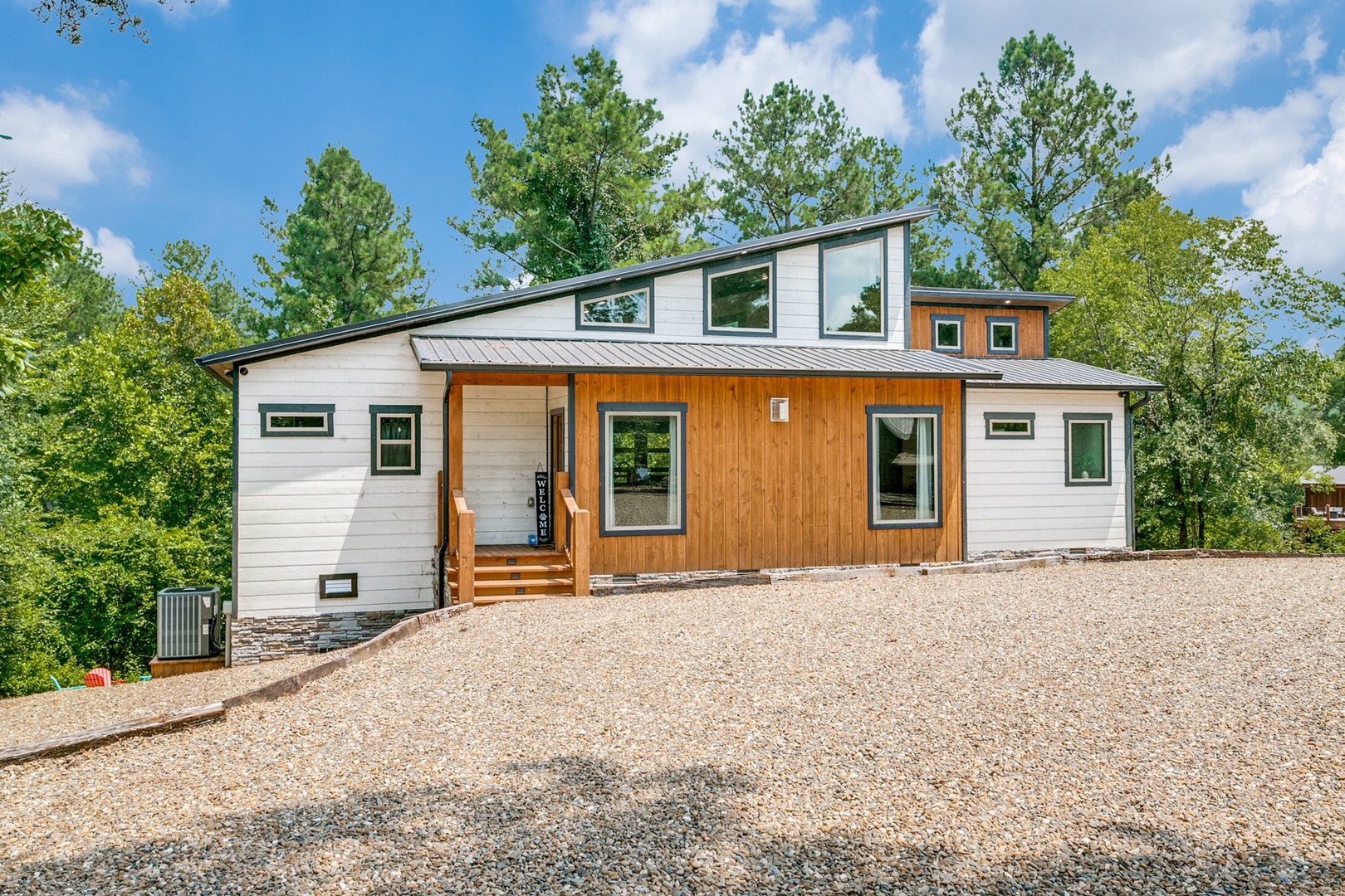 The driveway has ample space to pull a trailer. There is a side drive that allows for each pull trough.