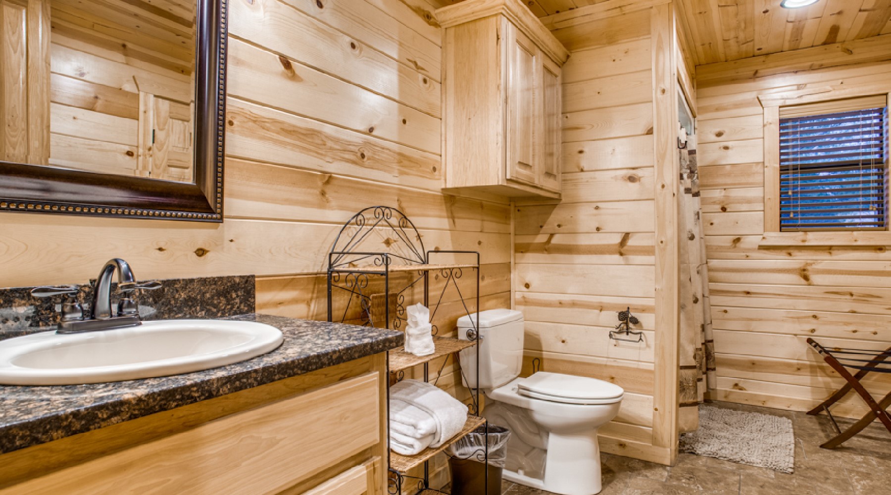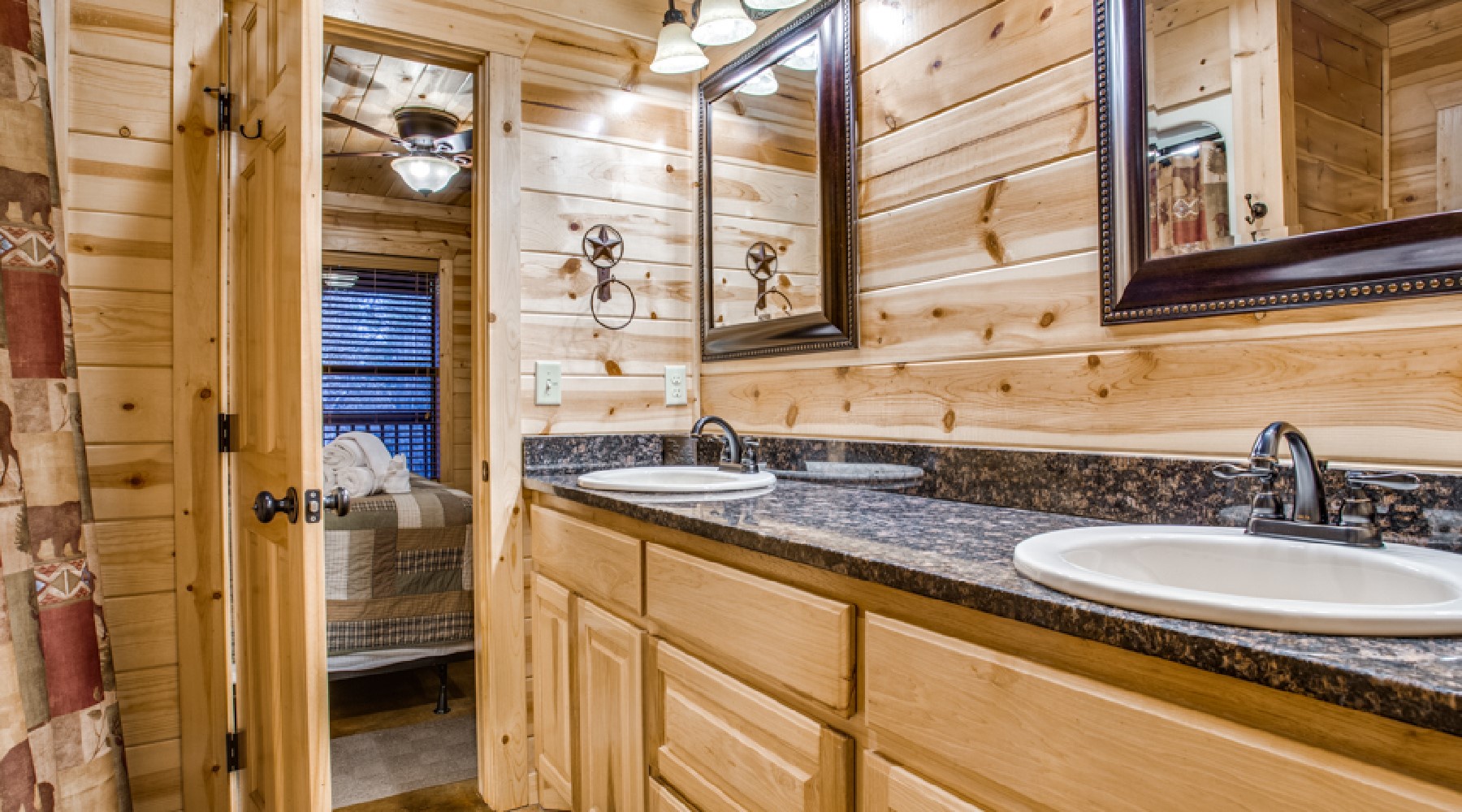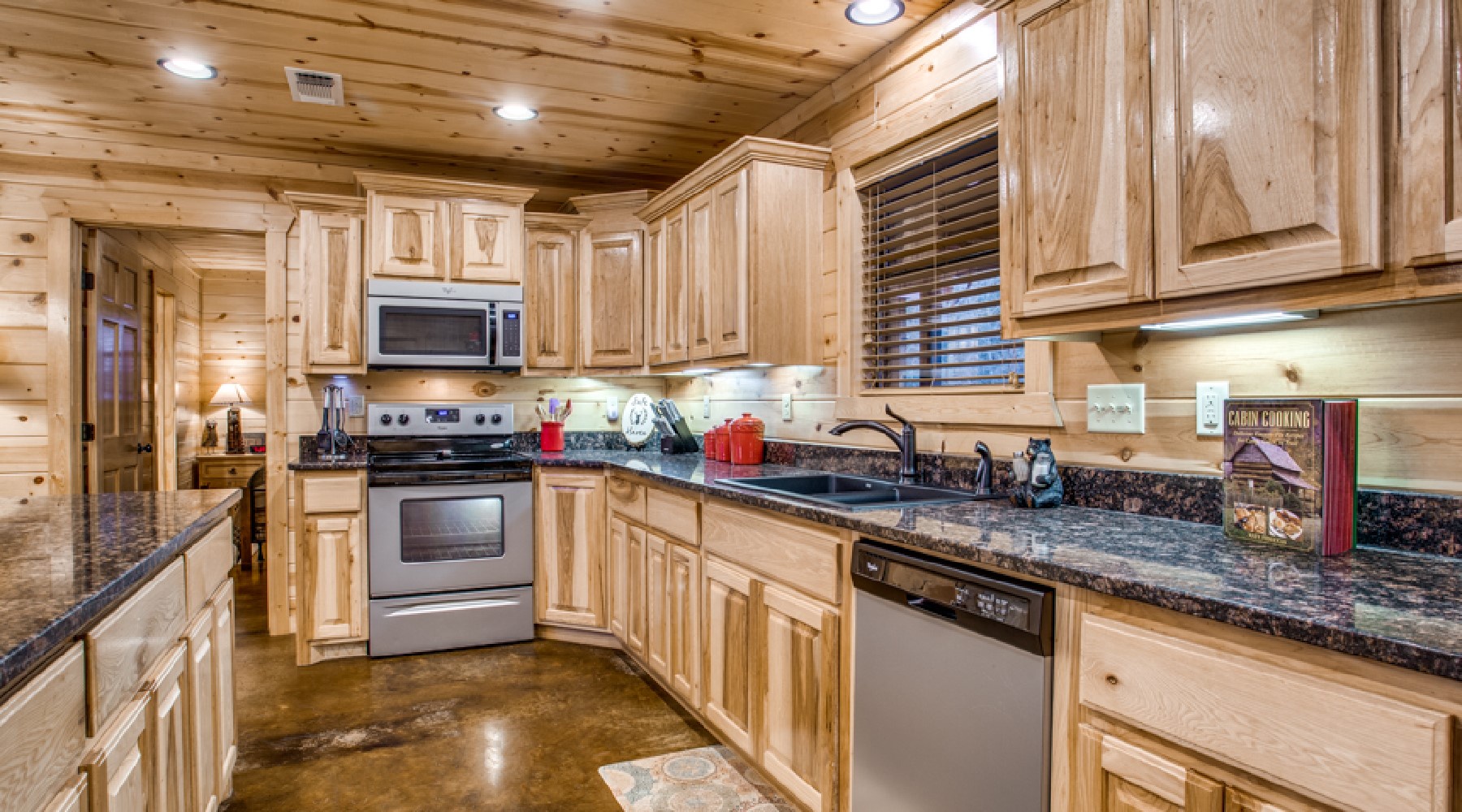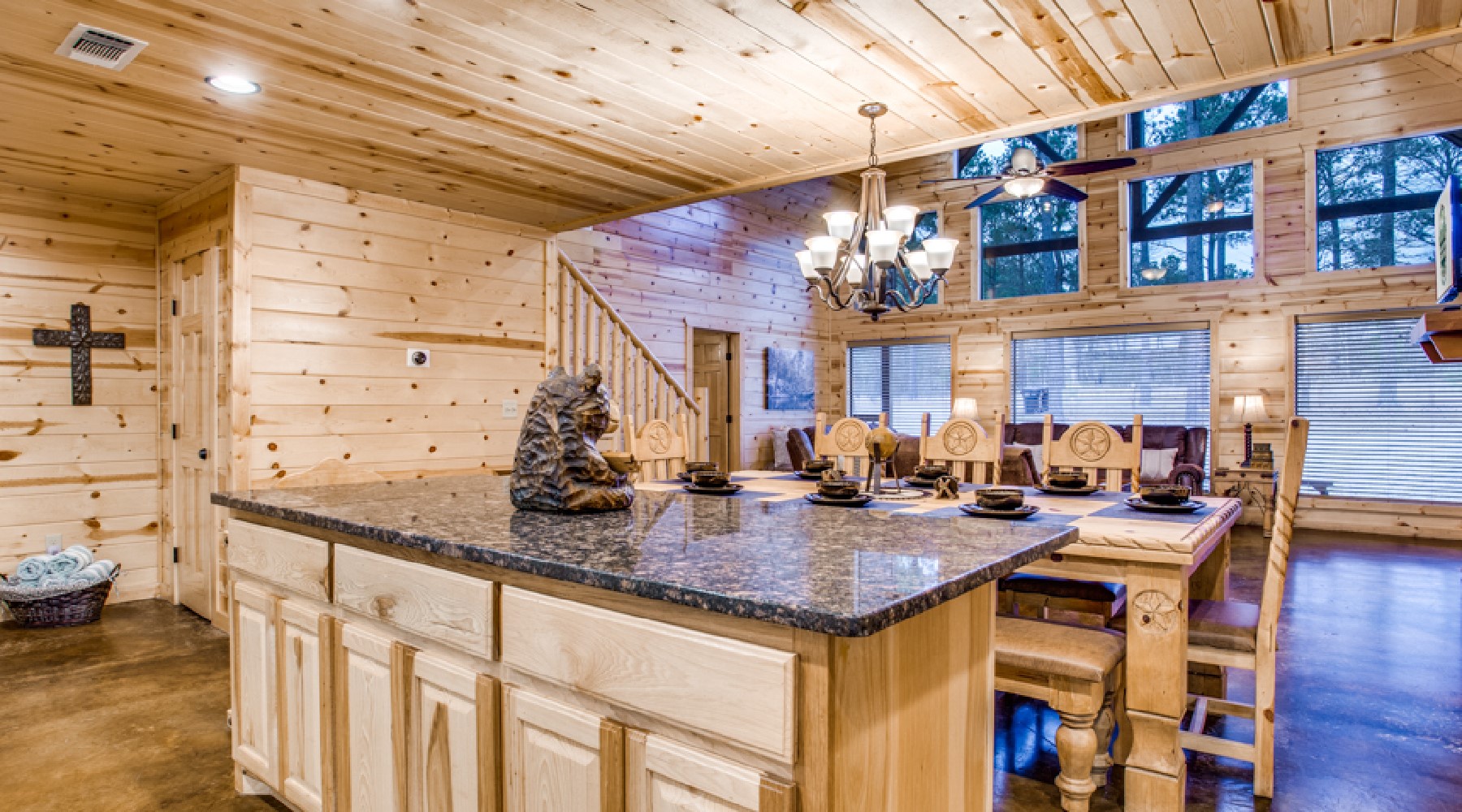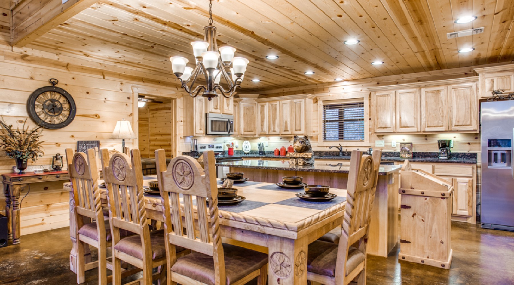 Safe Haven’s living area offers recliner seating in front of a gas log fireplace with easy on/off switch. The large screen HDTV offers access for your personal subscriptions and is mounted over the natural rock hearth. The nearby kitchen is equipped with glass top stove/oven, side-by side refrigerator, microwave and dishwasher. Small appliances of coffee maker and crock pot are stocked in the cabinets as well as dishes, cookware, bake ware and utensils for cooking and eating. There is room for everyone to help with meal preparations around the granite island. A custom wood dining table offers seating for 8.