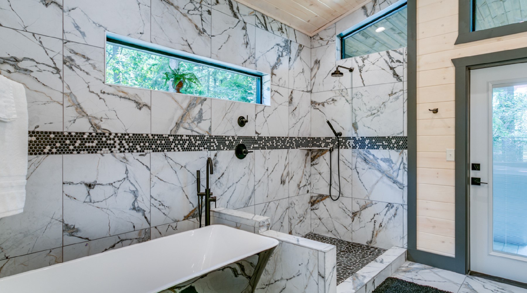 - Large walk-in tiled shower in bathroom