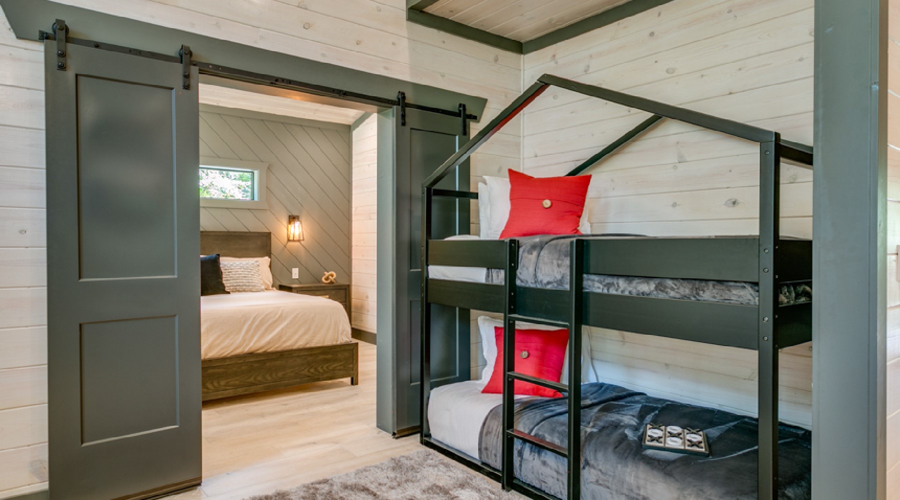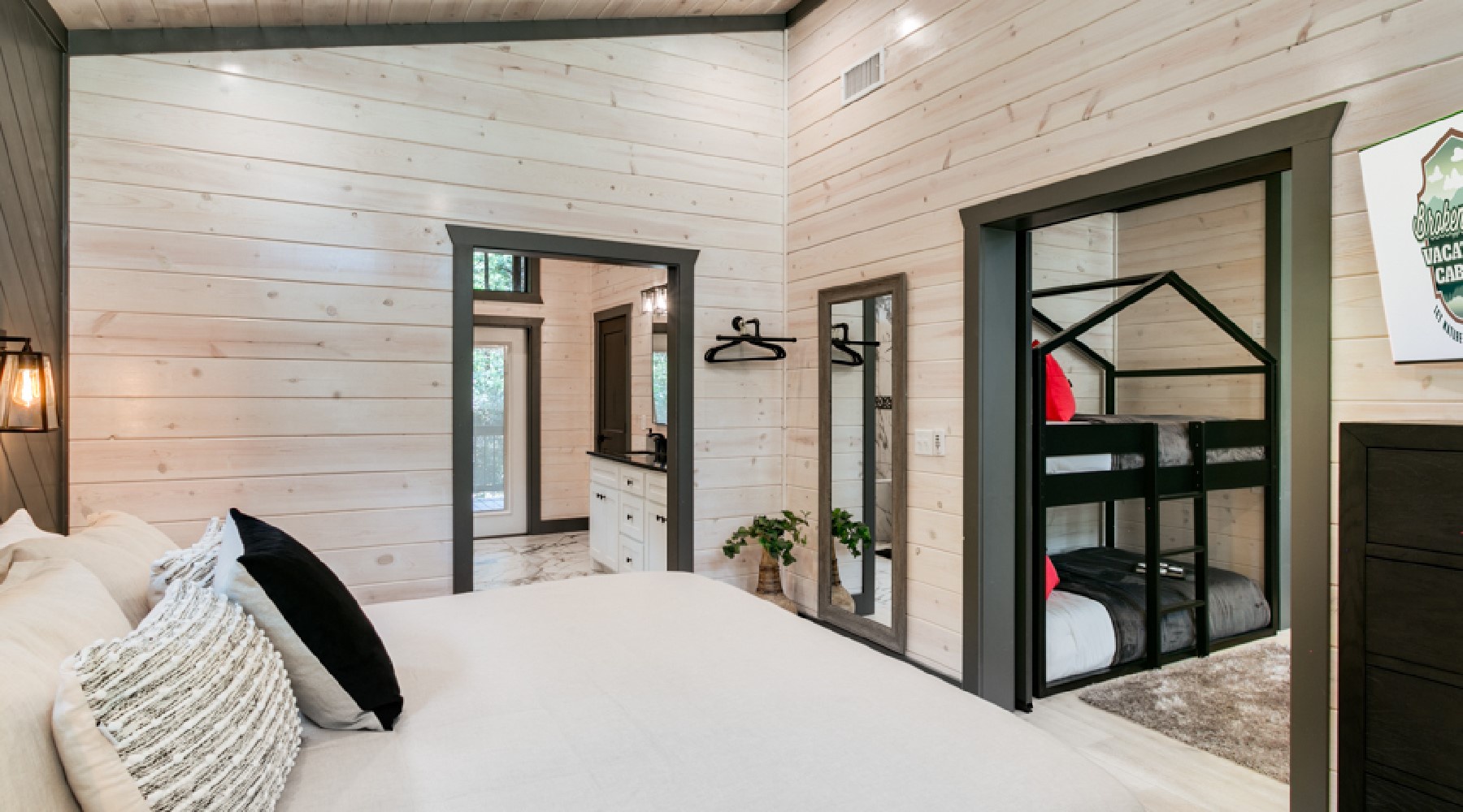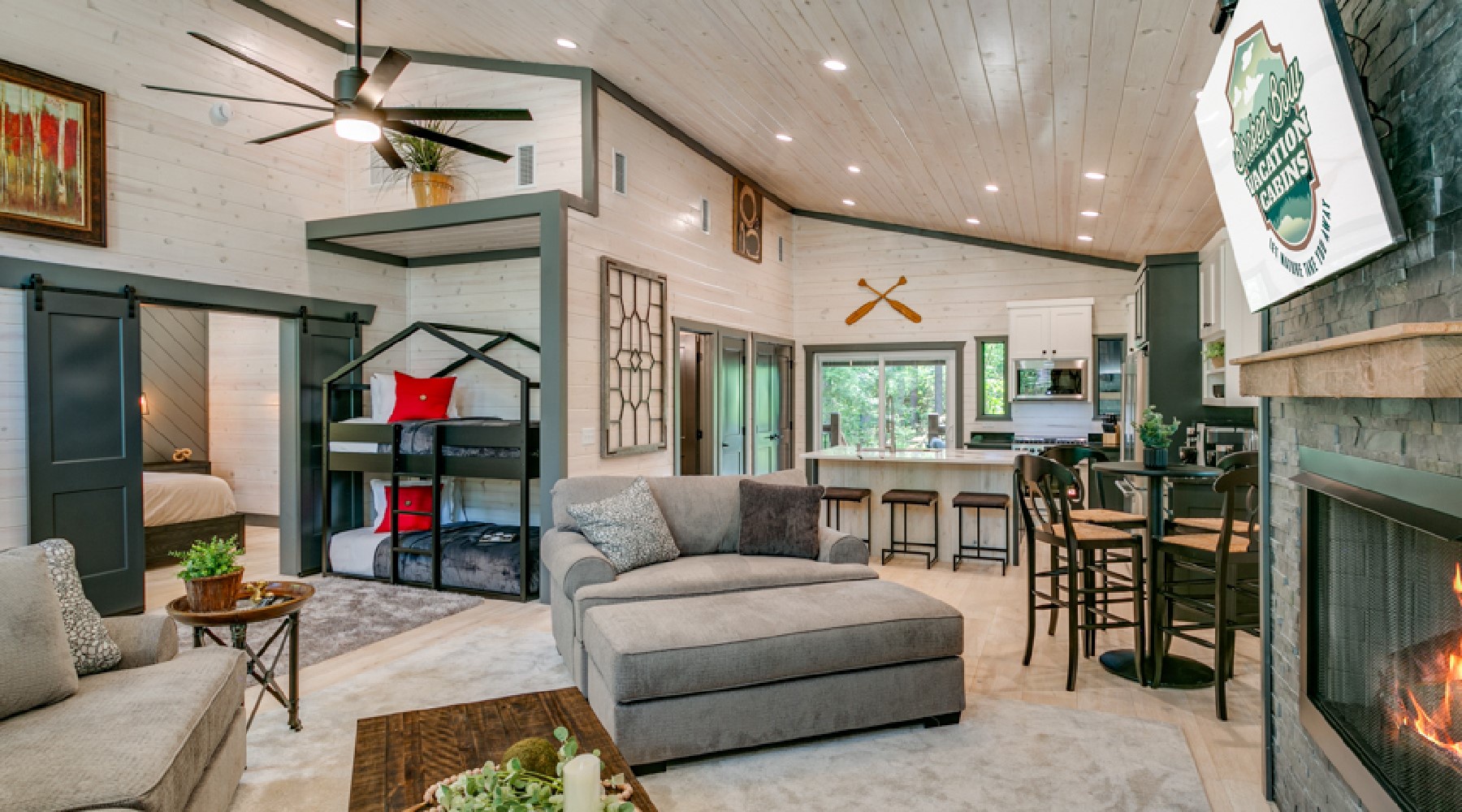 Sleeping arrangements in this beautiful cabin accommodate 2 adults in a king size bed located in the bedroom with the privacy of sliding barn doors, and a Queen sized sleeper sofa in the living room. Just outside the barn doors there are a handsomely designed set of bunk beds (small twin mattresses) that will accommodate 2 children. The bedroom has a chest of drawers and 2 nightstands for storage of personal items. There are hangers available for hanging garments on a pipe design fixture. Fall asleep watching your favorite show on the Smart TV with streaming capability mounted to the wall.