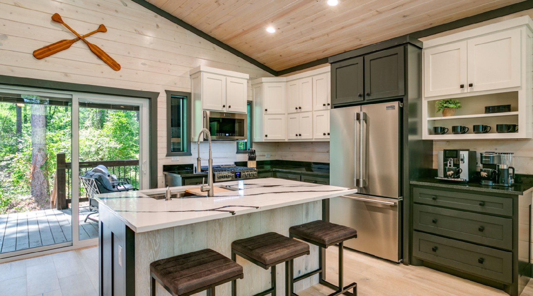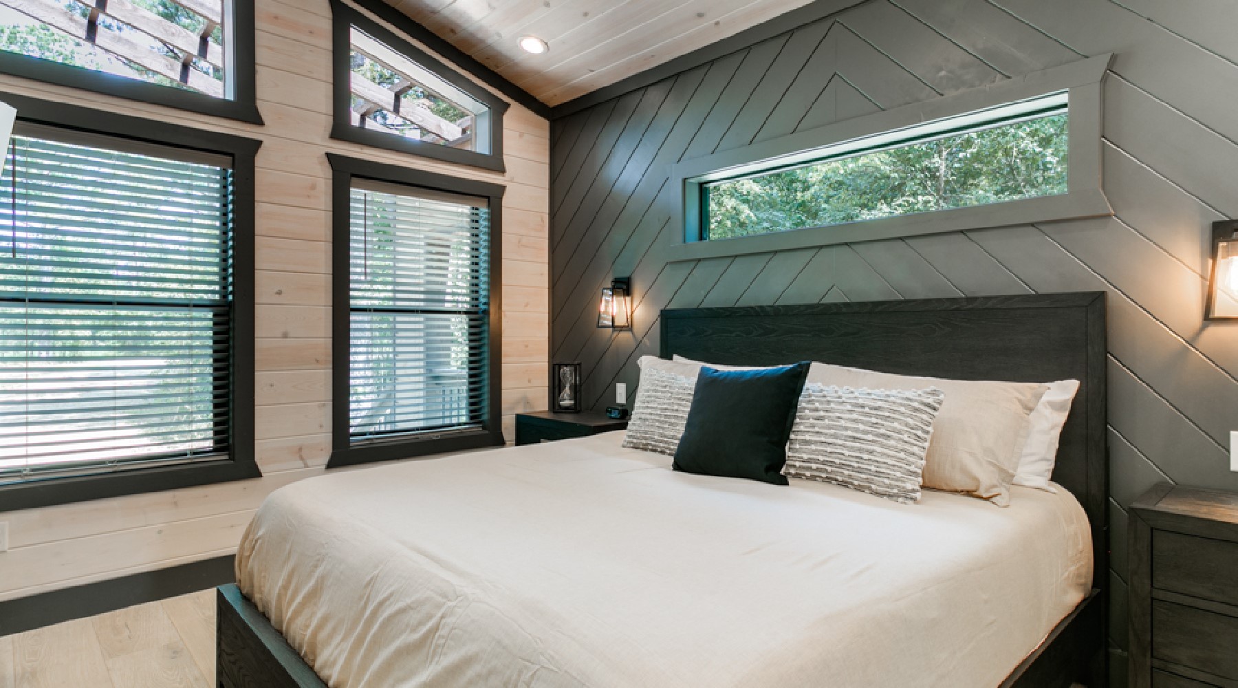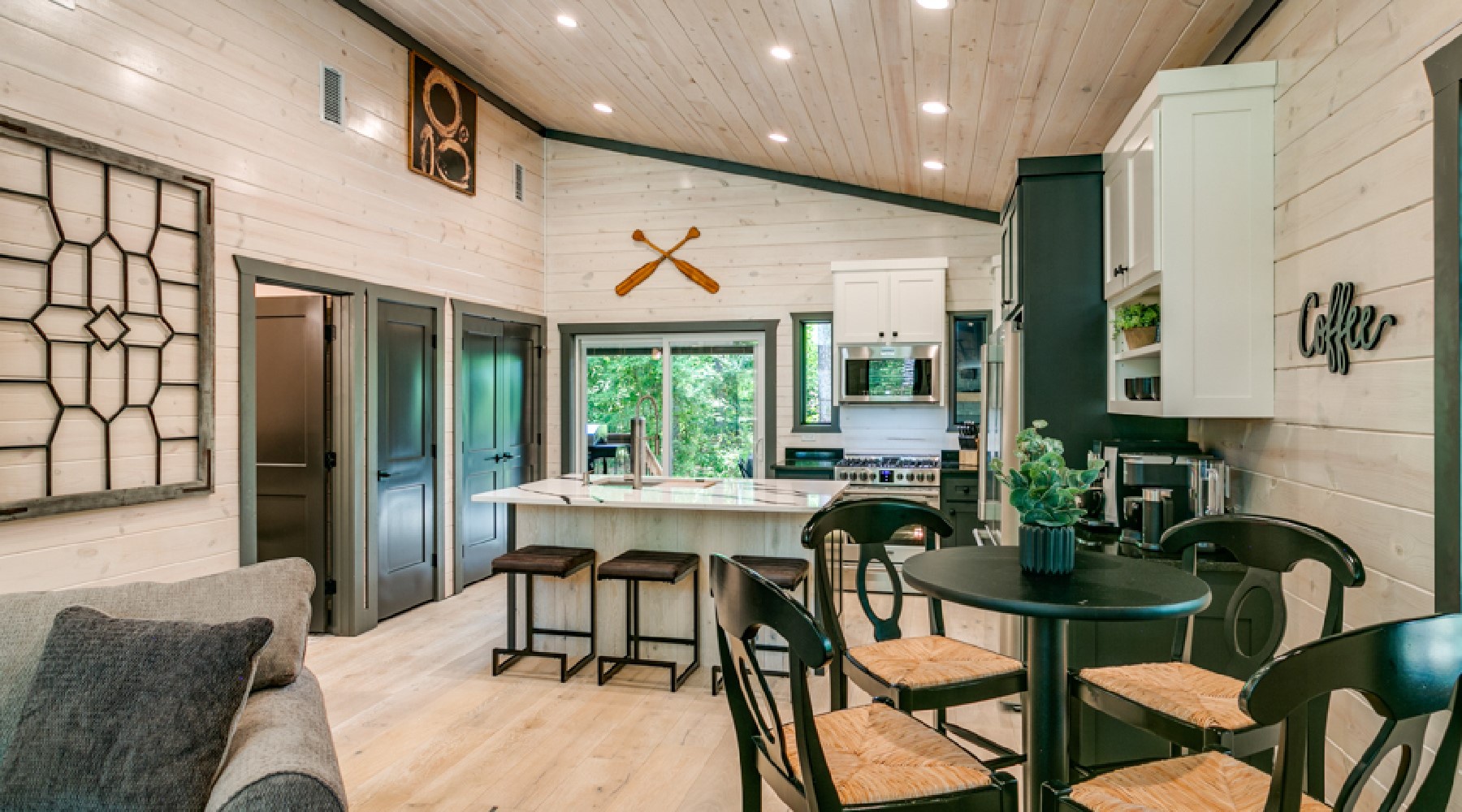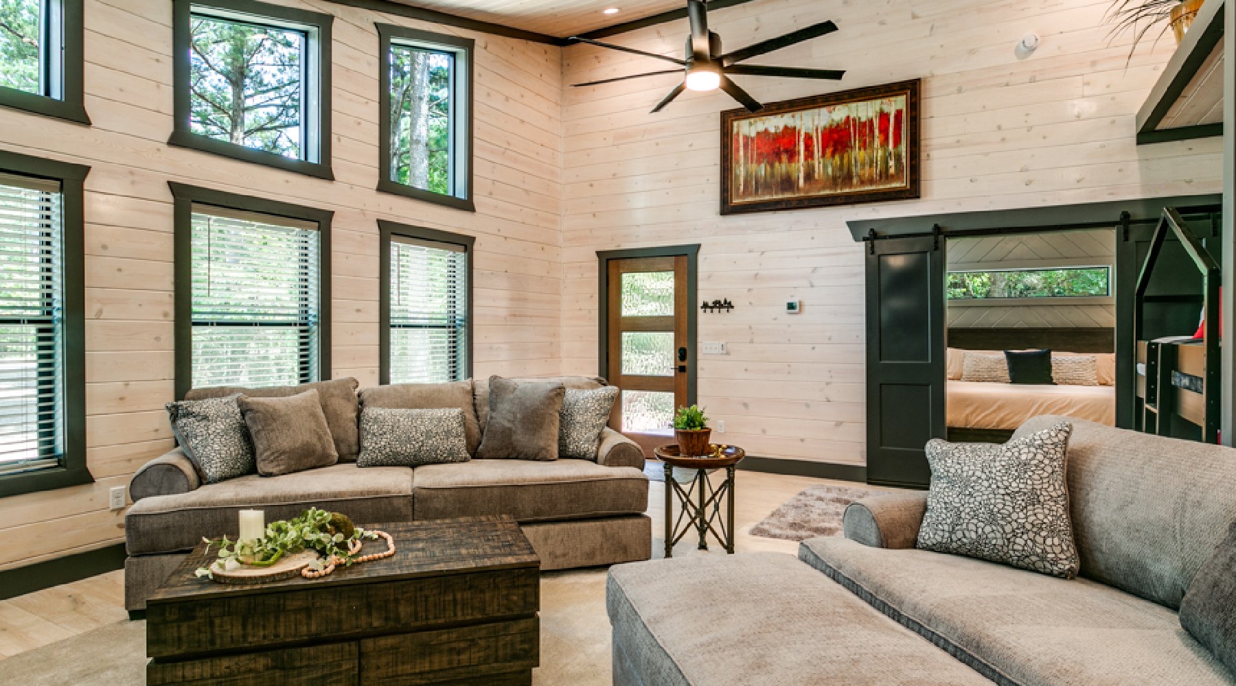 Sleeping arrangements in this beautiful cabin accommodate 2 adults in a king size bed located in the bedroom with the privacy of sliding barn doors, and a Queen sized sleeper sofa in the living room. Just outside the barn doors there are a handsomely designed set of bunk beds (small twin mattresses) that will accommodate 2 children. The bedroom has a chest of drawers and 2 nightstands for storage of personal items. There are hangers available for hanging garments on a pipe design fixture. Fall asleep watching your favorite show on the Smart TV with streaming capability mounted to the wall.