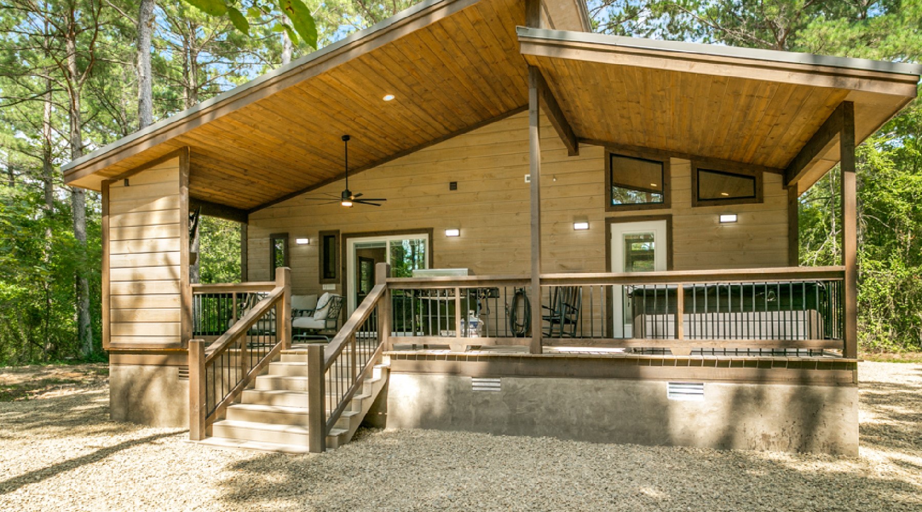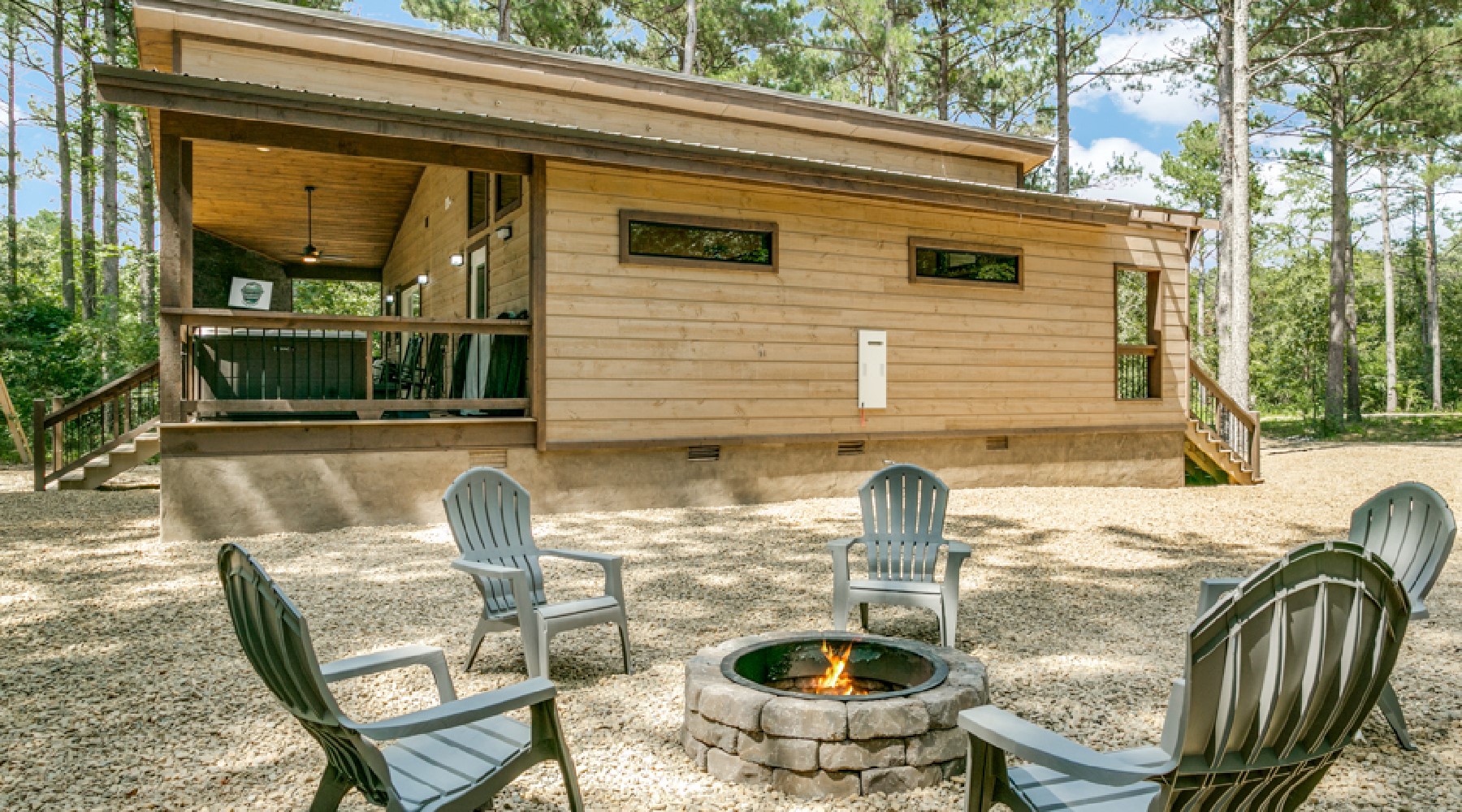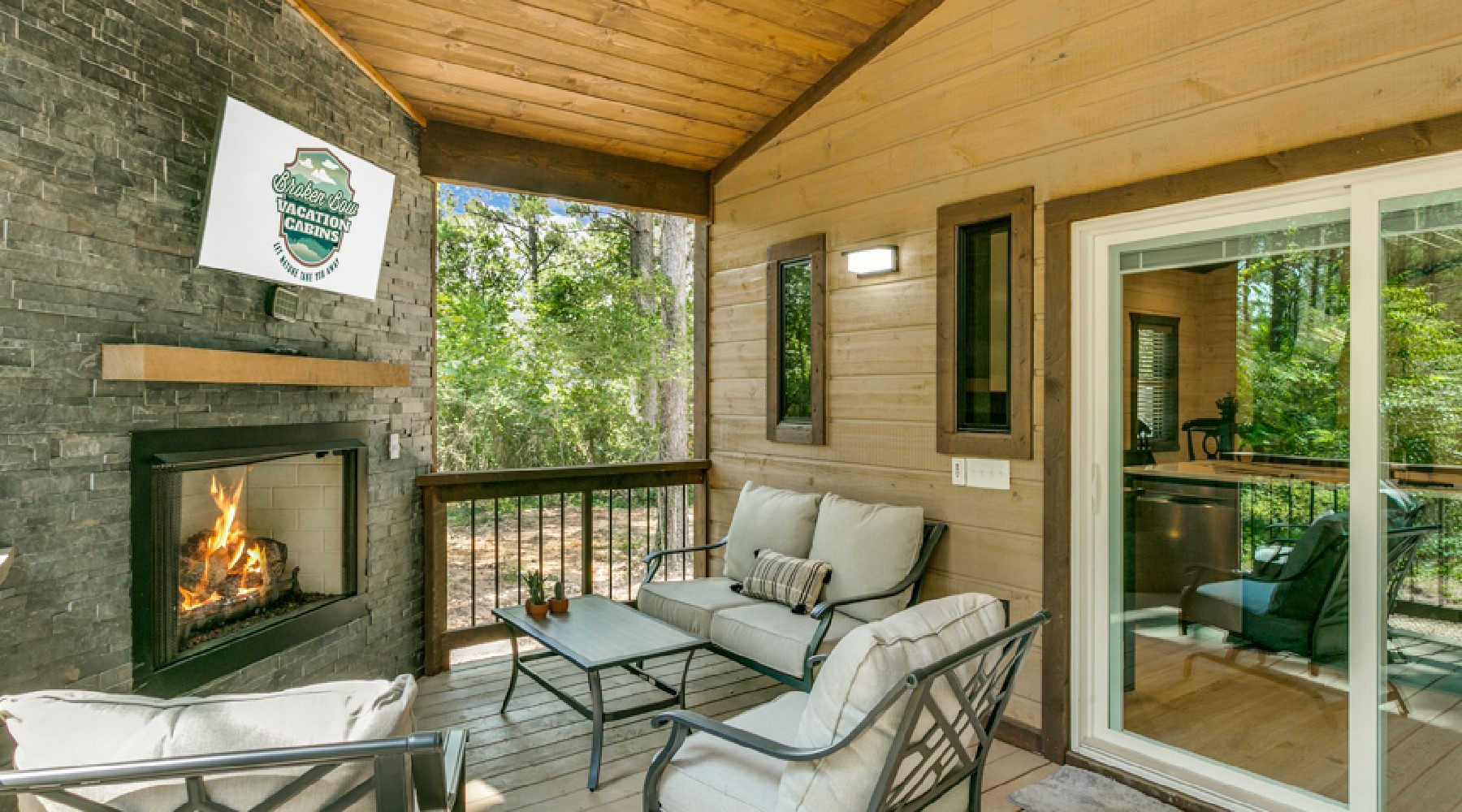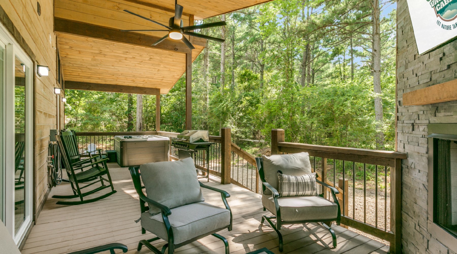 The back porch area can be accessed from either the master bathroom or the kitchen . On the back porch there is a seating area in front of another gas burning fireplace with easy on/off switch (seasonal October 15- April 15). Another Smart TV with streaming capability is mounted above this fireplace. There is a propane grill for outdoor cooking. The hot tub is located outside of the bedroom .