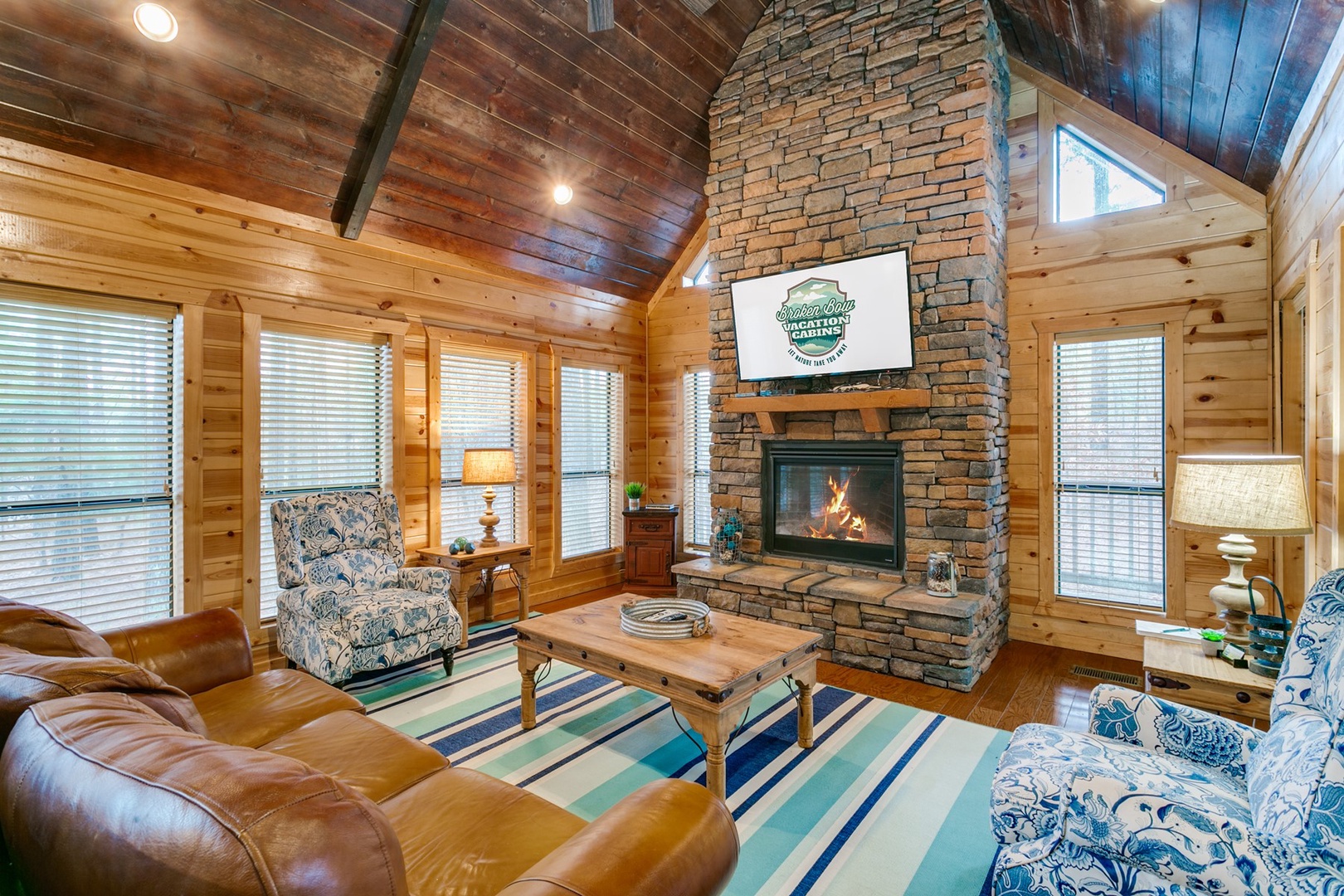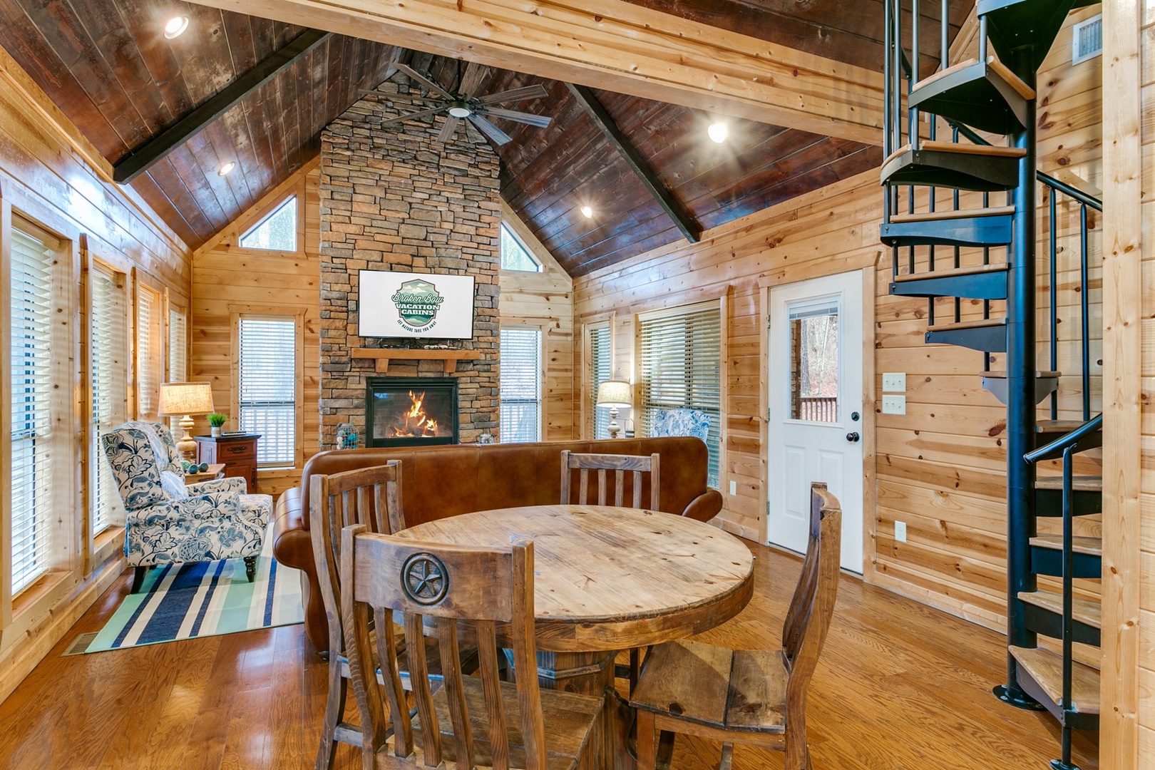 Dining table seating for four sits close by. The open floor plan has a roomy living area adjacent to the kitchen. A comfortable sofa with two wingback chairs adorns the gas burning fireplace (seasonal October 15th- April 15th). The large TV with DirecTV package is mounted over the gas burning fireplace.