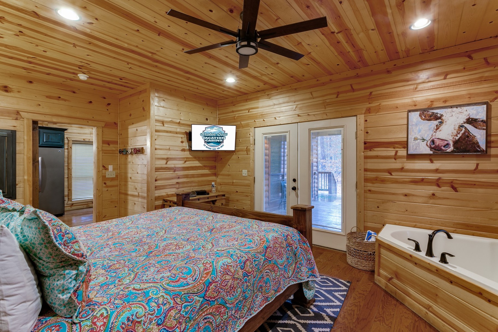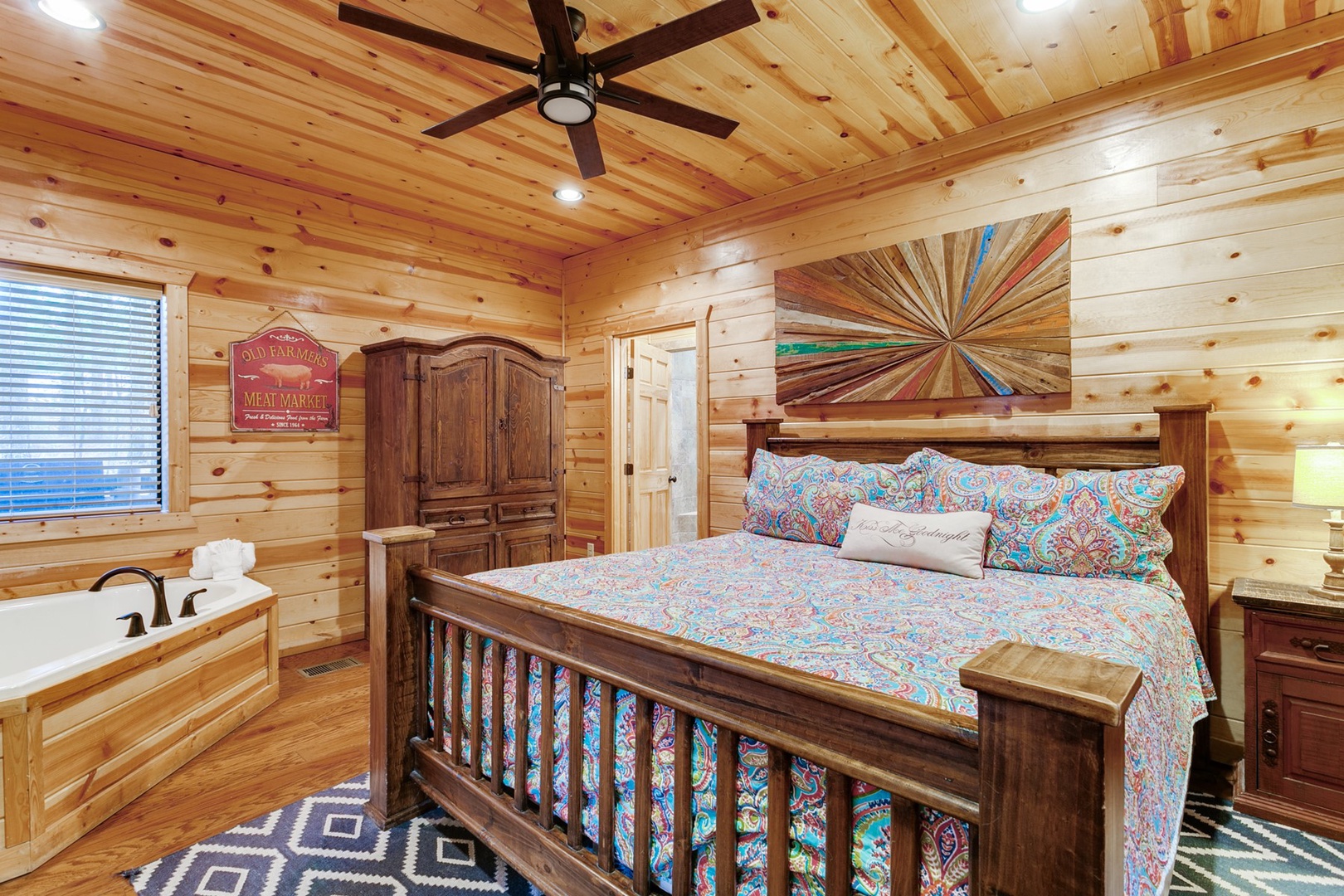 The bedroom is separated from the kitchen by a sliding barn door. The bedroom features a honeymoon corner garden tub at the foot of the king size bed. Luxury linens wrap the mattress. An armoire is provided for storage of clothes and personal belongings. The TV mounted in the corner has a DirecTV package (PPV not provided). The bathroom is off the bedroom with a walk-in tile shower and single vanity with ample counter space.
