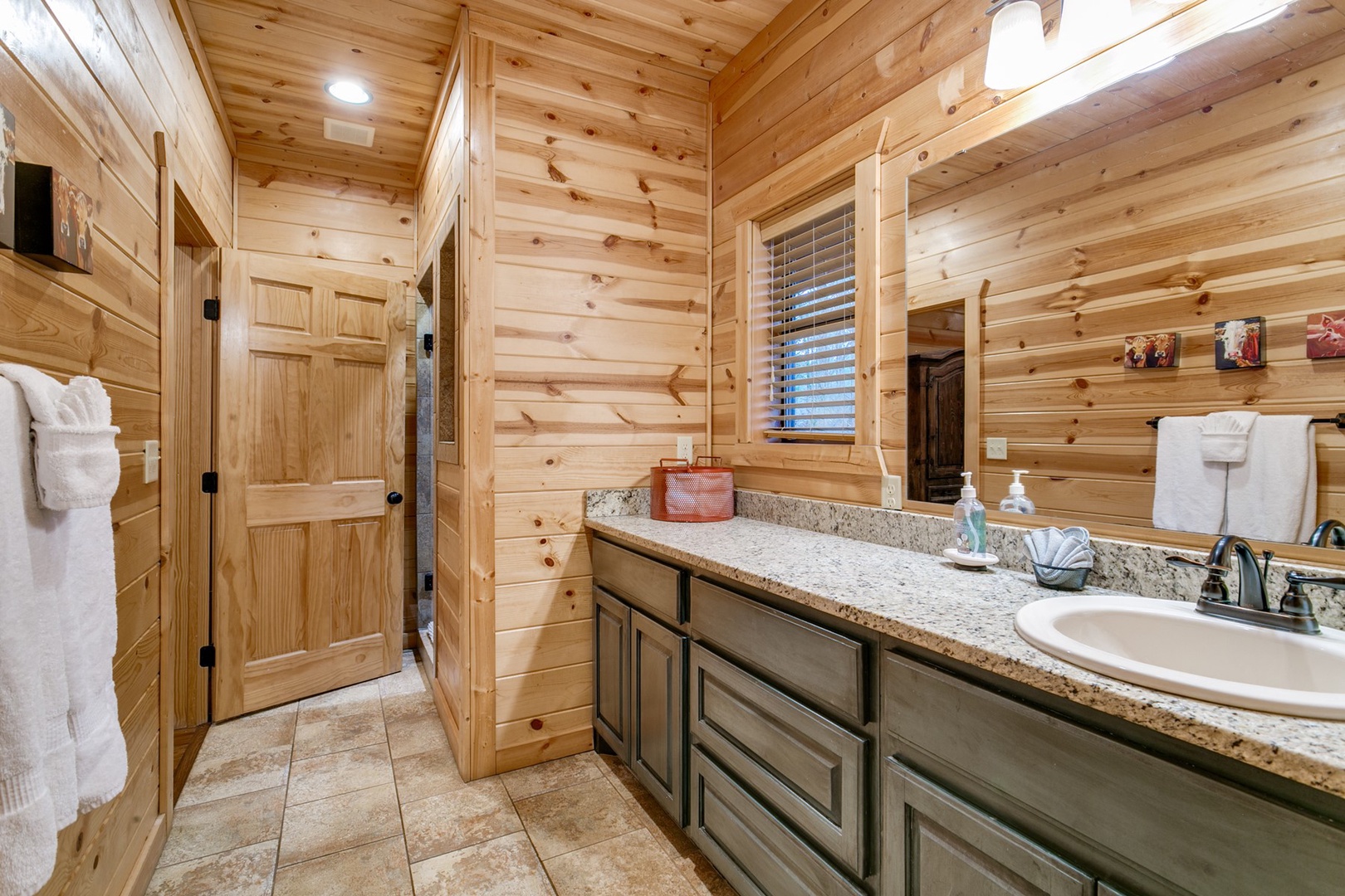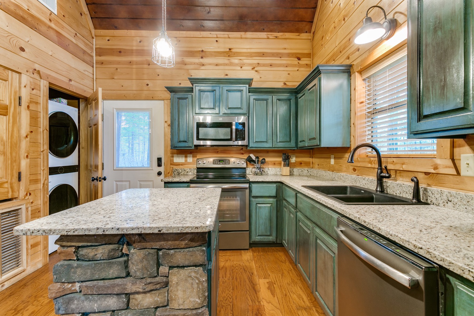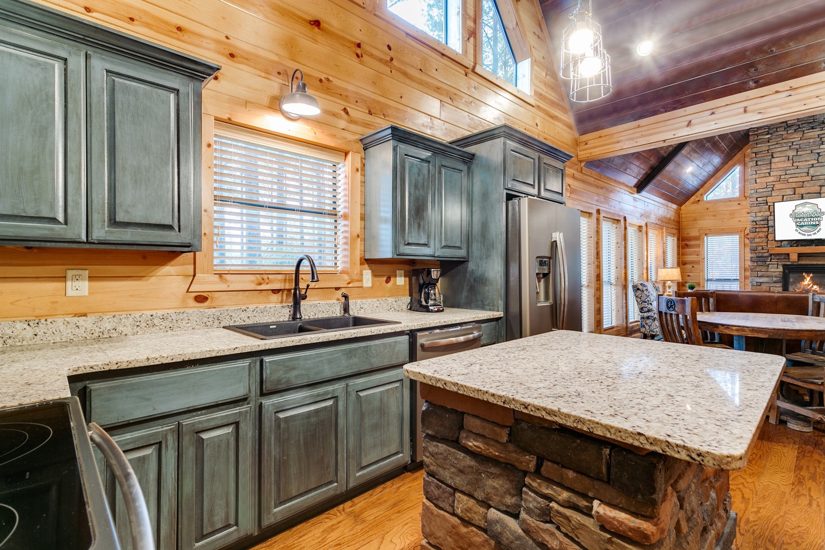 Walk up the stairs to the front porch that continues around the side of the cabin on the back deck with dining area and hot tub. Enter into the cabin’s kitchen with center island providing space for meal preparation. State of art appliances of glass cooktop/oven, side-by-side refrigerator, microwave and dishwasher make this kitchen a dream to cook in. Small appliances of toaster, blender, crock pot, hand-mixer and automatic drip coffee pot (filters and coffee provided) are stocked in the cabinets. Dinnerware, cookware, bakeware and utensils are also stocked.