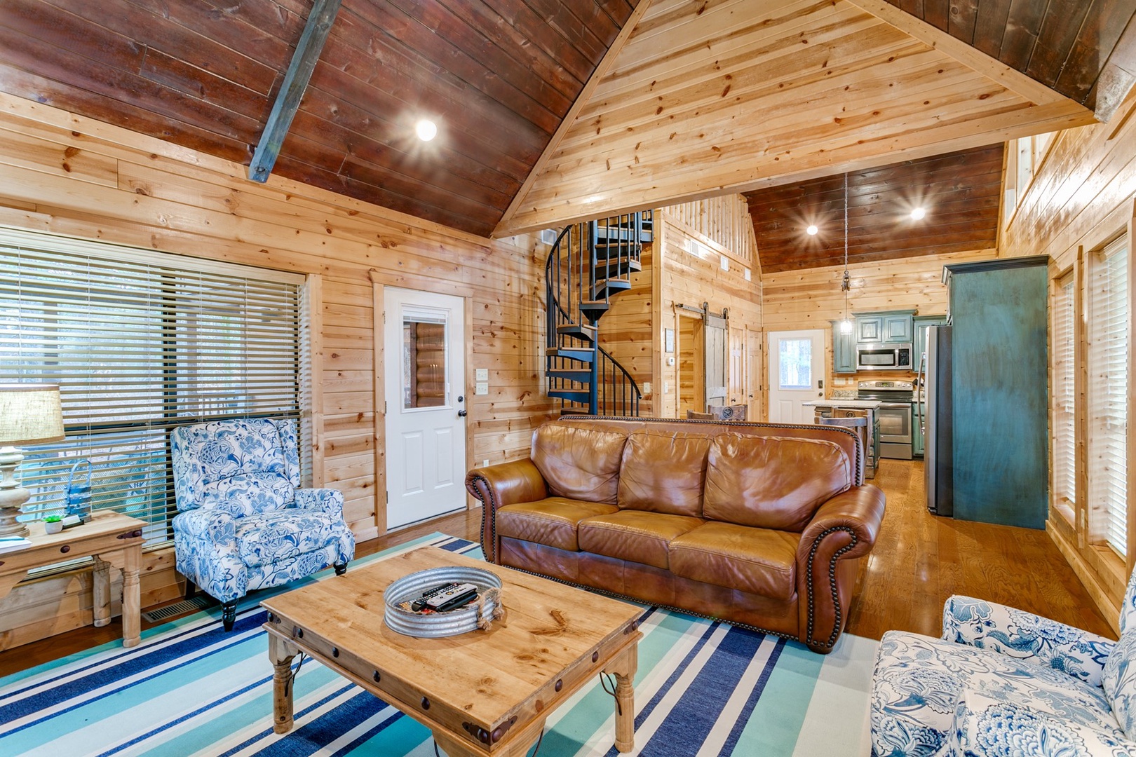 A spiral staircase leads to a loft area with futon sleeper and TV -no DirecTV upstairs. A laundry closet in the kitchen houses a stack washer and dryer.