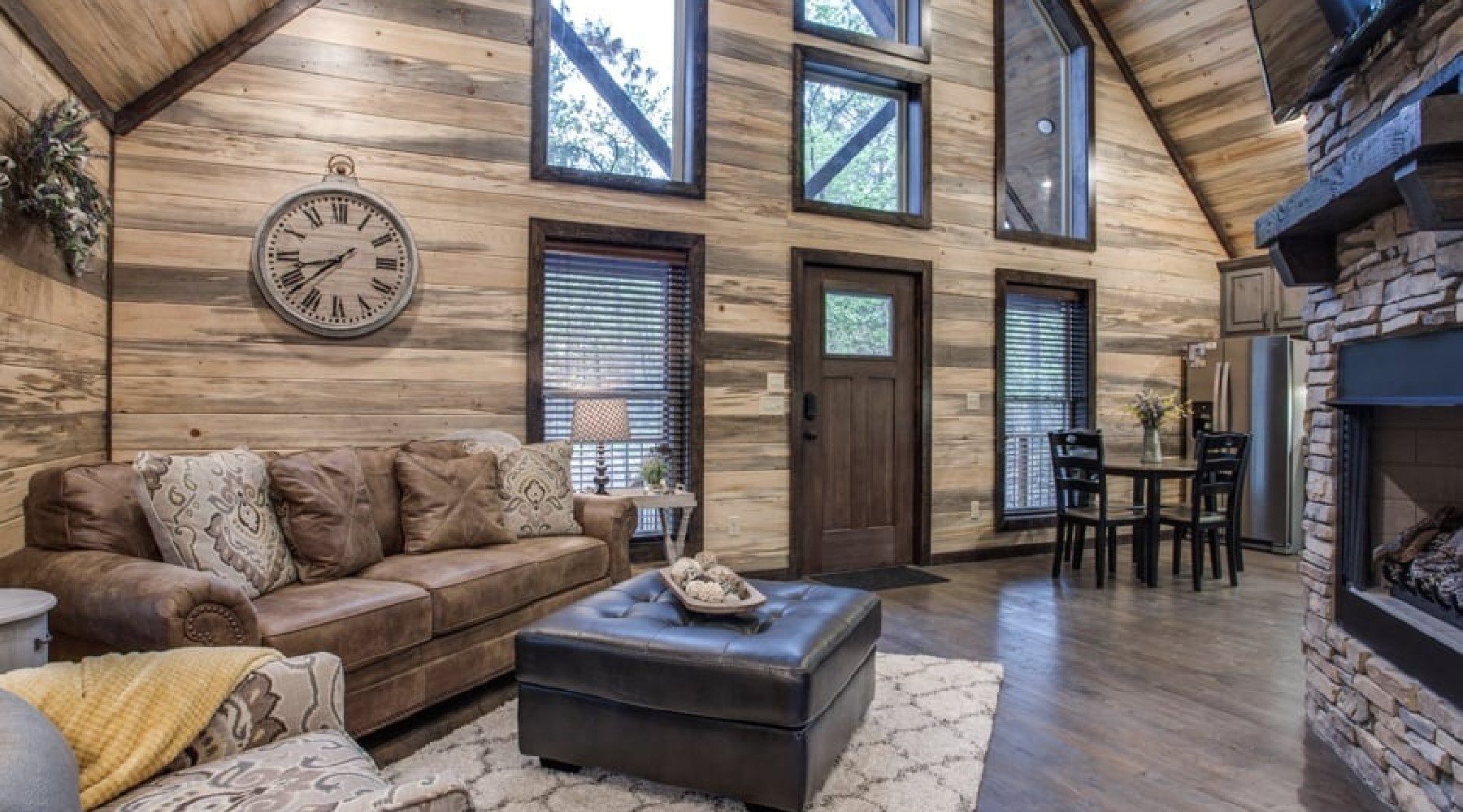 The front door brings you into the Living area with ample seating in front of a gas burning fireplace (seasonal October 15th – April 15th) with floor to ceiling rock hearth. The leather sofa converts to a queen sleeper to accommodate 2 guests. A 50’HDTV with DirecTV package (PPV not available) is mounted above the hearth. The fireplace has an easy start thermostat. To the left of the living area is the Kitchen with full size appliances of glass-top range/oven, microwave, dishwasher and refrigerator. The cabinets are stocked with skillets, pots & pans, utensils, plates and glassware to prepare and enjoy meals at the cabin. There is a dining table with seating for 4 in this area as well.