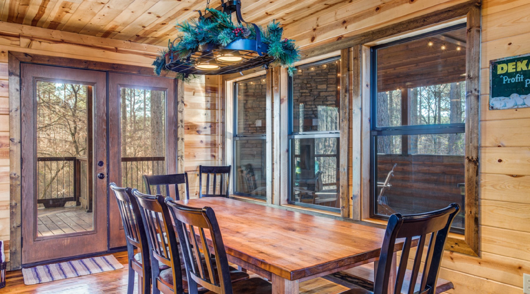 The minute you enter this cabin from the spacious front porch, you will feel relaxed and at home. The openness of this cabin engages everyone. The living room has ample seating with a comfortable leather couch and cozy chair. The rock fireplace lights with the flip of a switch (seasonal October 15th – April 15th). Enjoy a movie or watch the game on the big streaming TV