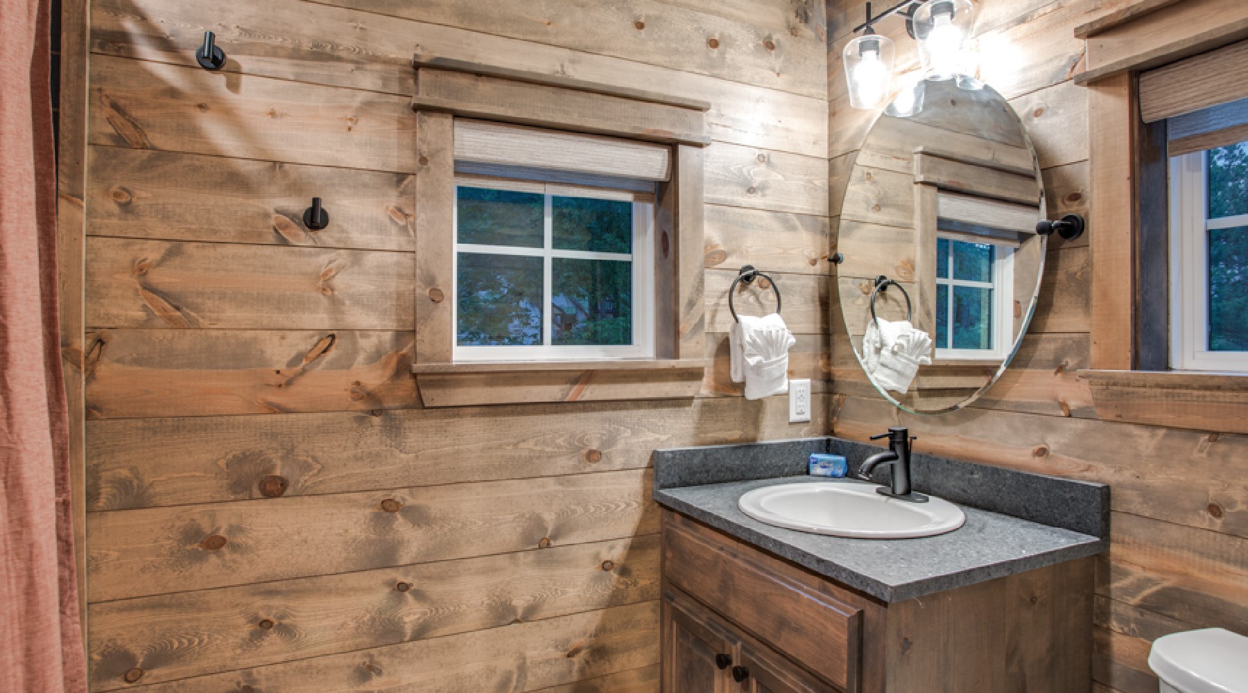 The Barn At Broken Bow has a fully equipped kitchen with stainless steel appliances. These include side by side refrigerator, dishwasher, glass top range/oven, microwave and a double bay stainless steel sink. The cabinets are stocked with dishes, eating utensils, glasses, pots and pans, bakeware, cooking utensils, a K-cup (pods not provided) and regular automatic coffee pot (coffee and filters provided). Seating for dining can be accommodated at the island bar with stools for six. There is a powder room off of the kitchen.