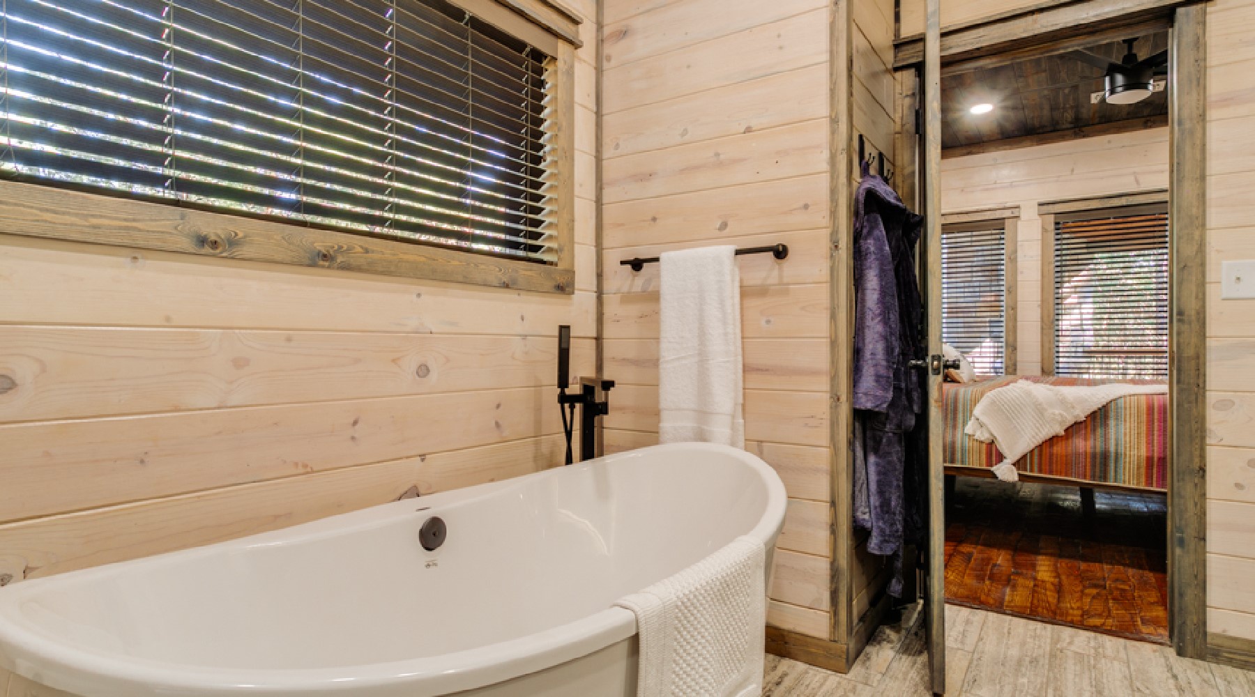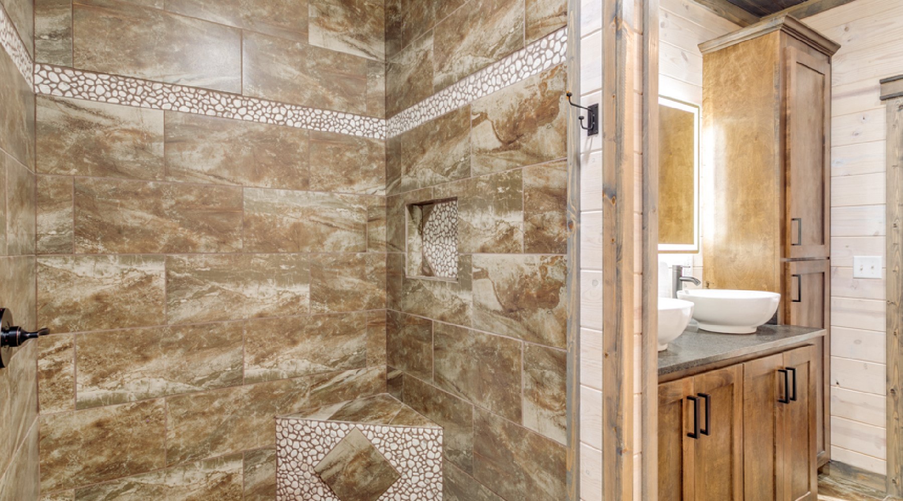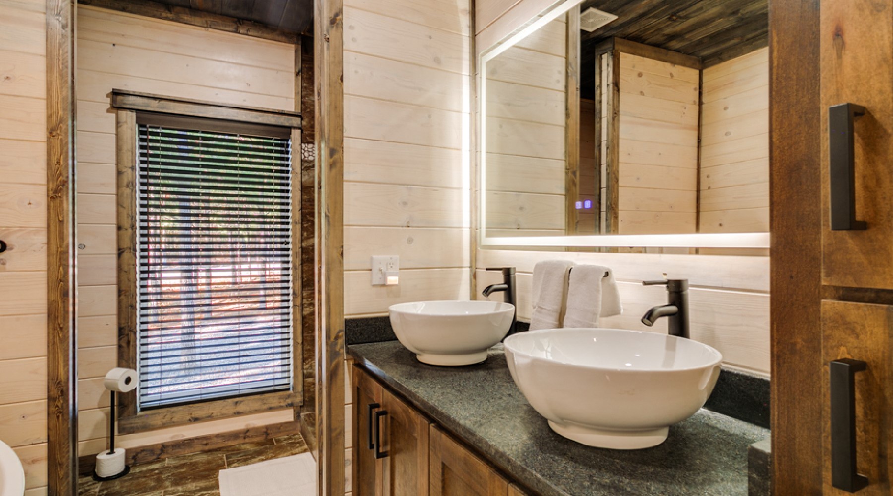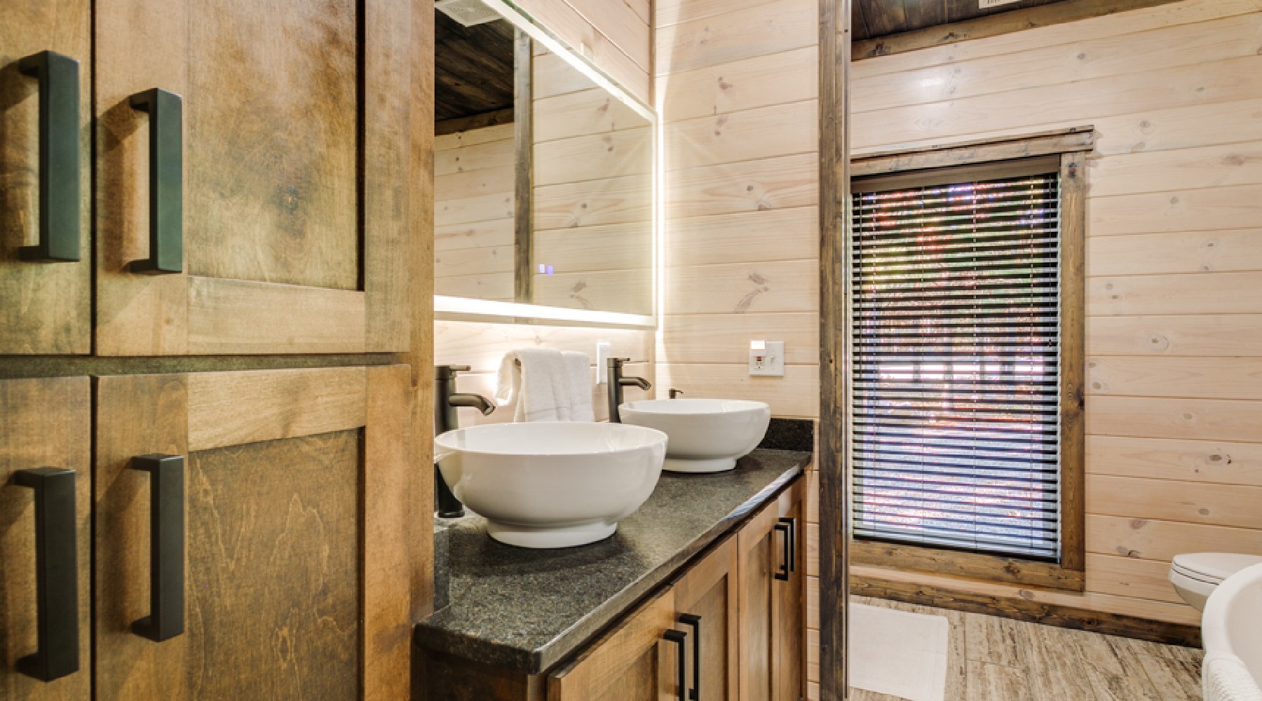 There are two king bed suites downstairs. Each has closet for personal storage, a TV and attached bathroom. The bathroom has double vanity, soak tub and large walk-in tile shower with rain head.
