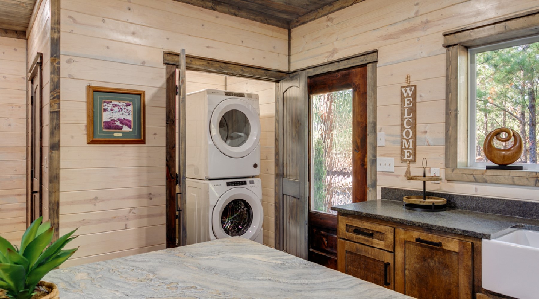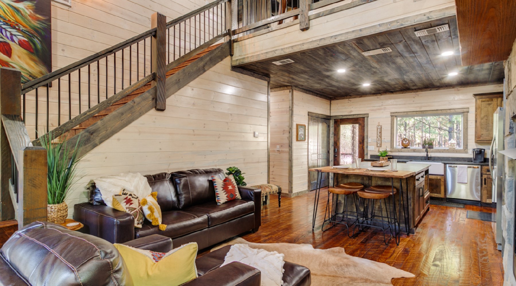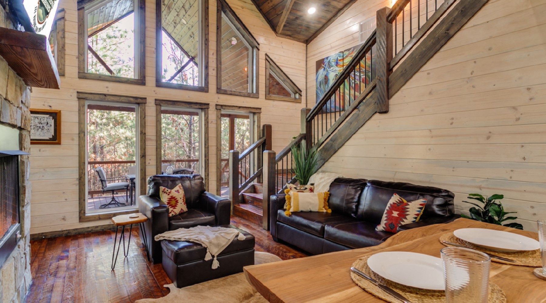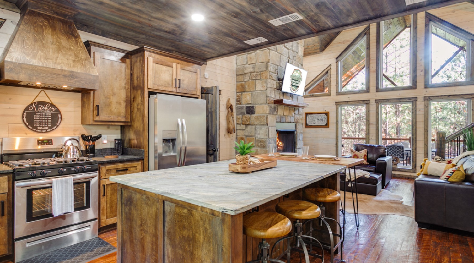 The Painted Pony is a three-bedroom cabin that accommodates up to 8 guests. The cozy living area offers comfortable seating in front of a gas log fireplace (seasonal October-April) and large floor to ceiling windows that bring the beautiful pine forest indoors. The kitchen has stainless appliances of double-door refrigerator and dishwasher; a gas cooktop range/oven and microwave. The cabinets are stocked with cookware, bakeware, dinnerware and utensils. There are small appliances of blender, mixer, and crockpot. Enjoy a single cup of coffee from the K-cup coffee maker (K-cups not provided) or make a full carafe in the 12-cup pot (filters and coffee provided).