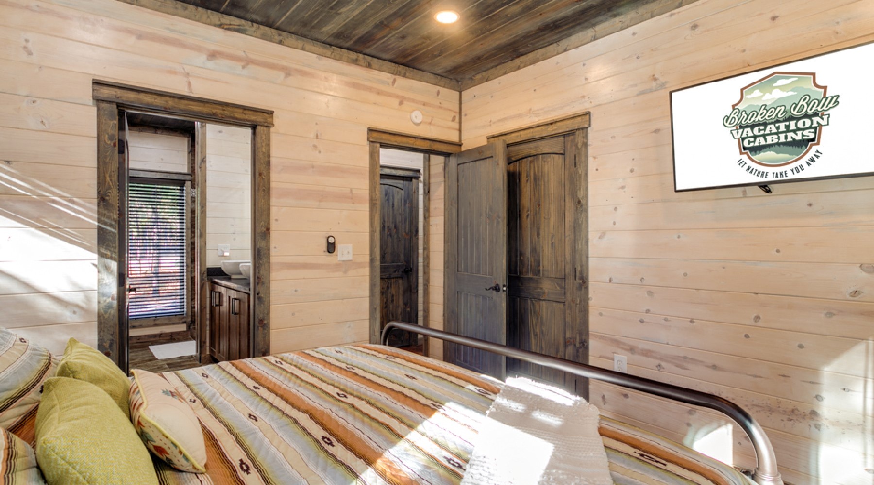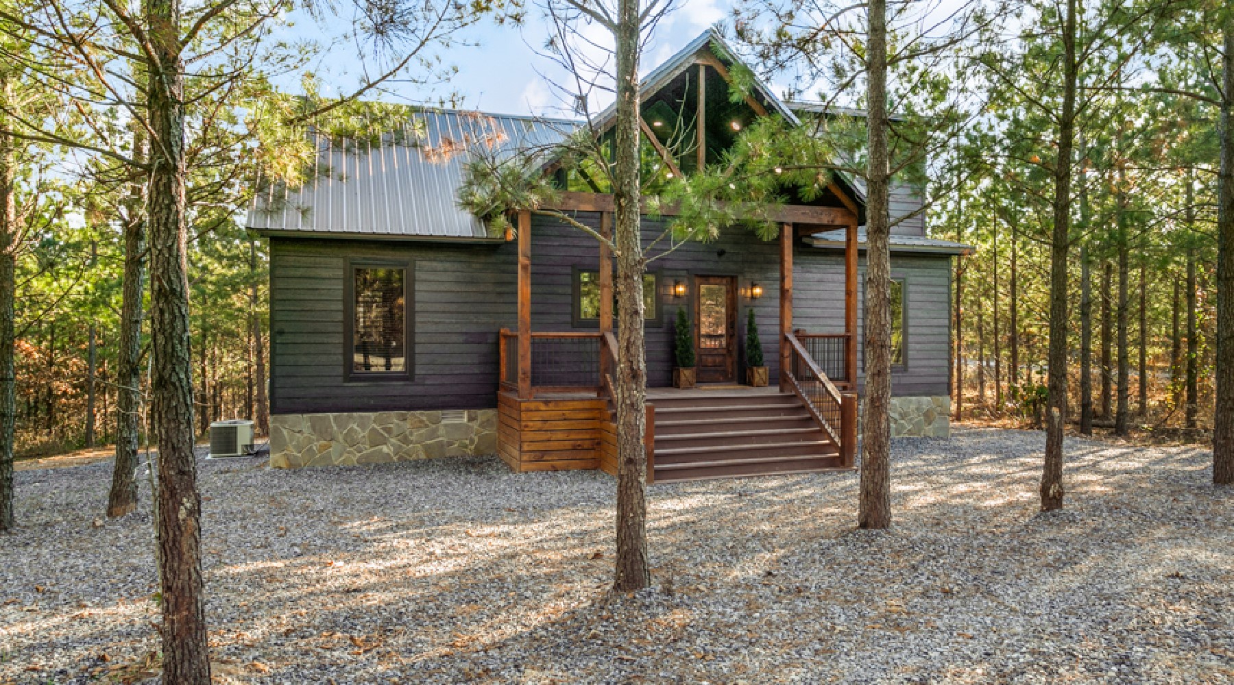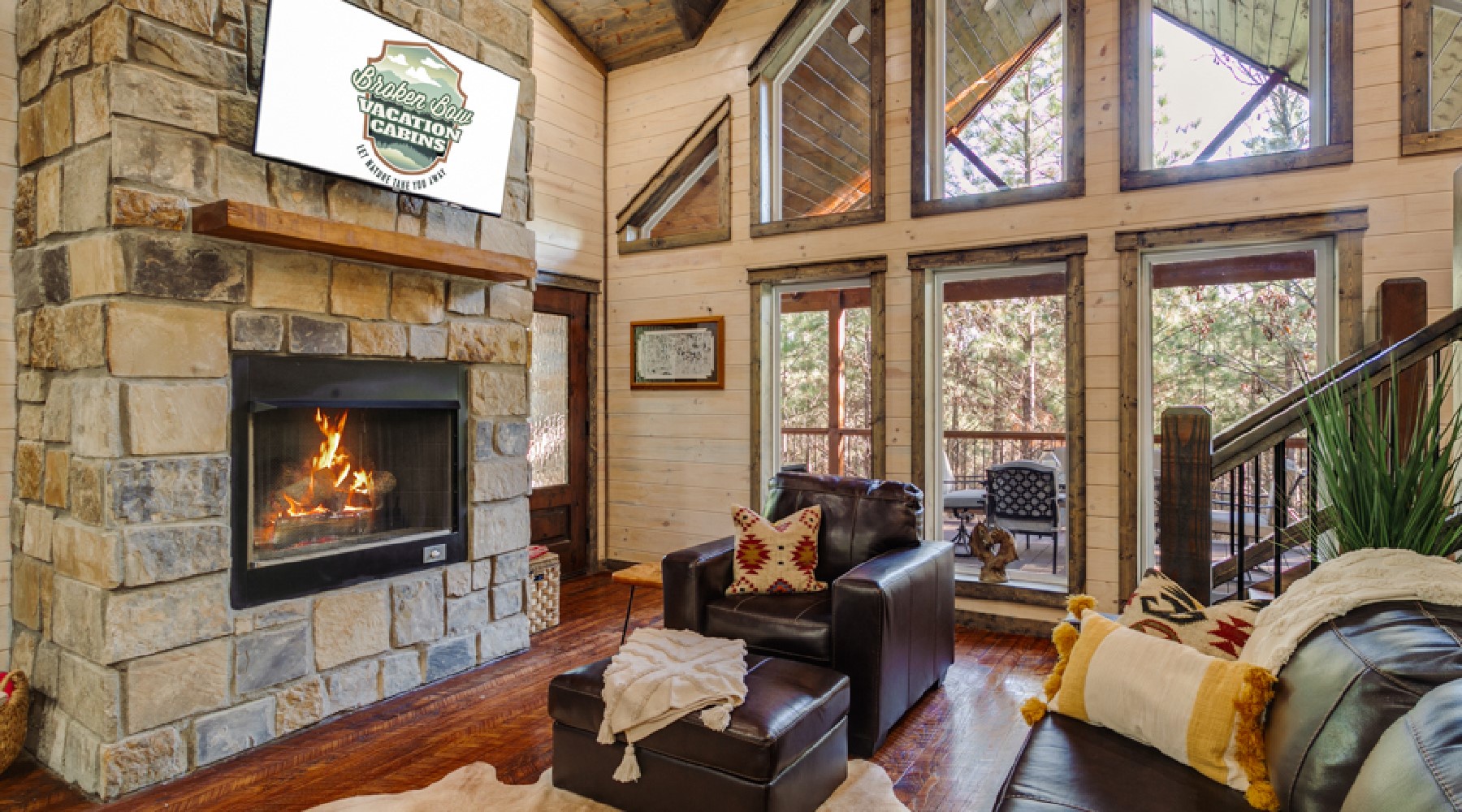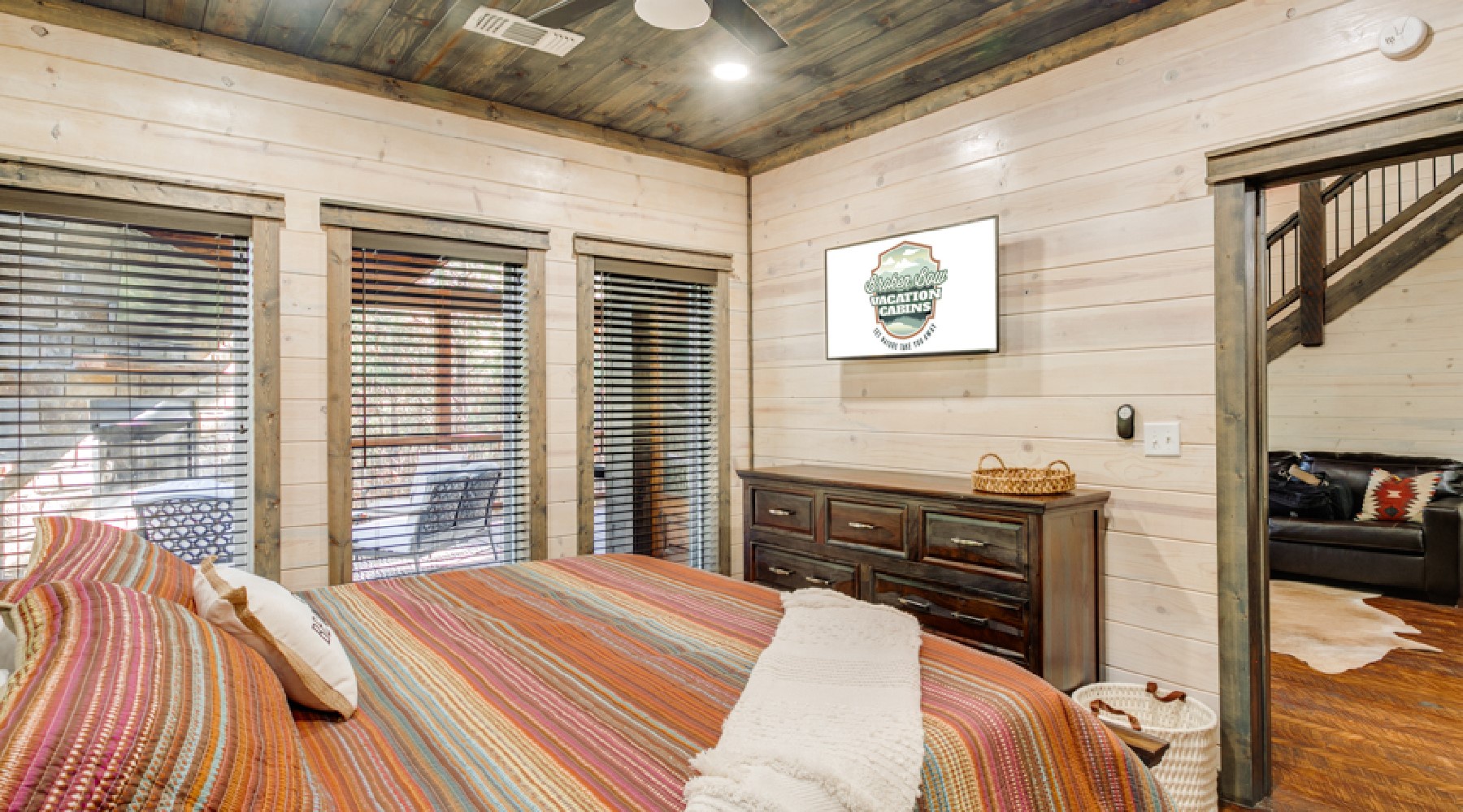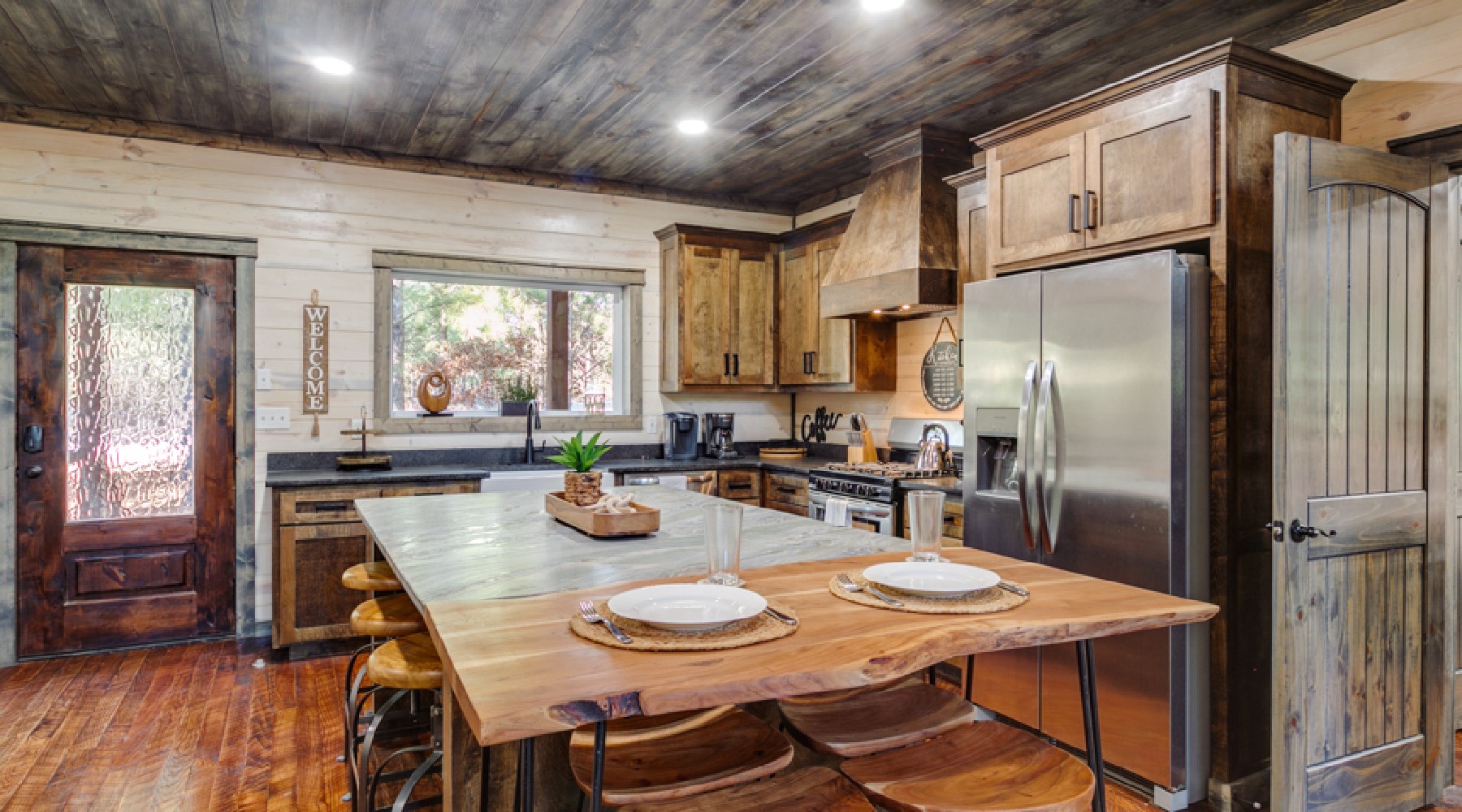 The Painted Pony is a three-bedroom cabin that accommodates up to 8 guests. The cozy living area offers comfortable seating in front of a gas log fireplace (seasonal October-April) and large floor to ceiling windows that bring the beautiful pine forest indoors. The kitchen has stainless appliances of double-door refrigerator and dishwasher; a gas cooktop range/oven and microwave. The cabinets are stocked with cookware, bakeware, dinnerware and utensils. There are small appliances of blender, mixer, and crockpot. Enjoy a single cup of coffee from the K-cup coffee maker (K-cups not provided) or make a full carafe in the 12-cup pot (filters and coffee provided).