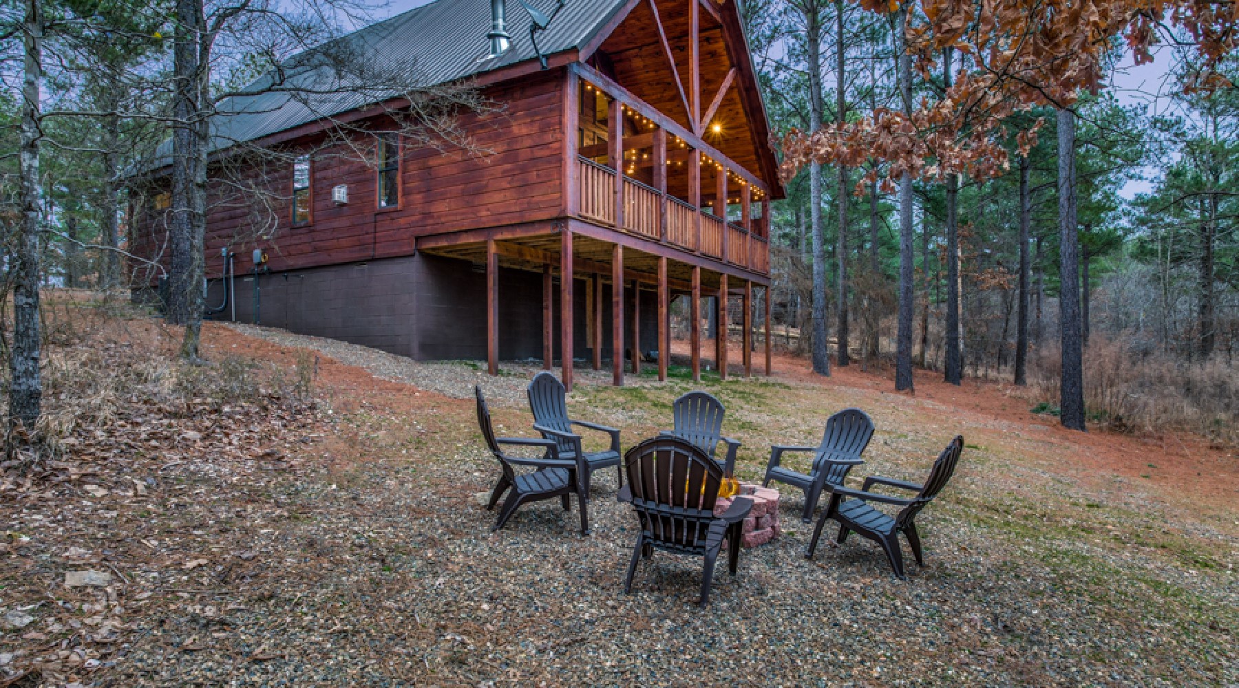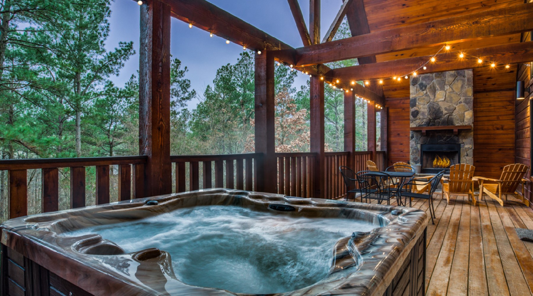 Out the backdoor, the deck area has seating in front of the wood burning fireplace, a dining table that seats 4, a gas grill (propane provided) and a hot tub nestled in the corner. On the gravel grounds there is a circular firepit for roasting marshmallows under the stars.