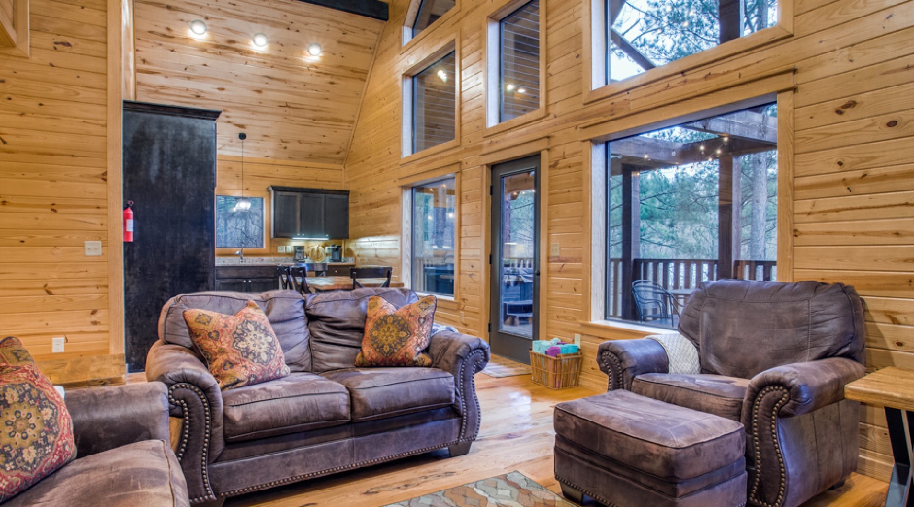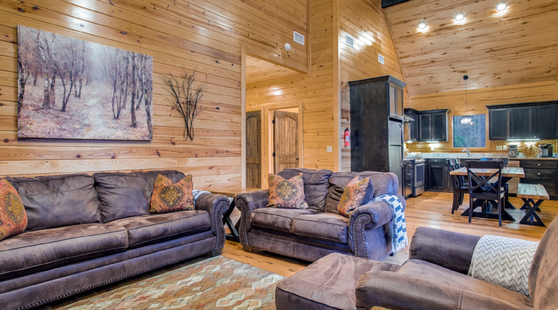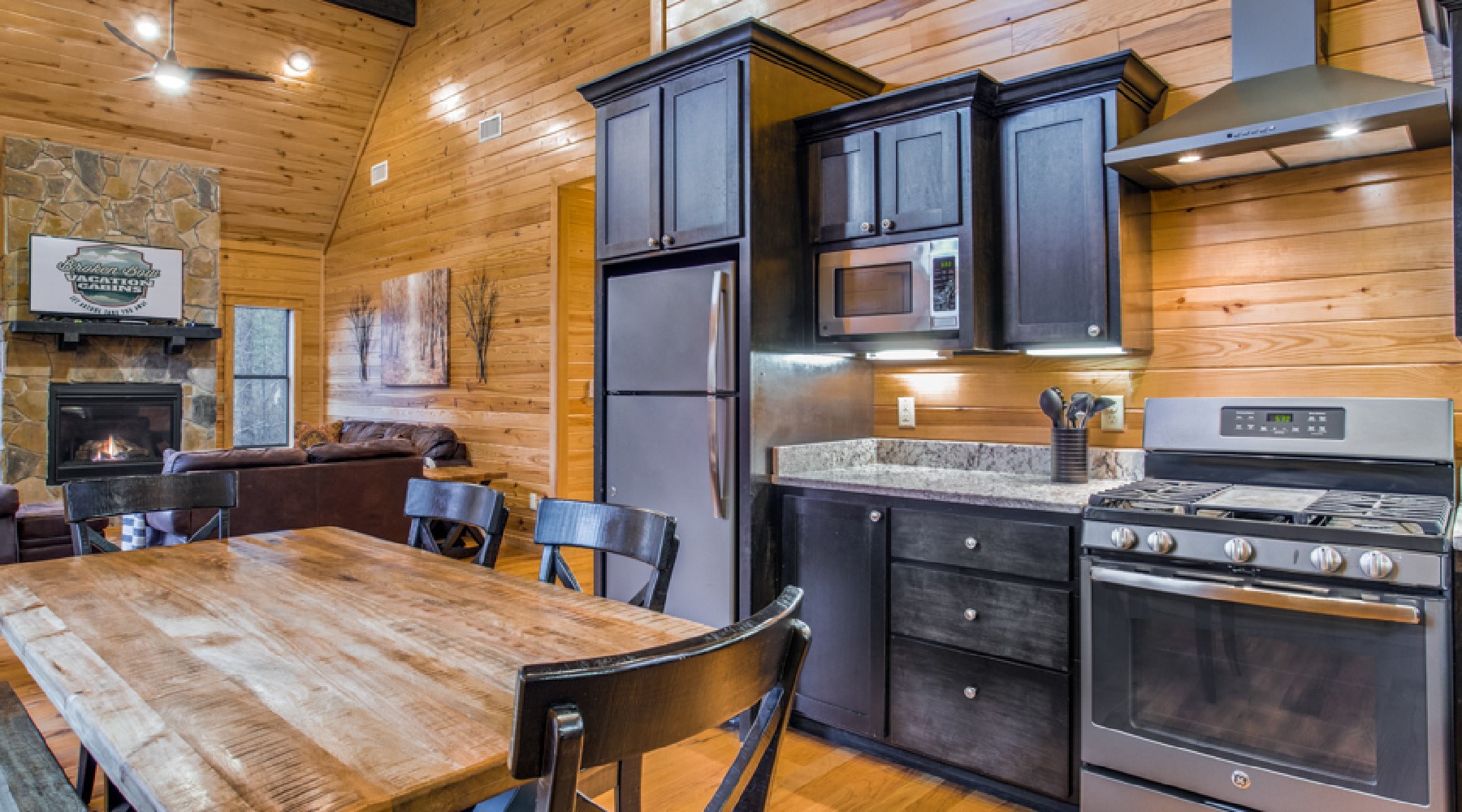 At the end of the hallway, you arrive at the open living area and kitchen. The living area has leather seating with sofa and club chairs in front of a natural rock hearth with gas burning fireplace (seasonal October-April). The sofa converts to a queen sleeper. Large grid-free windows bring the outdoors in for enjoyment of the trees in all of the different seasons.